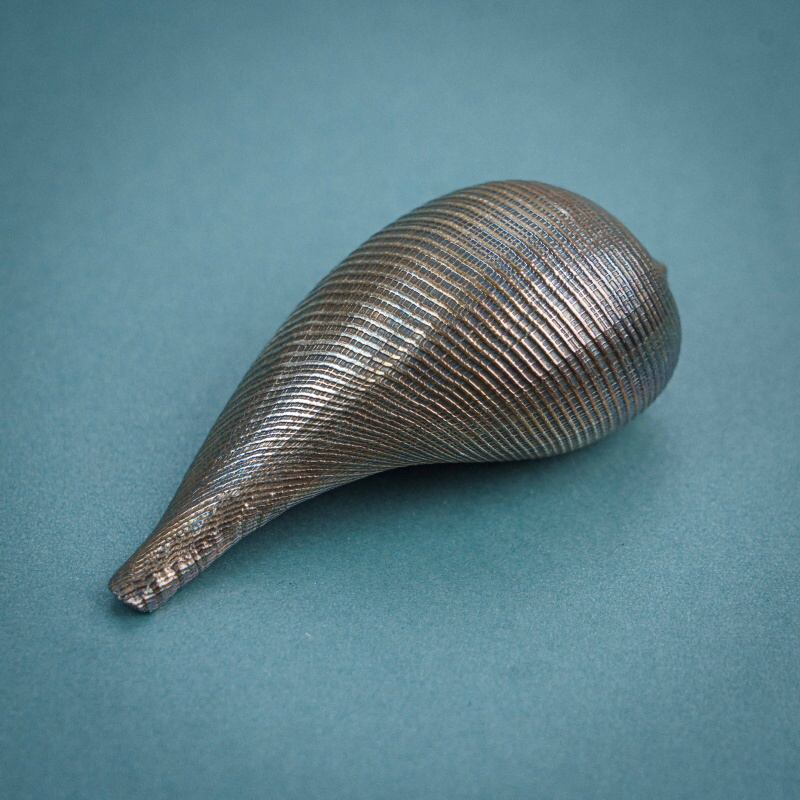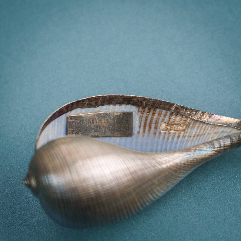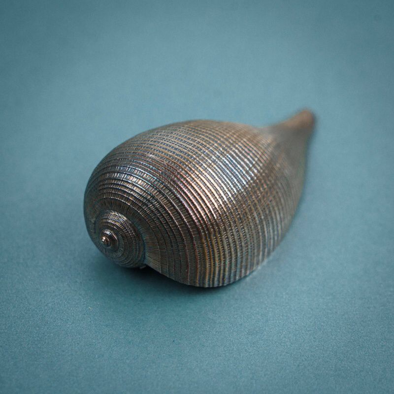 Декоративная раковина, в основе которой — настоящая морская раковина, покрытая серебром. Мастер бережно сохраняет ее природную форму, лишь подчеркивая рельеф: поверхность остается живой, с характерной пластикой морского происхождения.