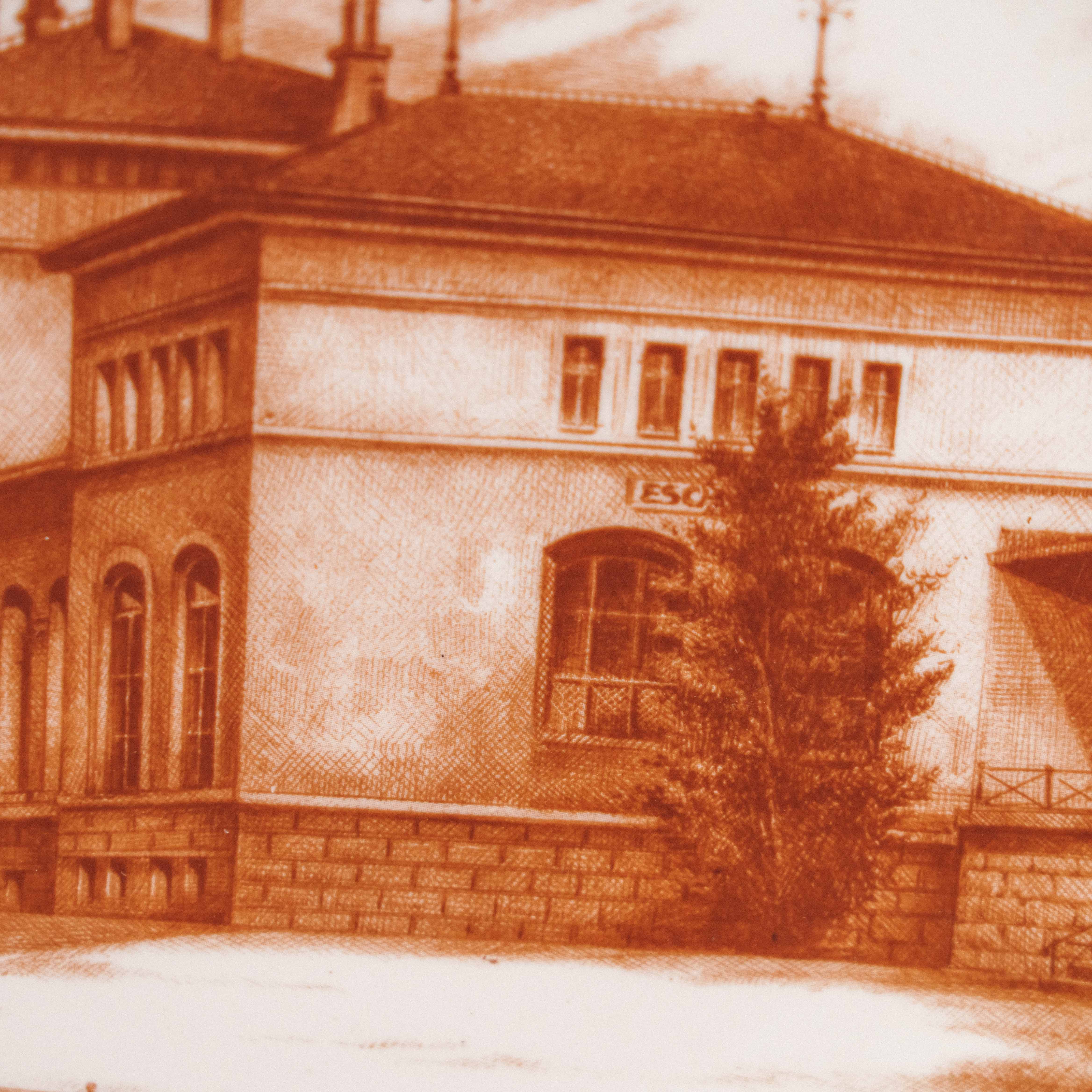 Коллекционная декоративная тарелка мануфактуры Villeroy & Boch из серии Les Cheminots Philatélistes, посвящённой истории европейских железных дорог. На тарелке изображено здание вокзала Эш-сюр-Альзетт (Esch-sur-Alzette) — один из характерных архитектурных памятников конца XIX – начала XX века, выполненный в стиле эклектики с элементами неоренессанса. Тёплая сепийная гамма придаёт композиции ощущение старинной гравюры и создаёт эффект путешествия во времени. Детальная прорисовка фасадов, окон, кровли и окружающего ландшафта подчёркивает документальную точность и художественную выразительность сюжета.
