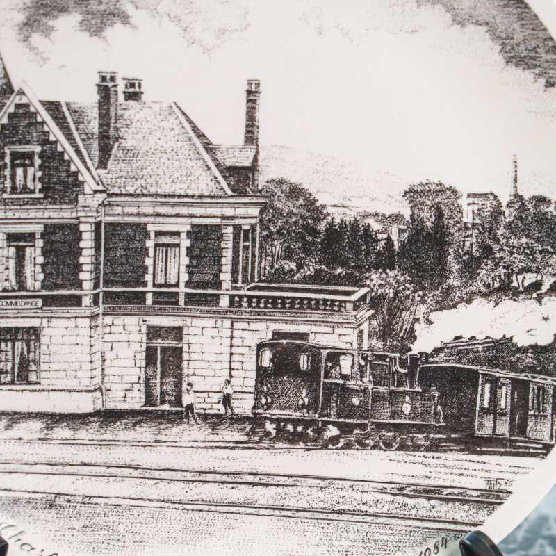 Коллекционная декоративная тарелка мануфактуры Villeroy & Boch из лимитированной серии. На лицевой стороне изображён исторический вокзал Dommeldange (1884) с паровозом, выполненный в стиле старинной гравюры. Тонкая графика передаёт атмосферу эпохи индустриального расцвета Европы и подчёркивает документальную ценность сюжета. Каждый экземпляр имеет индивидуальный номер — данный №168. Эффектный интерьерный акцент и редкий коллекционный предмет.