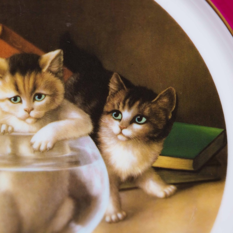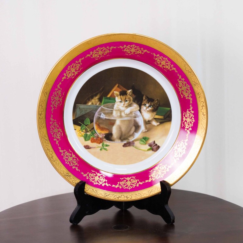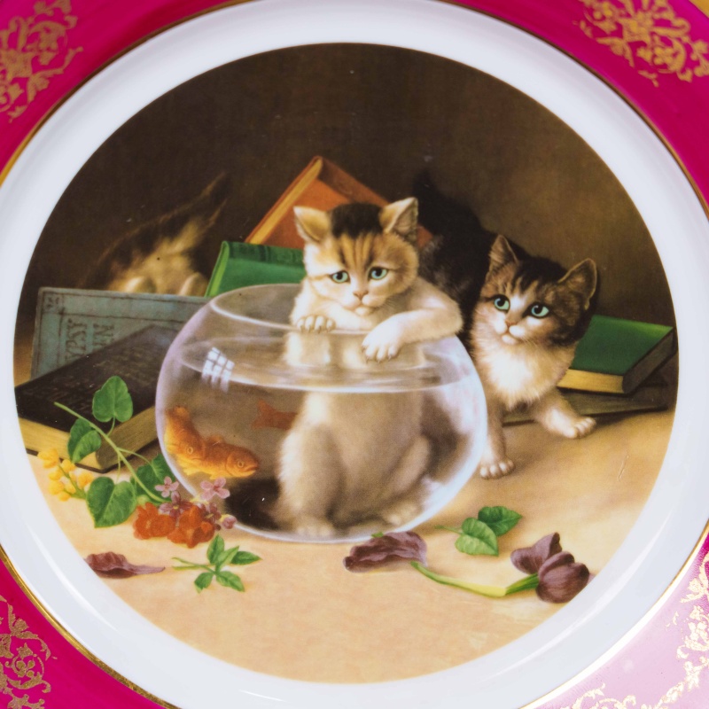 Декоративная фарфоровая тарелка с ярким малиновым бортом и богатым золотым орнаментом в классической европейской традиции. Контраст насыщенной фуксии и тёплого золота создаёт эффект торжественности и делает предмет выразительным интерьерным акцентом. В центре — трогательная жанровая сцена с котятами.