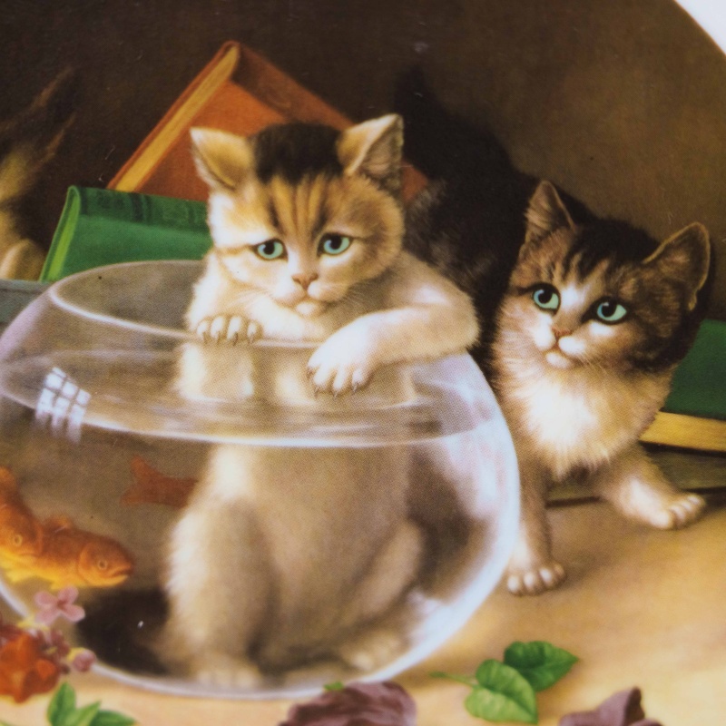 Один из них, преодолев осторожность, заглядывает в стеклянную чашу с золотыми рыбками, второй с интересом наблюдает со стороны. Мягкая живопись передаёт пушистую фактуру шерсти, прозрачность воды и блеск стекла, а рассыпанные лепестки и книги на фоне добавляют композиции уюта и камерности.