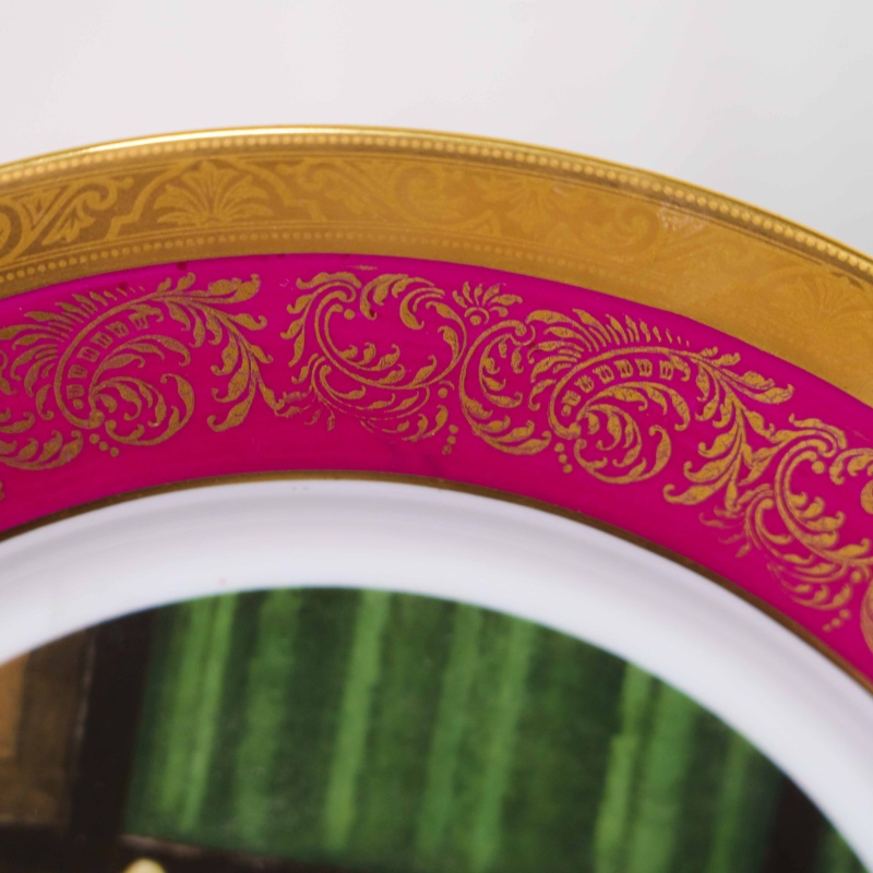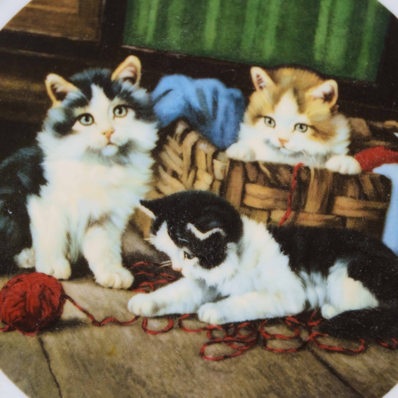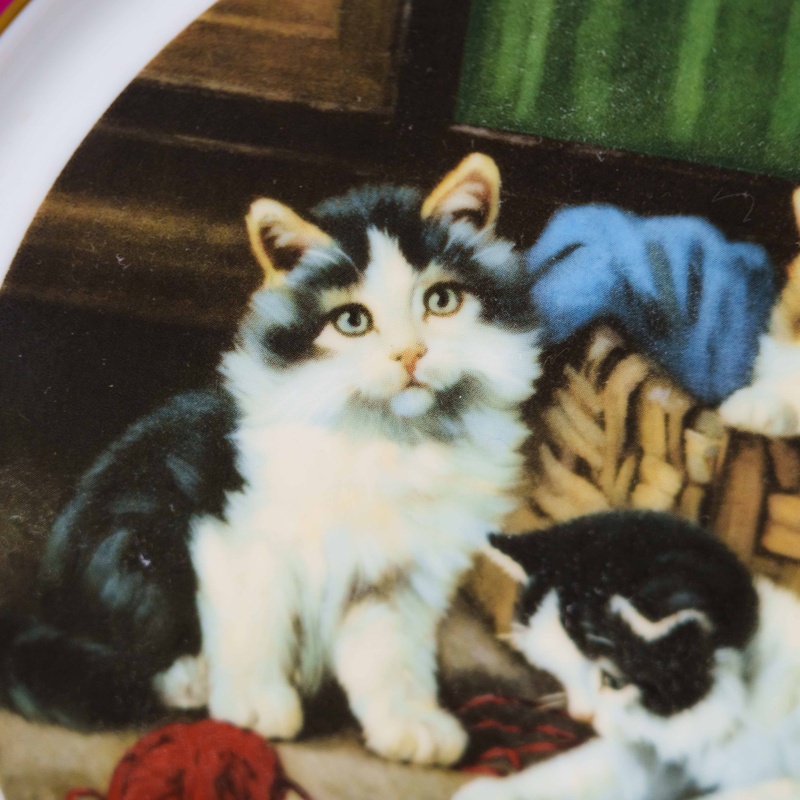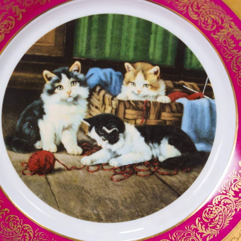 Декоративная фарфоровая тарелка Limoges, France с очаровательным жанровым сюжетом. Композиция построена на выразительном сочетании насыщенного малиново-розового борта и богатой позолоты. Широкий обод украшен изысканным орнаментом в виде золотых завитков и растительных мотивов, выполненных с тонкой прорисовкой. Край дополнен широкой матовой золотой каймой, придающей предмету парадность и глубину цвета. В центре — трогательная сцена с тремя котятами: двое внимательно наблюдают, а третий играет с клубком красной пряжи. Сюжет наполнен теплом и живостью, переданы пушистая фактура шерсти, мягкость света и уютная атмосфера интерьера. Центральная миниатюра отличается детальной проработкой и мягкими переходами оттенков.