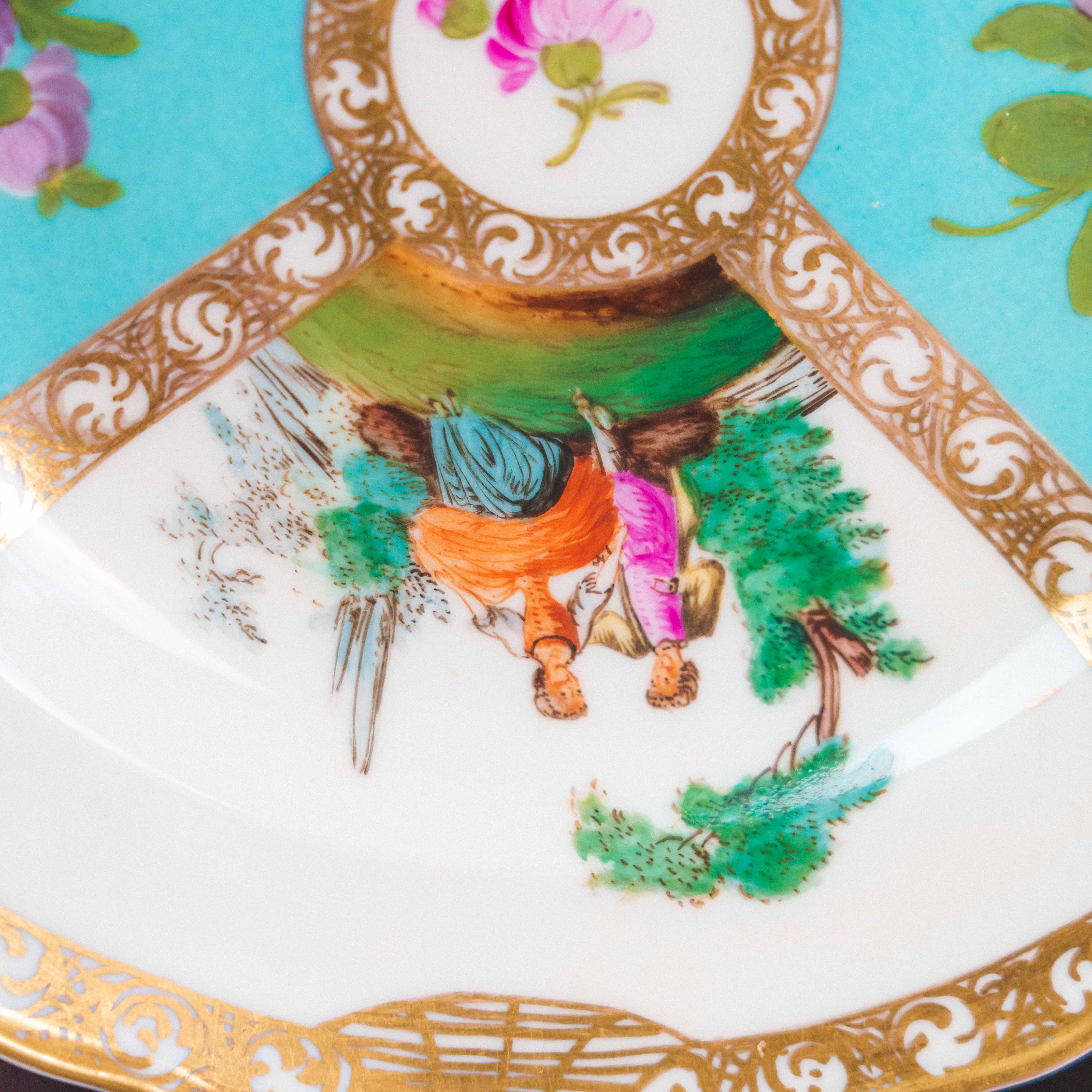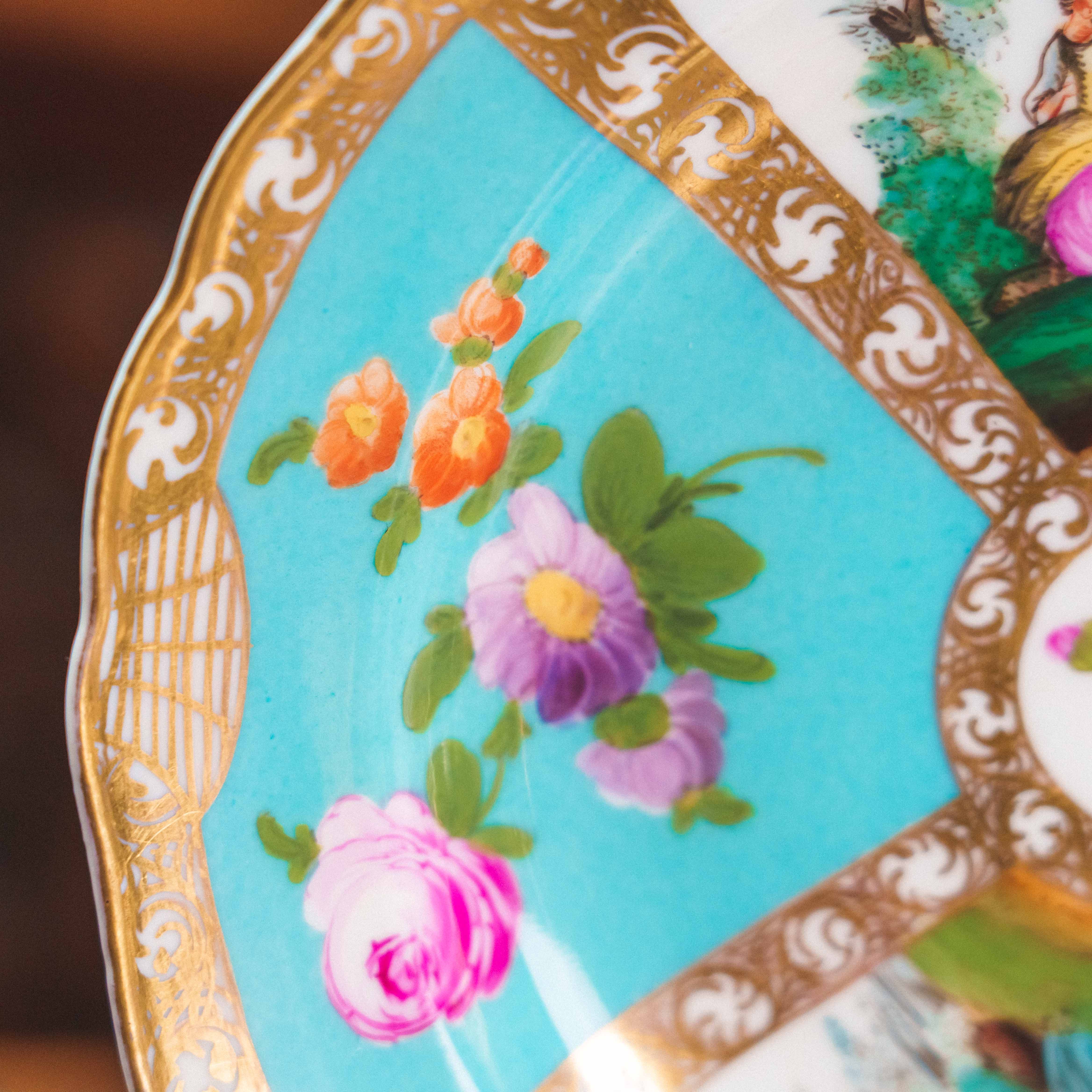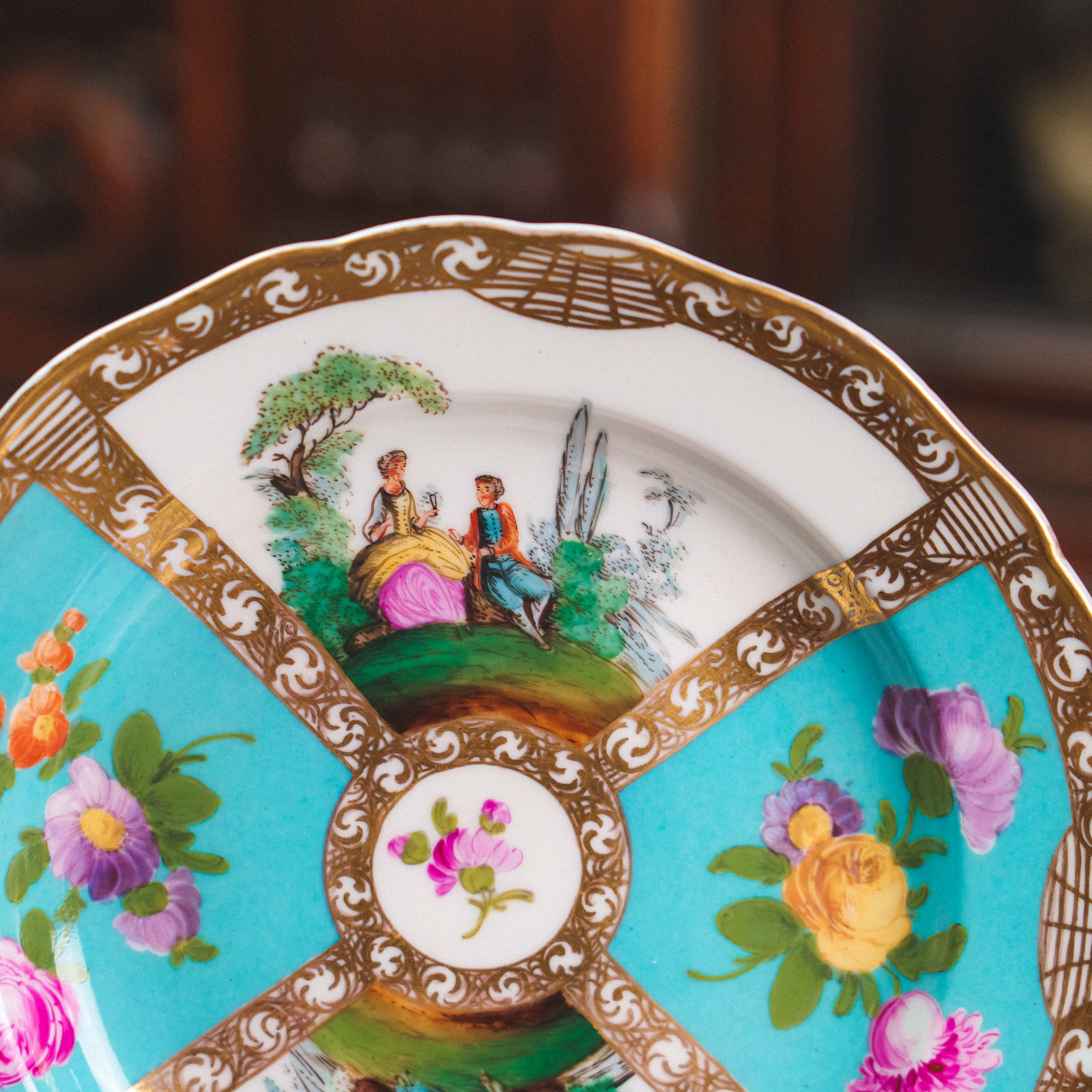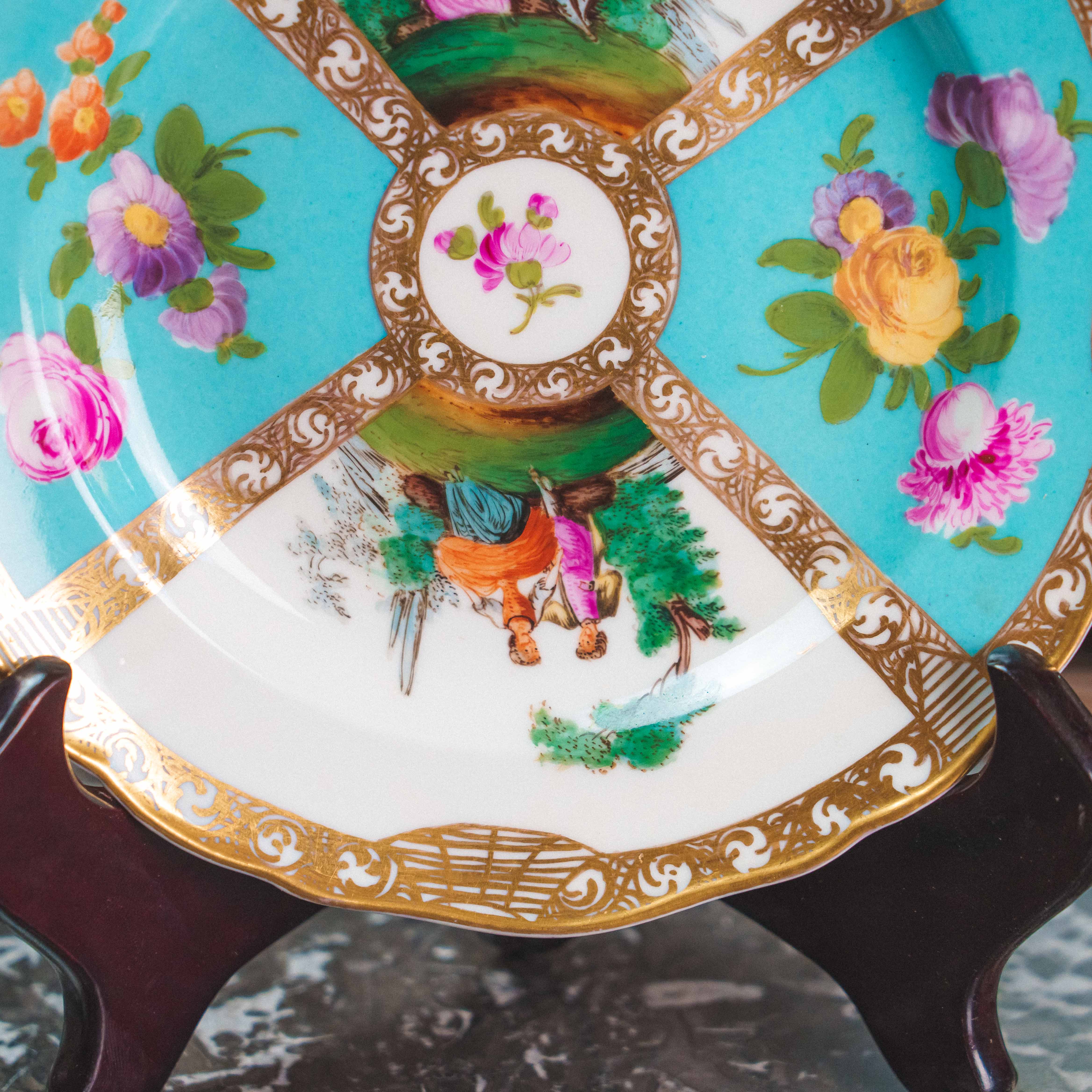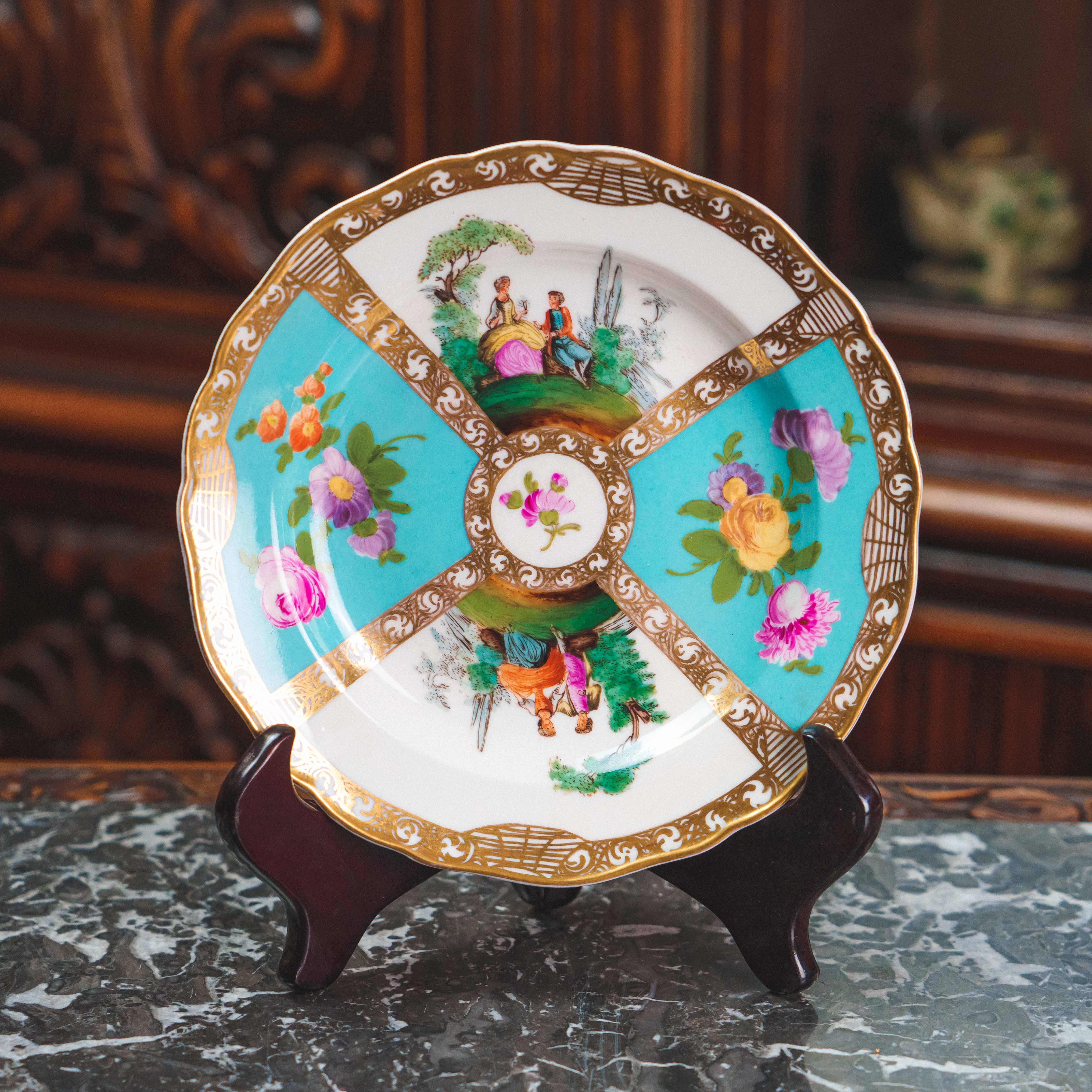 Декоративная фарфоровая тарелка с галантными сценами, выполненная в традициях европейского рококо. Композиция разделена на сектора, украшенные пасторальными сюжетами с элегантными персонажами и изысканными цветочными букетами на бирюзовом фоне. Ручная роспись отличается тонкой проработкой деталей, мягкой цветовой палитрой и живописной выразительностью. Богатое золочение с орнаментальными завитками подчёркивает декоративный характер и придаёт предмету торжественность. Предмет создавался как интерьерный акцент и обладает высокой коллекционной привлекательностью.