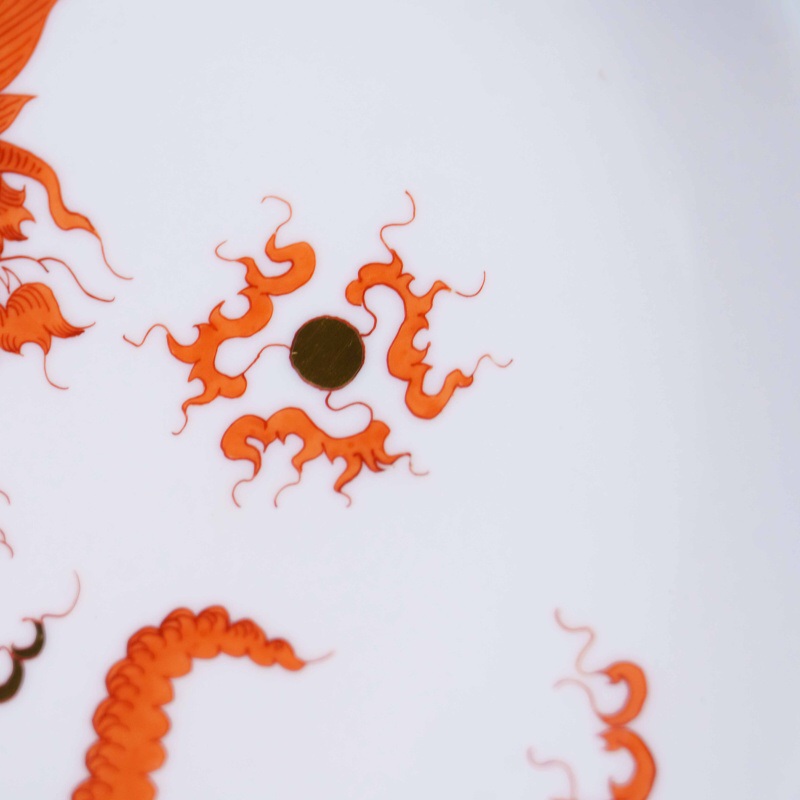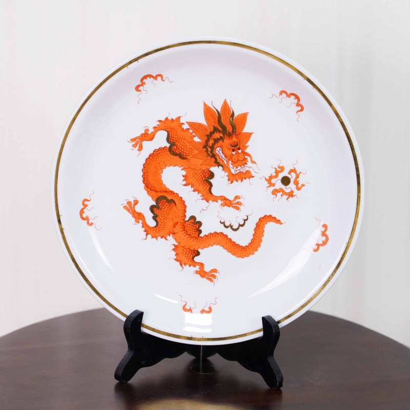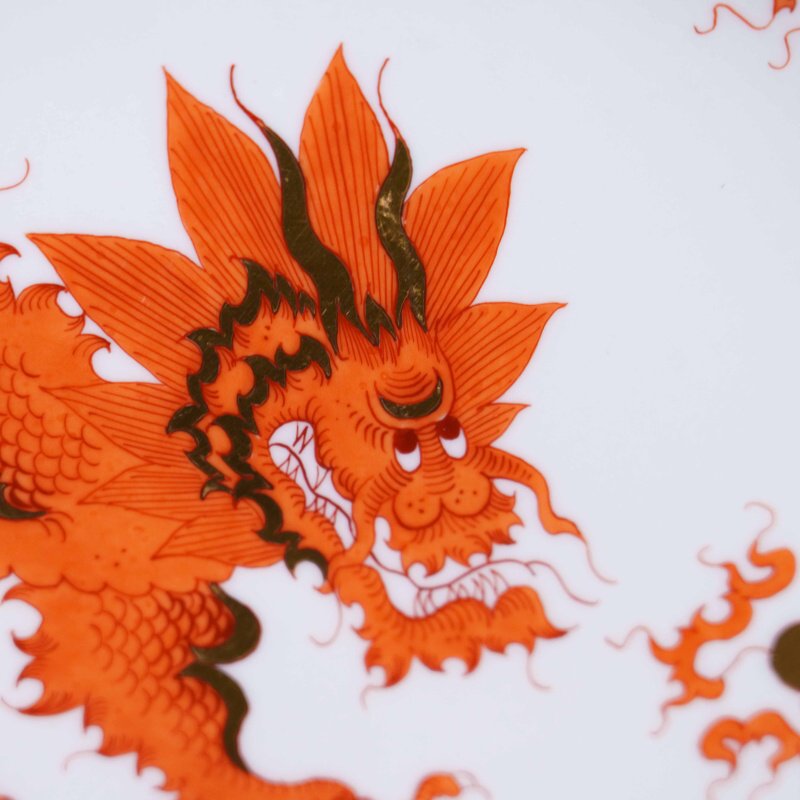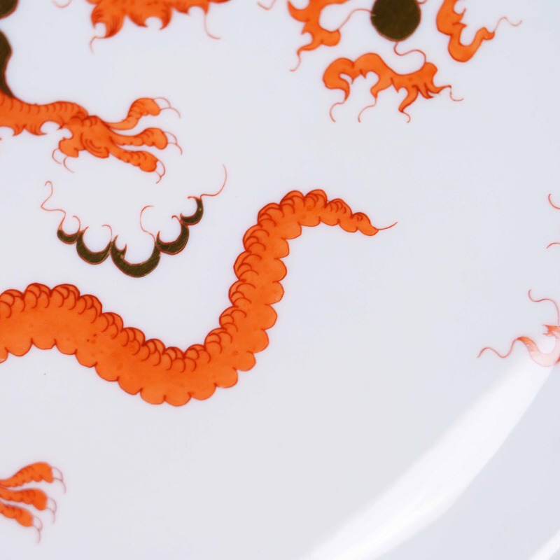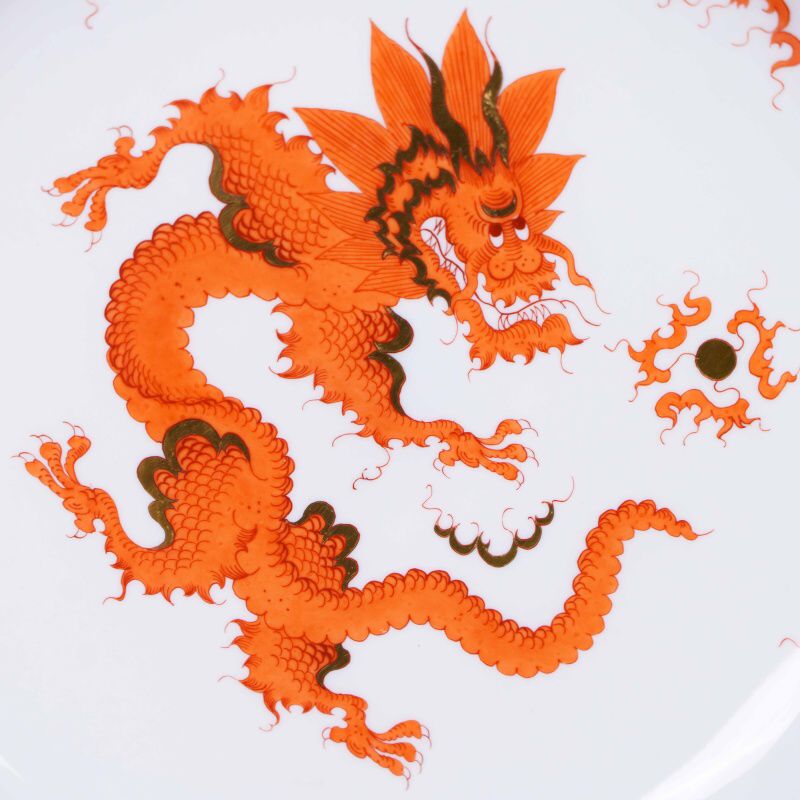 Декоративная фарфоровая тарелка выполнена по мотивам знаменитого «драконьего» сюжета, восходящего к восточным композициям, интерпретированным и популяризированным европейским фарфором мануфактуры Meissen. В центре представлена динамичная фигура огненно-красного дракона с детально проработанной чешуёй, когтями и выразительной мордой, изображённого в характерном для китайской традиции движении — в погоне за «огненной жемчужиной», символом мудрости, силы и бессмертия.