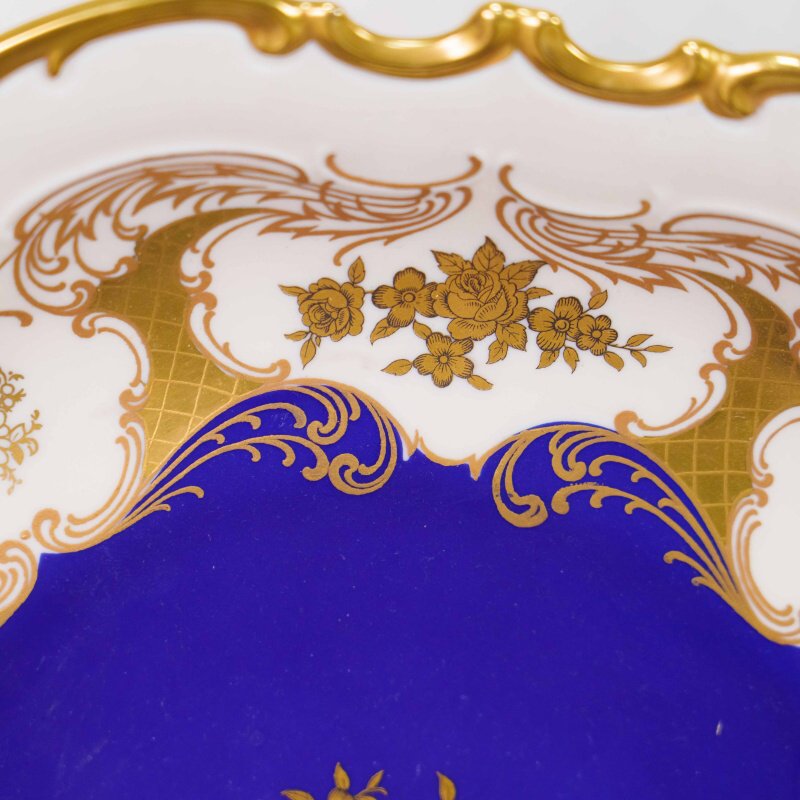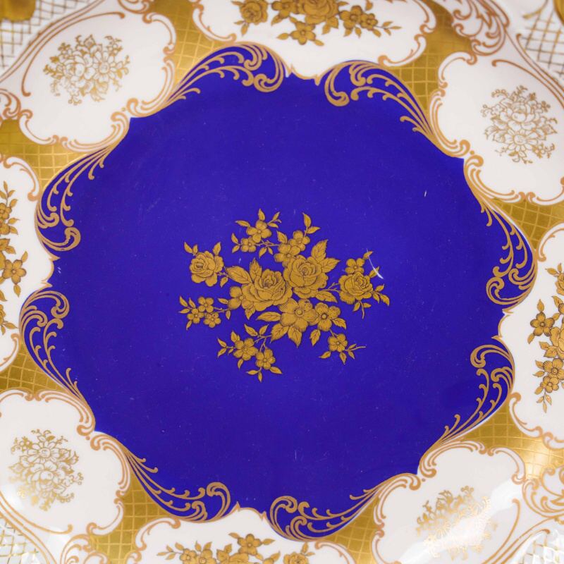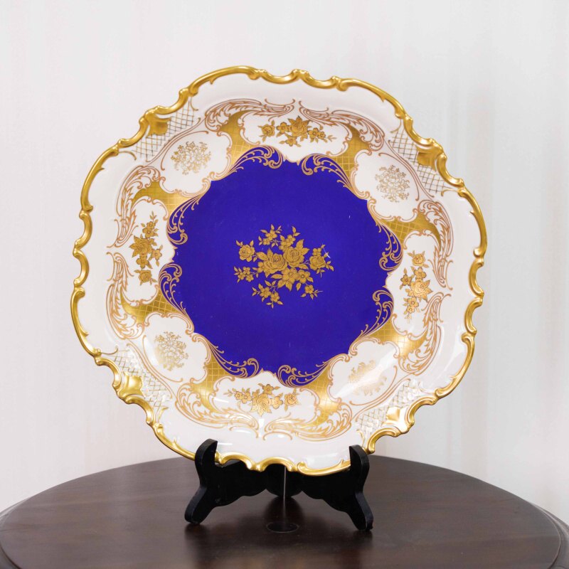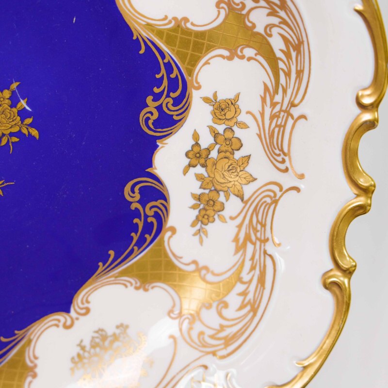 Декоративная фарфоровая тарелка выполнена в изысканной классической манере с использованием глубокого кобальтово-синего зеркала, характерного для немецкого художественного фарфора. Центральная часть украшена изящным цветочным букетом, выполненным в золоте, что создаёт выразительный контраст с насыщенным синим фоном и подчёркивает торжественный характер композиции.
