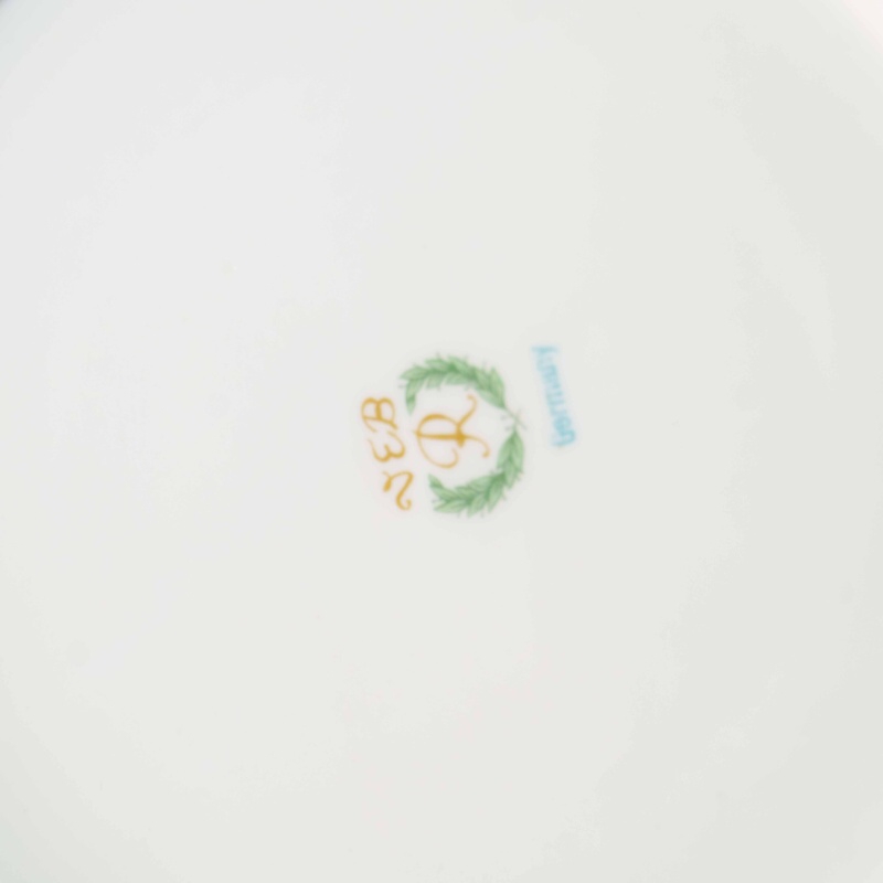 Тонкая проработка деталей, равномерное нанесение кобальта и аккуратное золочение свидетельствуют о высоком качестве исполнения и традициях мануфактуры Reichenbach, известной своими декоративными и представительскими изделиями. На оборотной стороне присутствует фирменное клеймо, подтверждающее происхождение предмета.