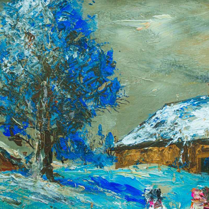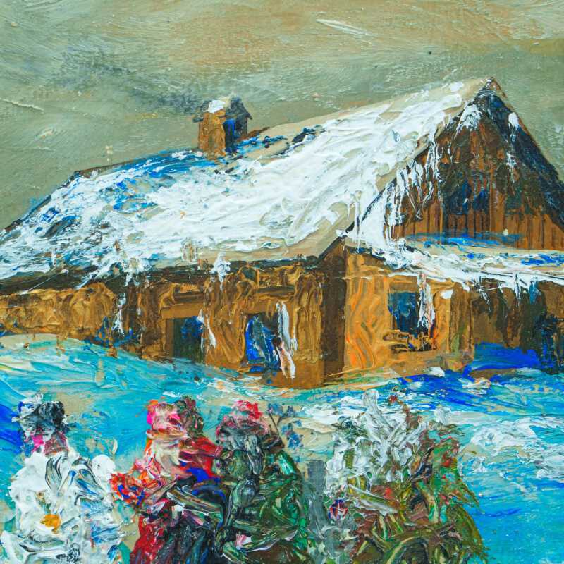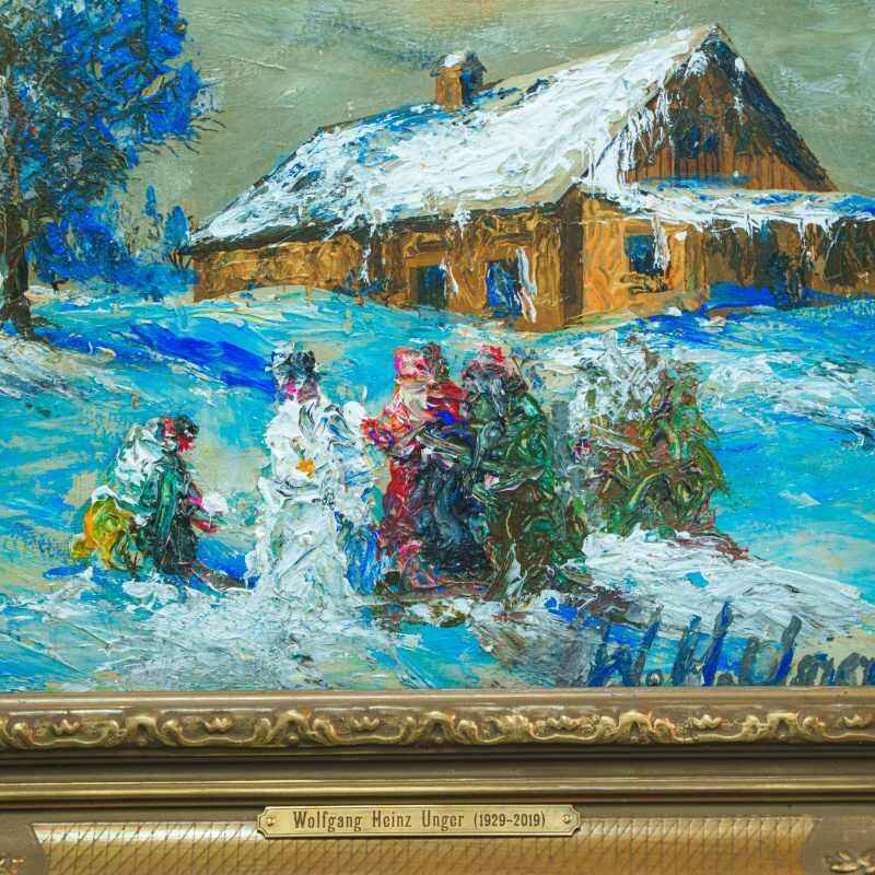 Представлено живописное произведение «Kinder bauen einen Schneemann» «Дети лепят снеговика» известного немецкого художника Wolfgang Heinz Unger. Авторская подпись, подтверждающая подлинность картины, находится в правом нижнем углу.