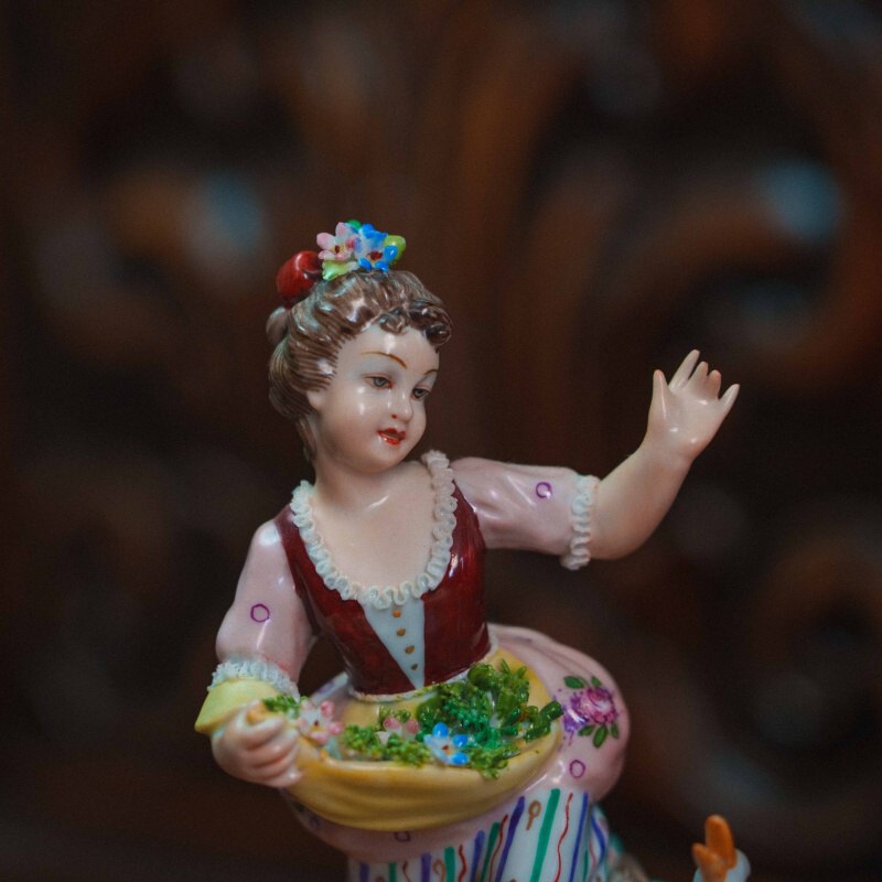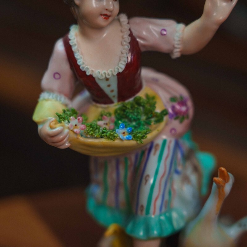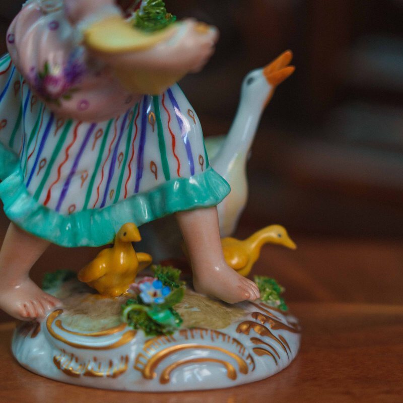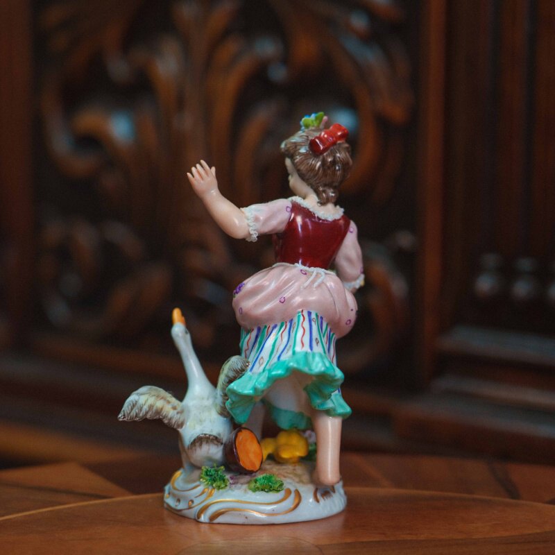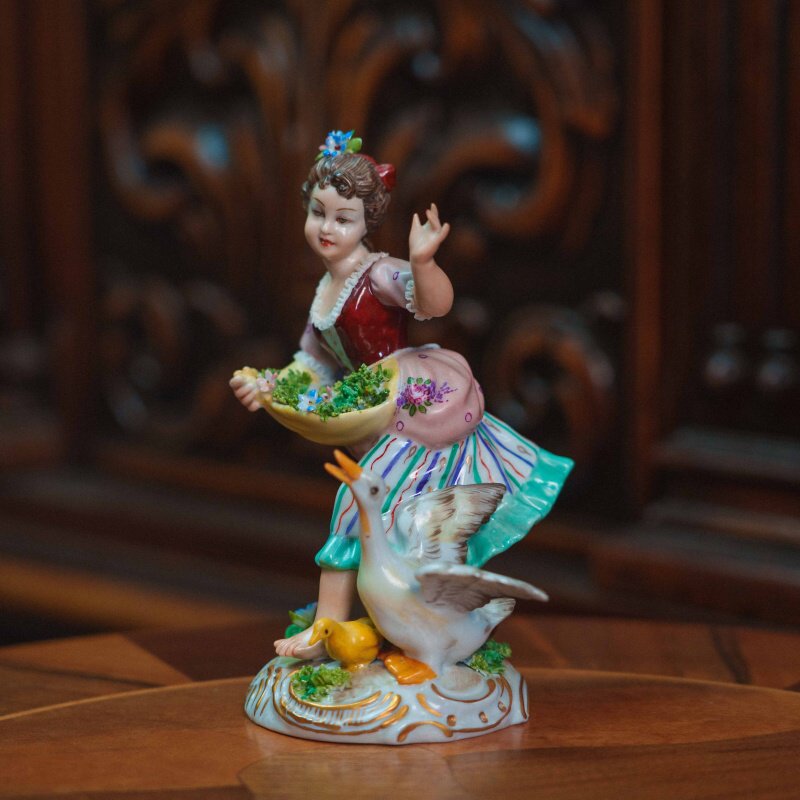 Фарфоровая статуэтка изображающая юную девушку в пасторальной тематике. Девушка, держит в руке корзину с зеленью и кормом, подняла руку вверх привлекая гусыню и гусят к кормушке. Композиция передает легкость и непосредственность пасторального шарма. Особое внимание уделено мягкой моделировке лица, выразительной пластики жеста и тщательно проработанным деталям костюма. На донышке композиции имеется фирменная марка итальянской фарфоровой мануфактуры San Marko Ceramics.