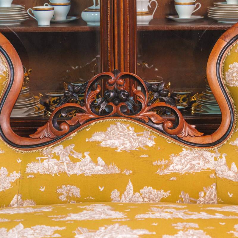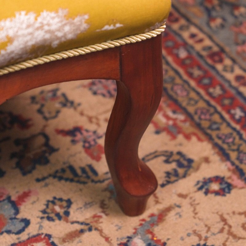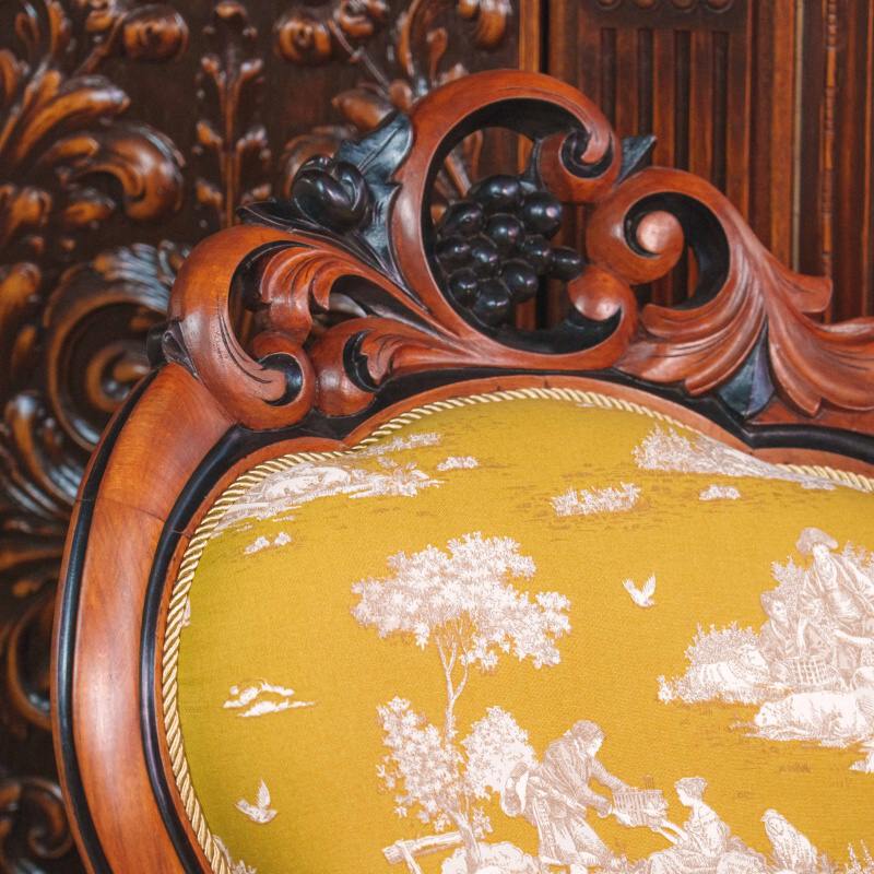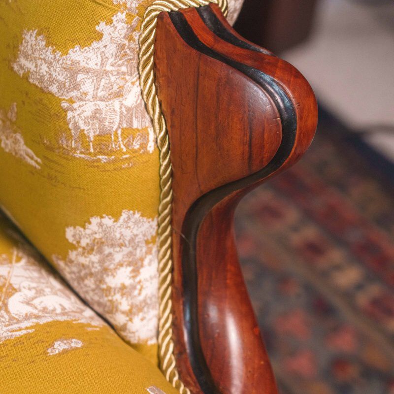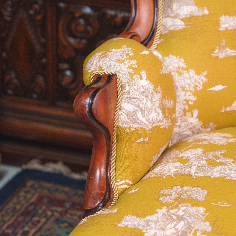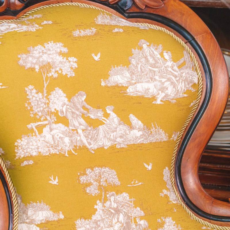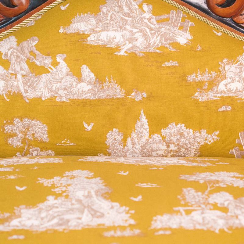Обивка выполнена из текстиля насыщенного горчично-жёлтого оттенка с изысканным светлым орнаментом в духе туаль-де-жуи — пасторальные сцены и растительные мотивы создают утончённый контраст с тёплым тоном древесины. Ткань натянута аккуратно, подчёркивая плавные контуры каркаса; мягкая набивка обеспечивает глубокую посадку и комфорт, соответствующий представлениям эпохи о домашнем уюте и респектабельности.