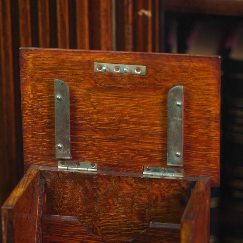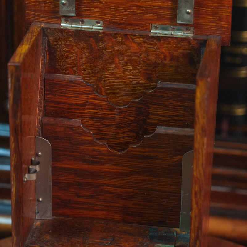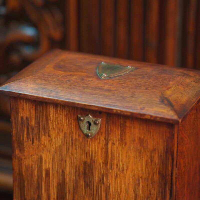 Металлическая фурнитура, включая замочную скважину и крепления, выполнена лаконично. Тёплый оттенок древесины и естественная текстура придают предмету сдержанную декоративность, характерную для изделий II половины XIX века.