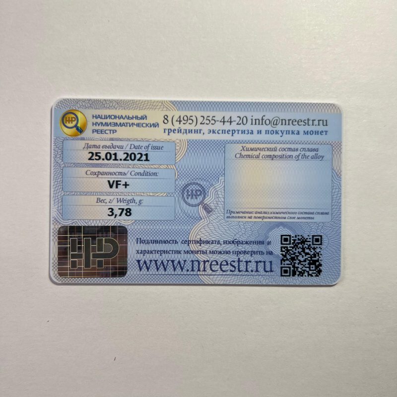 Монета имеет уникальный личный номер сертификата подлинности, информация о данном экземпляре находится в электронной базе данных на сайте Национального Нумизматического Реестра, что гарантирует подлинность предмета.