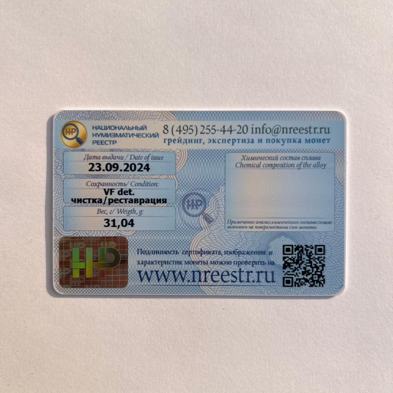 Монета имеет уникальный личный номер сертификата подлинности, информация о данном экземпляре находится в электронной в базе данных на сайте Национального Нумизматического Реестра, что гарантирует подлинность предмета.