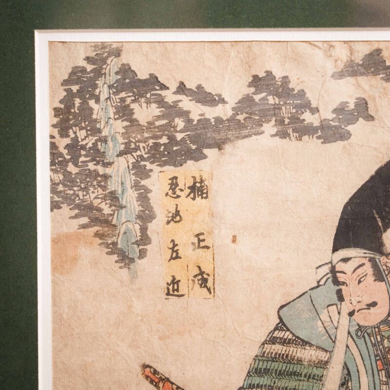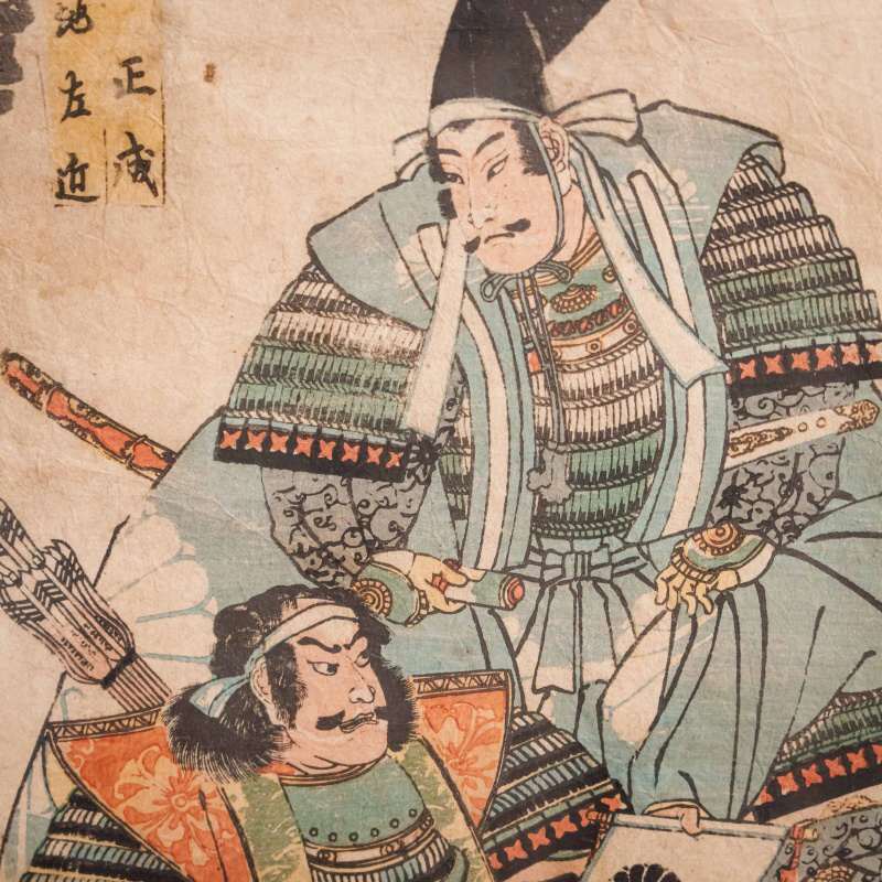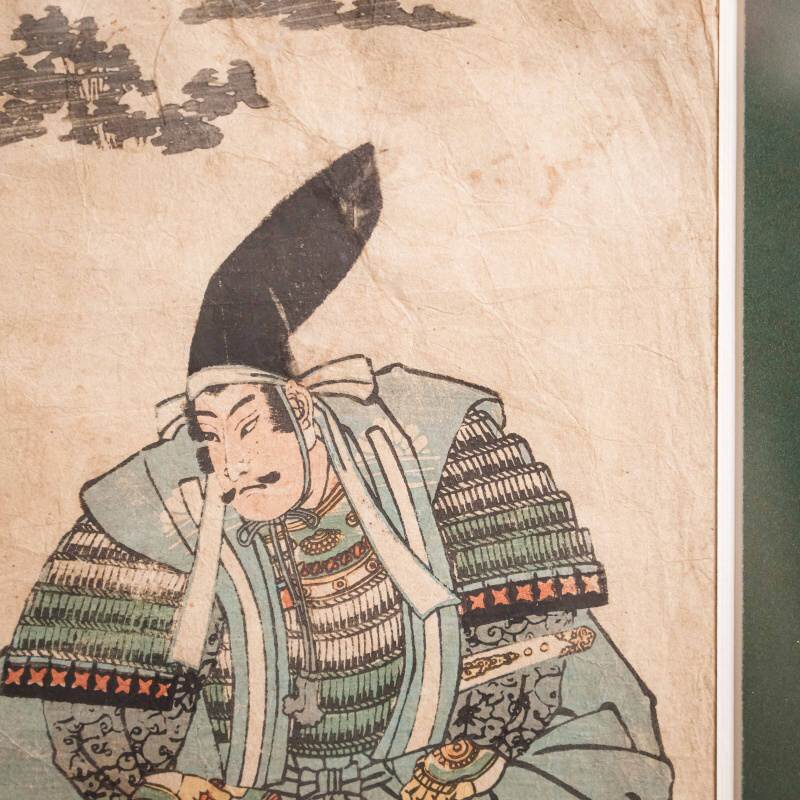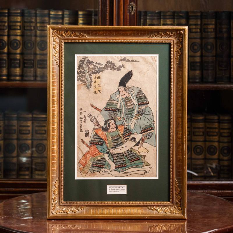 На гравюре изображены два самурая, облачённые в богатые доспехи, украшенные узорами и тканями глубоких, благородных оттенков. Один из них склонился, другой возвышается над ним, словно отдавая приказ или наставление — сцена, наполненная драматизмом, уважением и силой внутреннего духа. Взгляды героев, точные линии, изысканное сочетание бирюзовых, охристых и коралловых тонов создают эффект живого присутствия и передают атмосферу японского героического эпоса. Фон решён в мягких тонах — на нём видны стилизованные облака и кроны сосен, выполненные в приглушённой серо-зелёной гамме, что создаёт ощущение глубины и покоя, усиливая контраст с насыщенными красками доспехов. Колорит построен на сочетании оттенков охры, бирюзового, красного и зелёного, характерных для середины XIX века, когда японские мастера достигли особой выразительности в печатной графике.