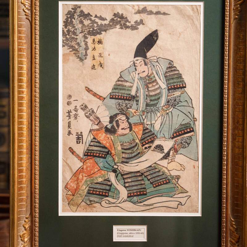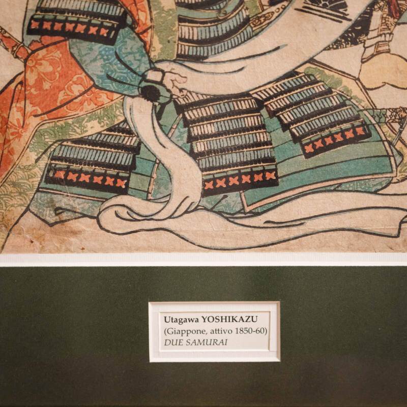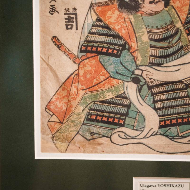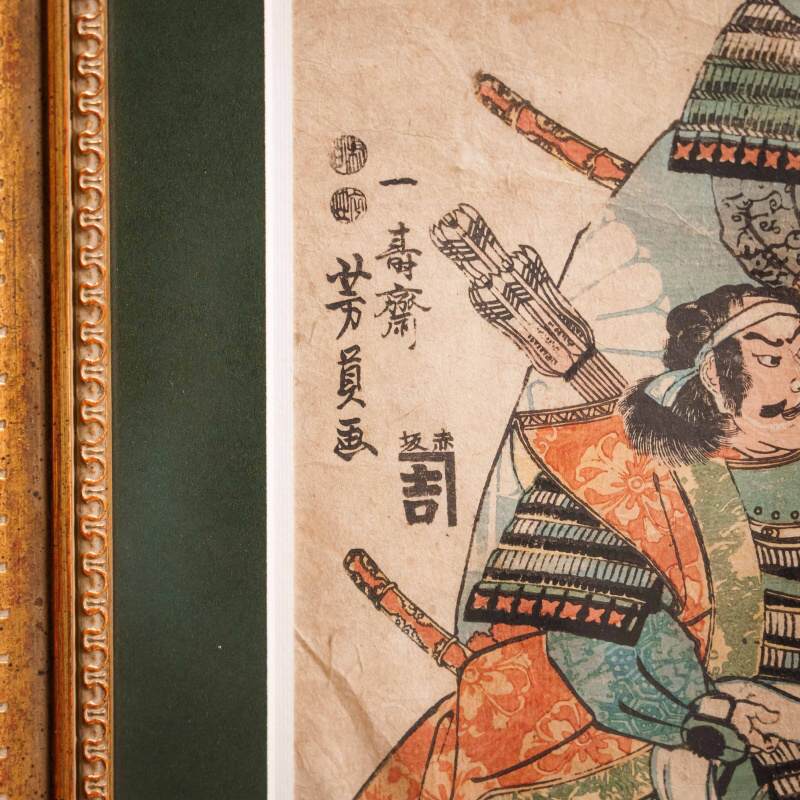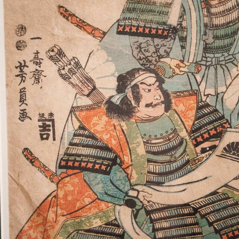 В левой части композиции расположена подпись художника: 一寿斎 芳員画 (Ichijūsai Yoshikazu ga), что означает «работа Ёсикадзу, ученика школы Ичидзюсай». Мастер принадлежал к знаменитой школе Utagawa, основанной художником Toyoharu и прославившейся своими театральными и историческими сюжетами. Utagawa Yoshikazu (歌川 芳員) был учеником великого Utagawa Kuniyoshi, одного из самых значимых мастеров позднего периода Ukiyo-e. Его творчество отличается динамикой, вниманием к деталям самурайского вооружения и силой внутреннего настроя героев. Yoshikazu известен также как один из первых японских художников, кто обратился к теме контакта Японии с Западом в период Бакумацу, что делает его фигуру важной в истории японской гравюры.
