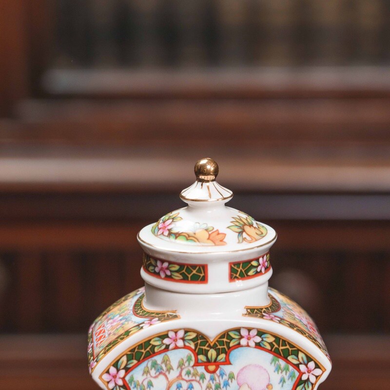 Фарфоровая чайница квадратной формы с плавно изогнутыми стенками и крышкой с позолоченным навершием. Изделие украшено многоцветной росписью в стиле «chinoiserie», отражающей европейское восприятие Востока и традиций чаепития. На центральных медальонах представлены сцены чаепития в условно-китайском пейзаже: фигуры в национальных одеждах, пагода, деревья и горы на фоне восходящего солнца. Композиции обрамлены орнаментальными бордюрами с цветочными мотивами, выполненными в насыщенных красно-зелёных тонах с золотыми акцентами.