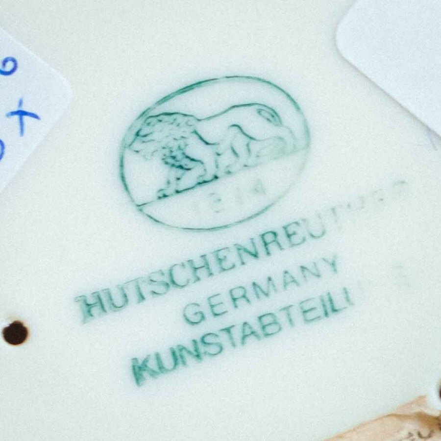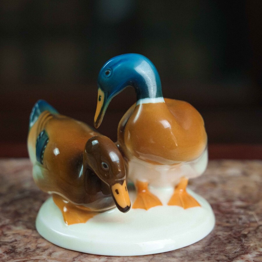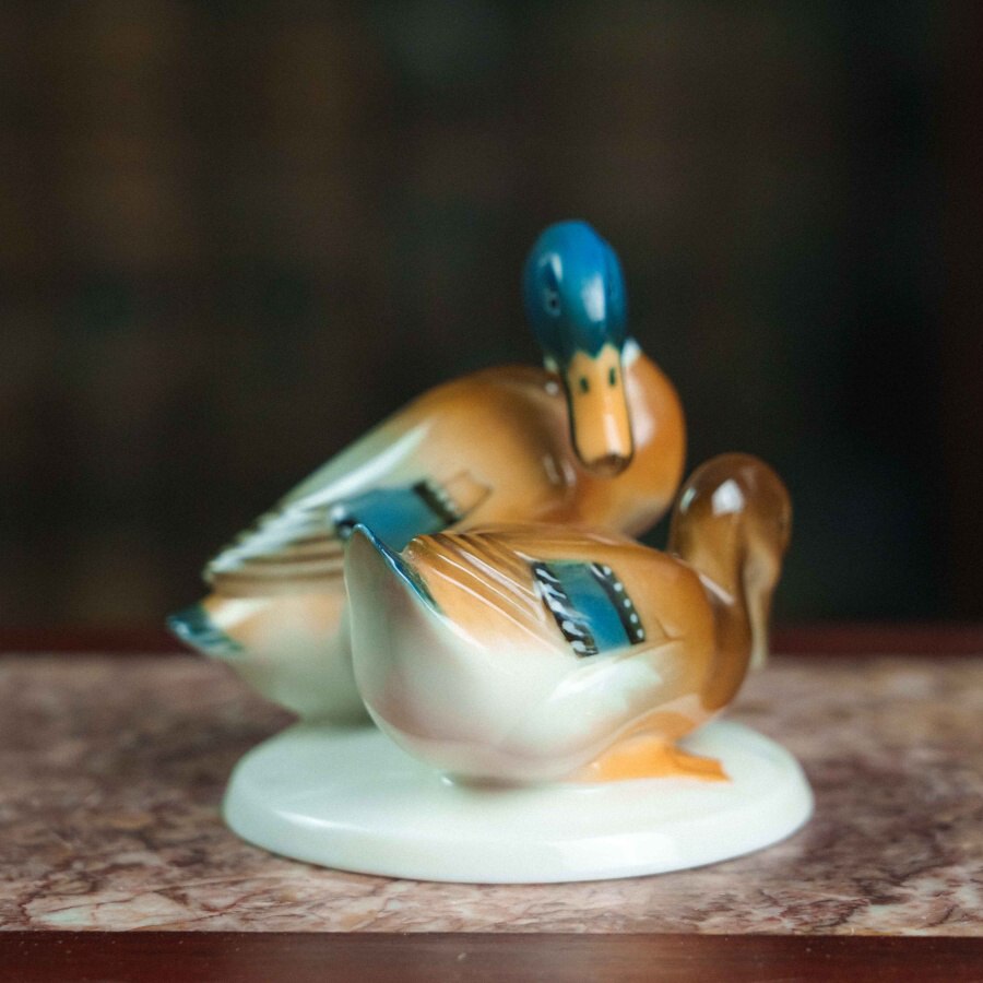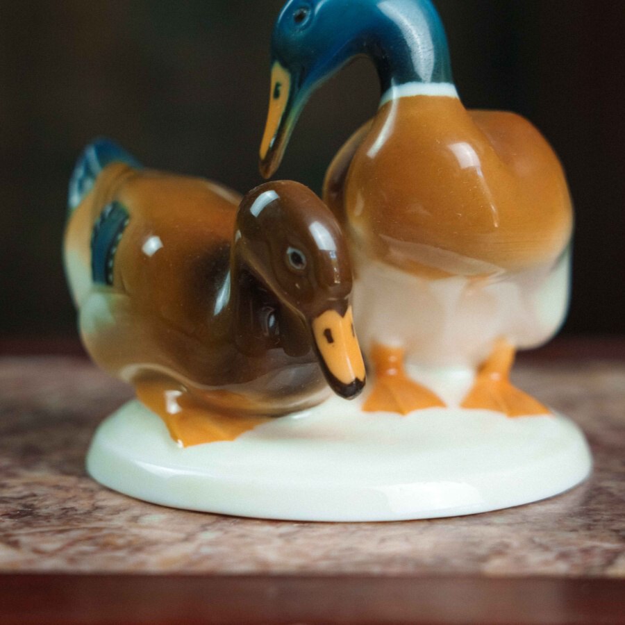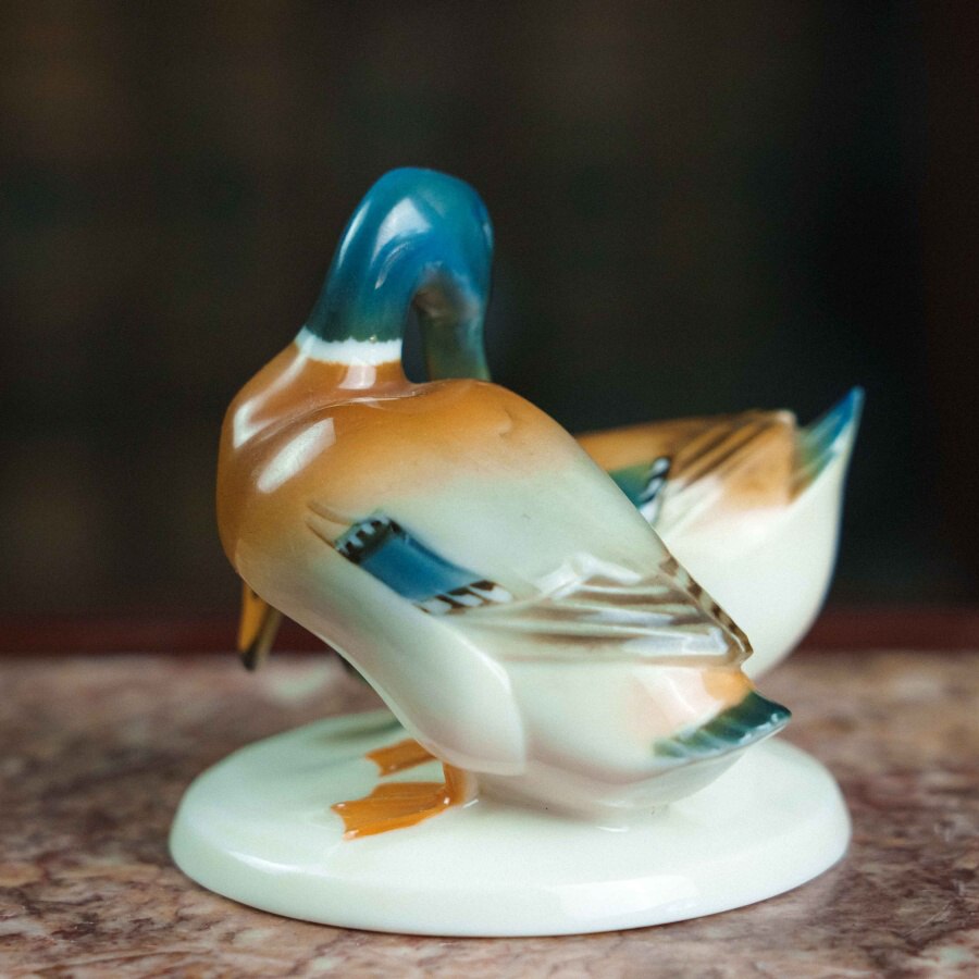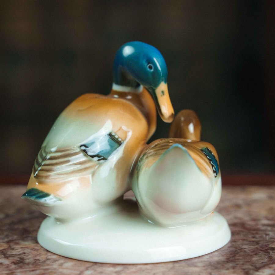 Фарфоровая фигурка «Уточки» работы немецкой мануфактуры Hutschenreuther выполнена в изящной и реалистичной манере, характерной для художественного отделения фабрики. На овальном основании представлена пара утки и селезня: самец с насыщенной синевато-зелёной головой и тёплой охристо-белой грудью, и самка с более спокойной коричневой окраской, оттеняющей его яркость. Тонкие переходы глазури создают мягкий живописный эффект, а детализированные перья с синими акцентами, выразительные глаза и изящные перепончатые лапки подчёркивают натуралистичность композиции. Изображение пары уточек символизирует верность и семейное благополучие, что делает фигурку не только декоративным, но и символически наполненным предметом. На основании стоит зелёное клеймо «Hutschenreuther Germany Kunstabteilung» с изображением льва и датой 1814 — годом основания фабрики, что указывает на принадлежность изделия к коллекционной линии художественного отделения. Мануфактура Hutschenreuther, основанная Карлом Магнусом Хутшенройтером в Баварии, прославилась как один из ведущих производителей немецкого фарфора XIX–XX веков, а её фигурки животных и птиц высоко ценятся за гармоничное сочетание реализма и декоративности. Скульптура уточек является примером этого мастерства и может стать украшением интерьера или коллекции фарфорового искусства.