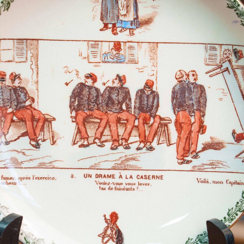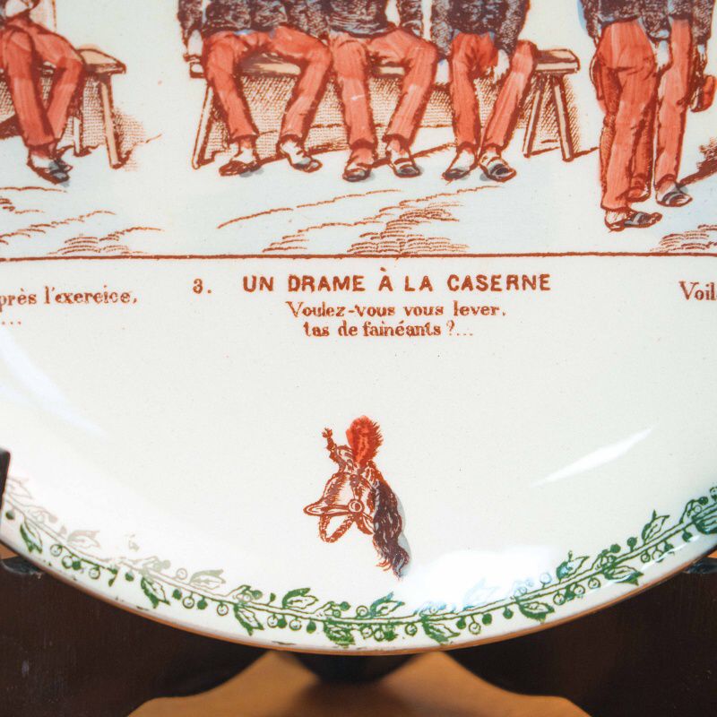 Коллекционная французская тарелка с выразительной сатирической сценой из армейской жизни — «Un drame à la caserne» («Драма в казарме»). Сюжет выполнен в характерной для XIX века манере — лёгкая ирония, бытовые зарисовки и живые эмоции персонажей.