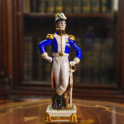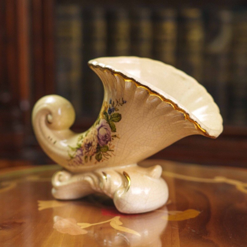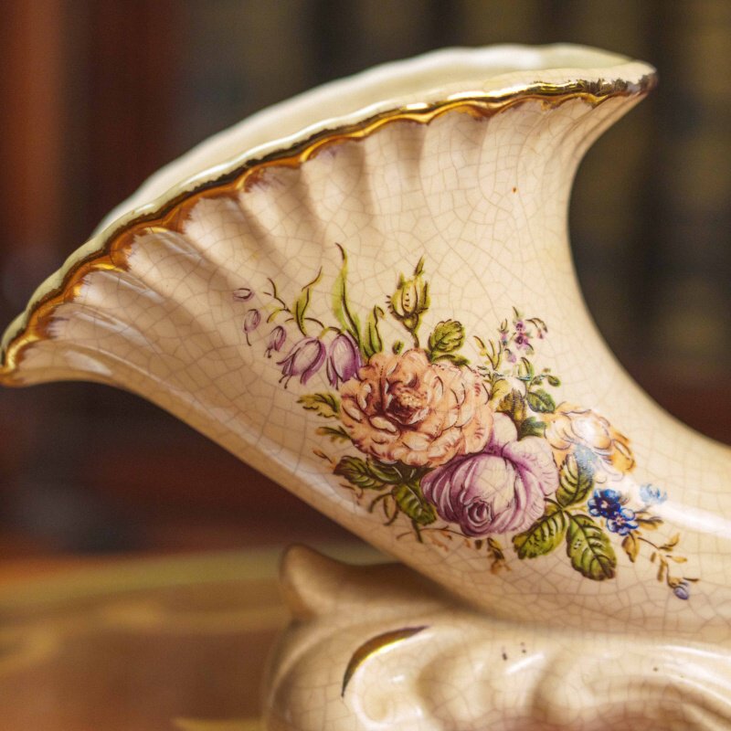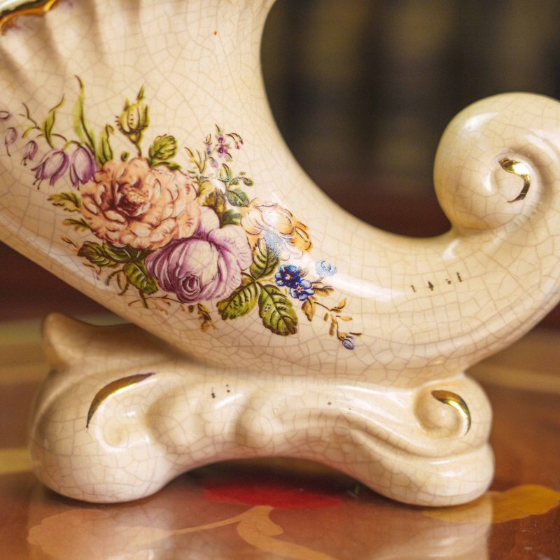 Элегантная декоративная ваза в форме рога изобилия выполнена из фаянса с выразительной сеткой естественного кракелюра, придающей изделию благородный винтажный характер. Корпус украшен букетом садовых цветов — роз, колокольчиков и мелких голубых цветков в мягкой пастельной гамме. Края вазы подчеркнуты тонким золочением, которое красиво играет на свету и подчеркивает волнистый рельеф.