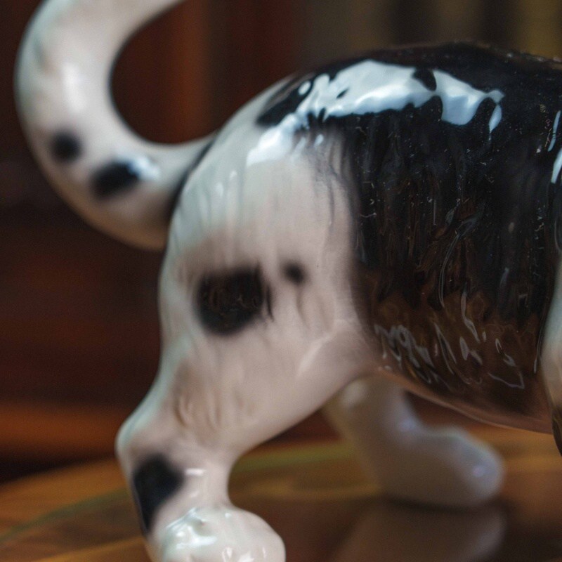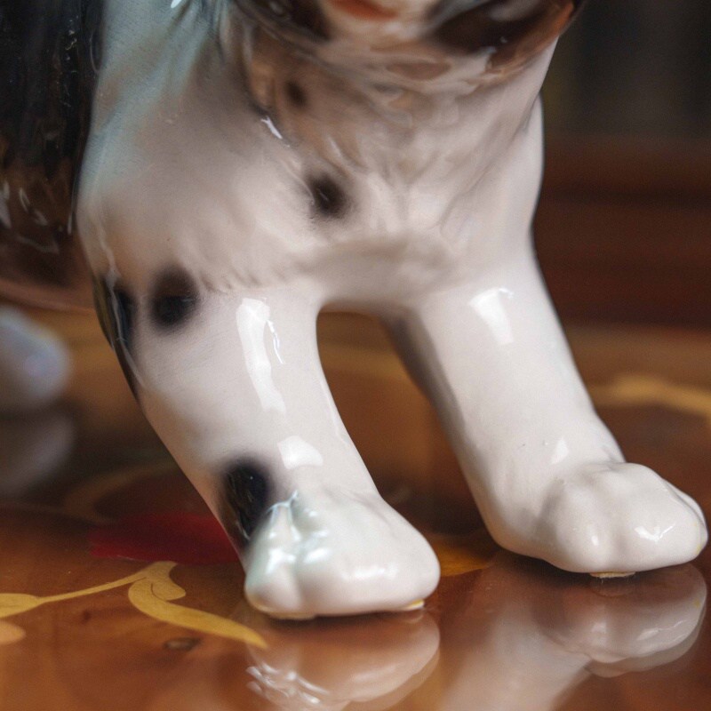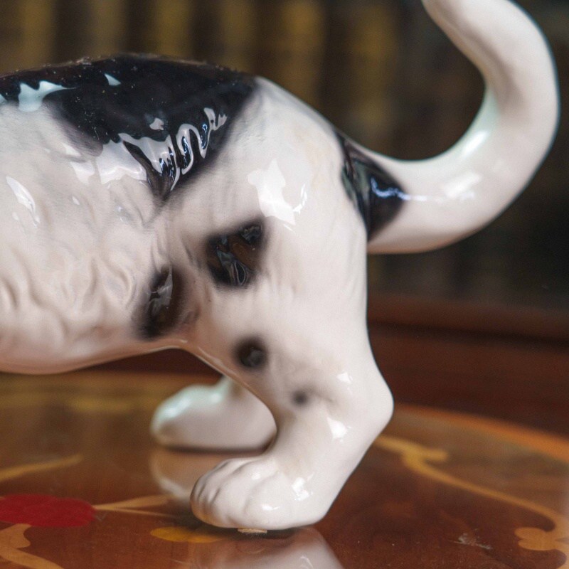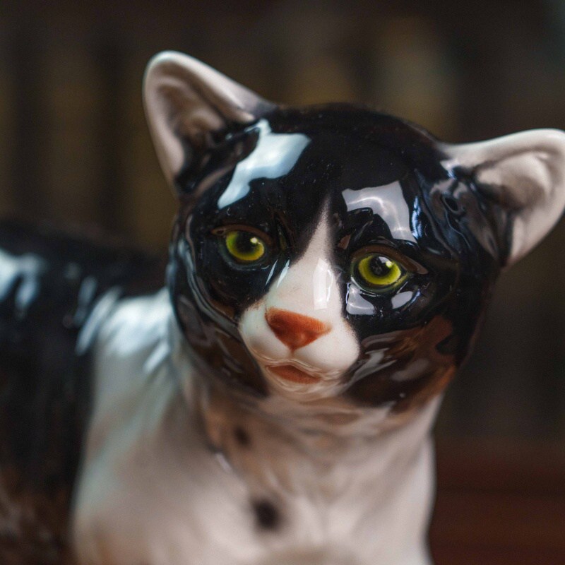 Фарфоровая фигурка кошки, выполненная в реалистичной манере с живой пластикой и выразительным характером животного.