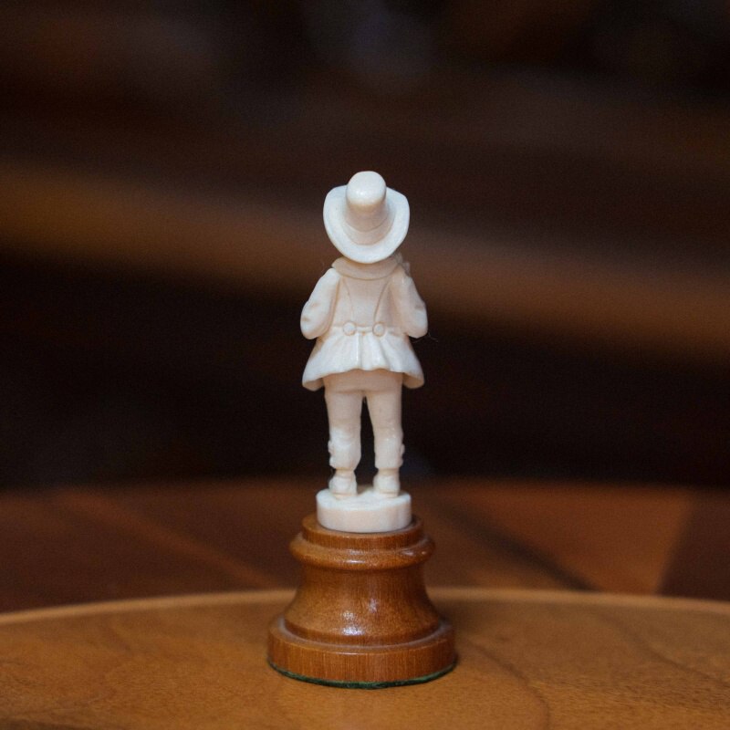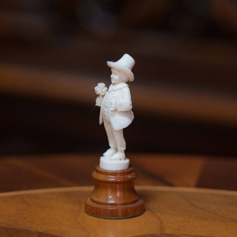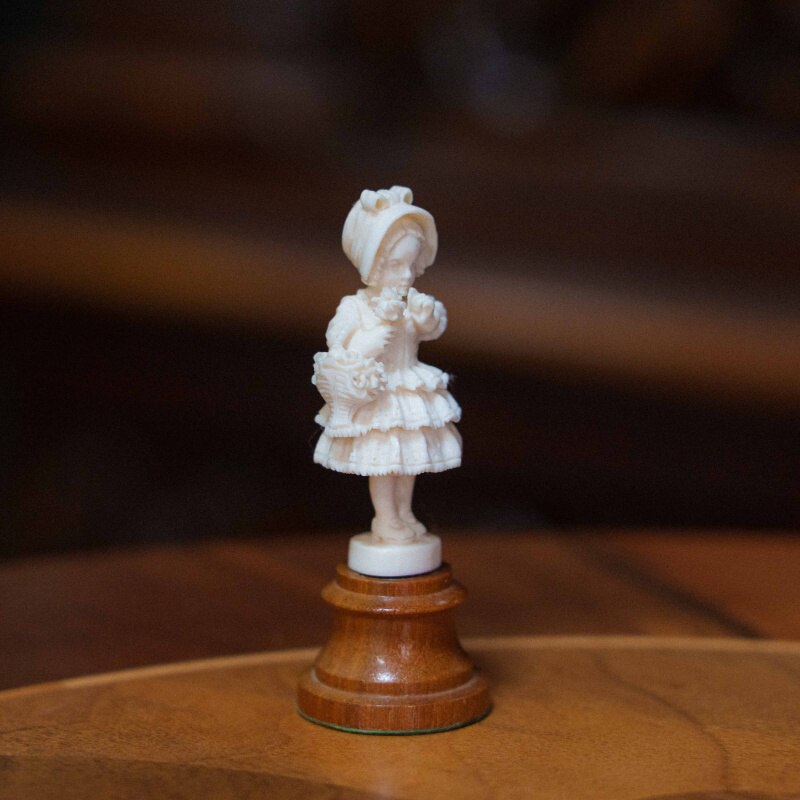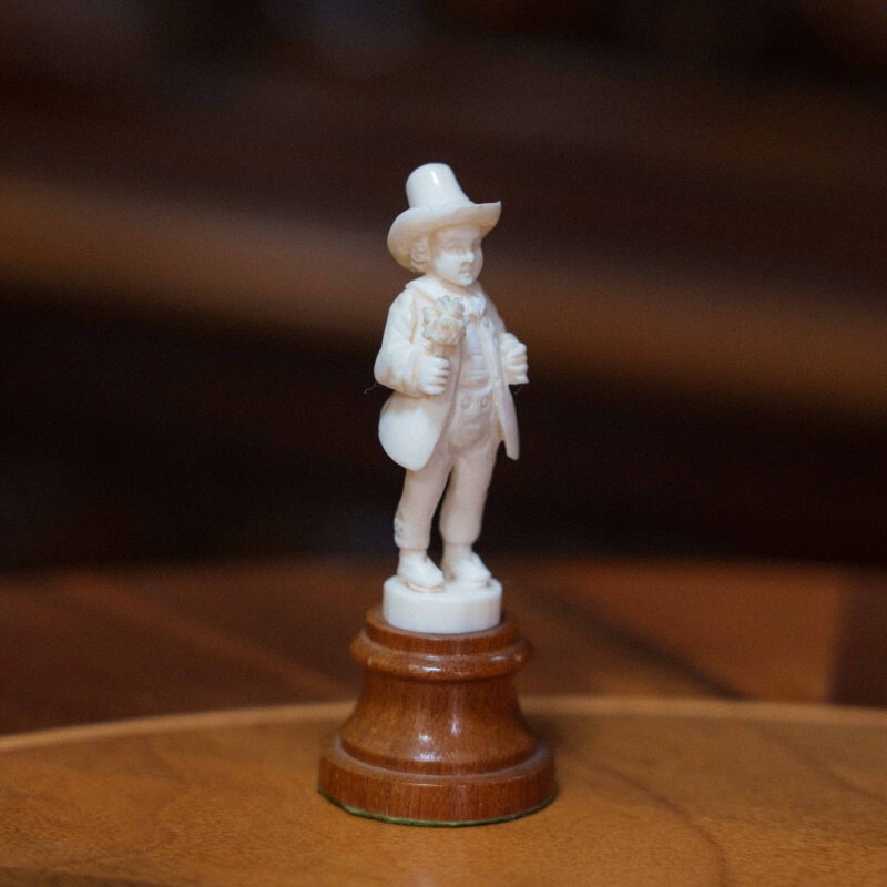 Французская резьба по кости, выполненная мастерами из города Дьеп (Dieppe) в начале XX веке. Парные фигуры изображают «Кавалера и Даму в костюмах эпохи Людовика XIV», нарядные костюмы: многослойные юбки у девочки, камзол у мальчика. Школа Дьепа: С XVII века французский Дьеп был главным центром резьбы по слоновой кости в Европе. Мастера создавали невероятно детализированные статуэтки королей, святых и жанровые сцены.