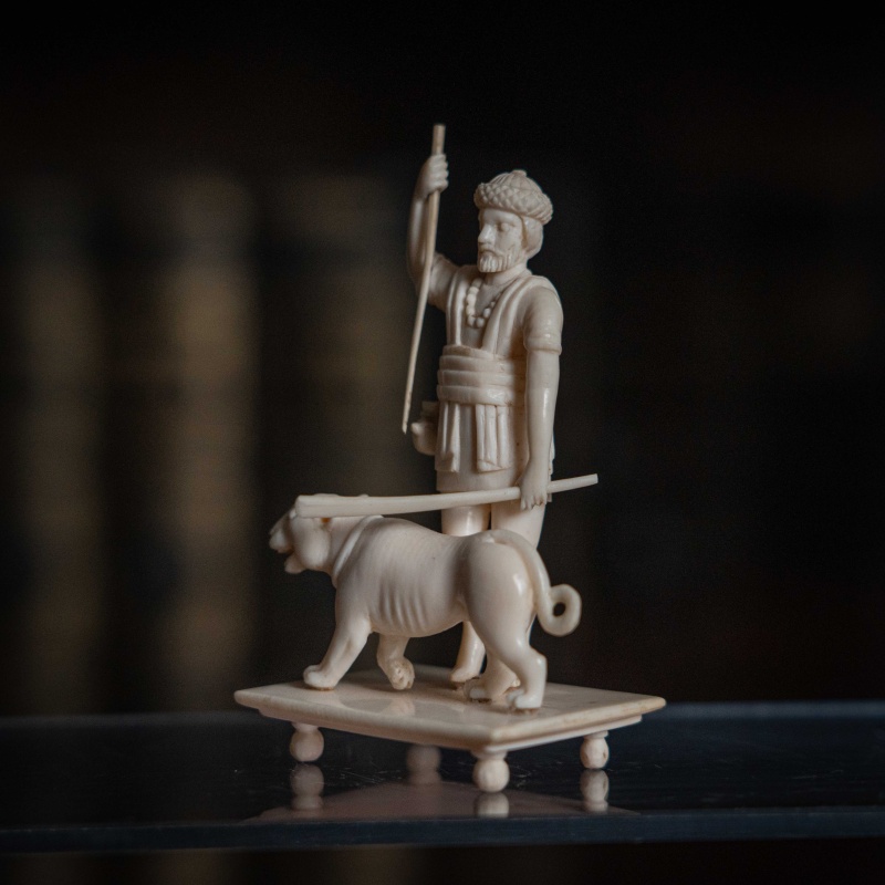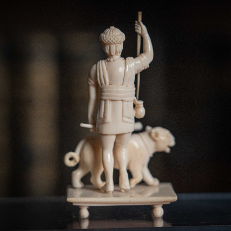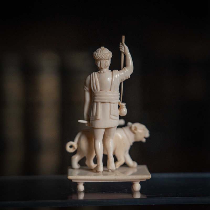 Французская резьба по кости, выполненная мастерами из города Дьеп (Dieppe) в XIX веке. Фигура с тигром с палкой и копьем в руке символизирует власть над дикой природой или триумф. Прямоугольное основание на четырех ножках-шариках — визитная карточка дьепских мастеров. Они специализировались на подобных кабинетных миниатюрах. Школа Дьепа: С XVII века французский Дьеп был главным центром резьбы по слоновой кости в Европе. Мастера создавали невероятно детализированные статуэтки королей, святых и жанровые сцены.
