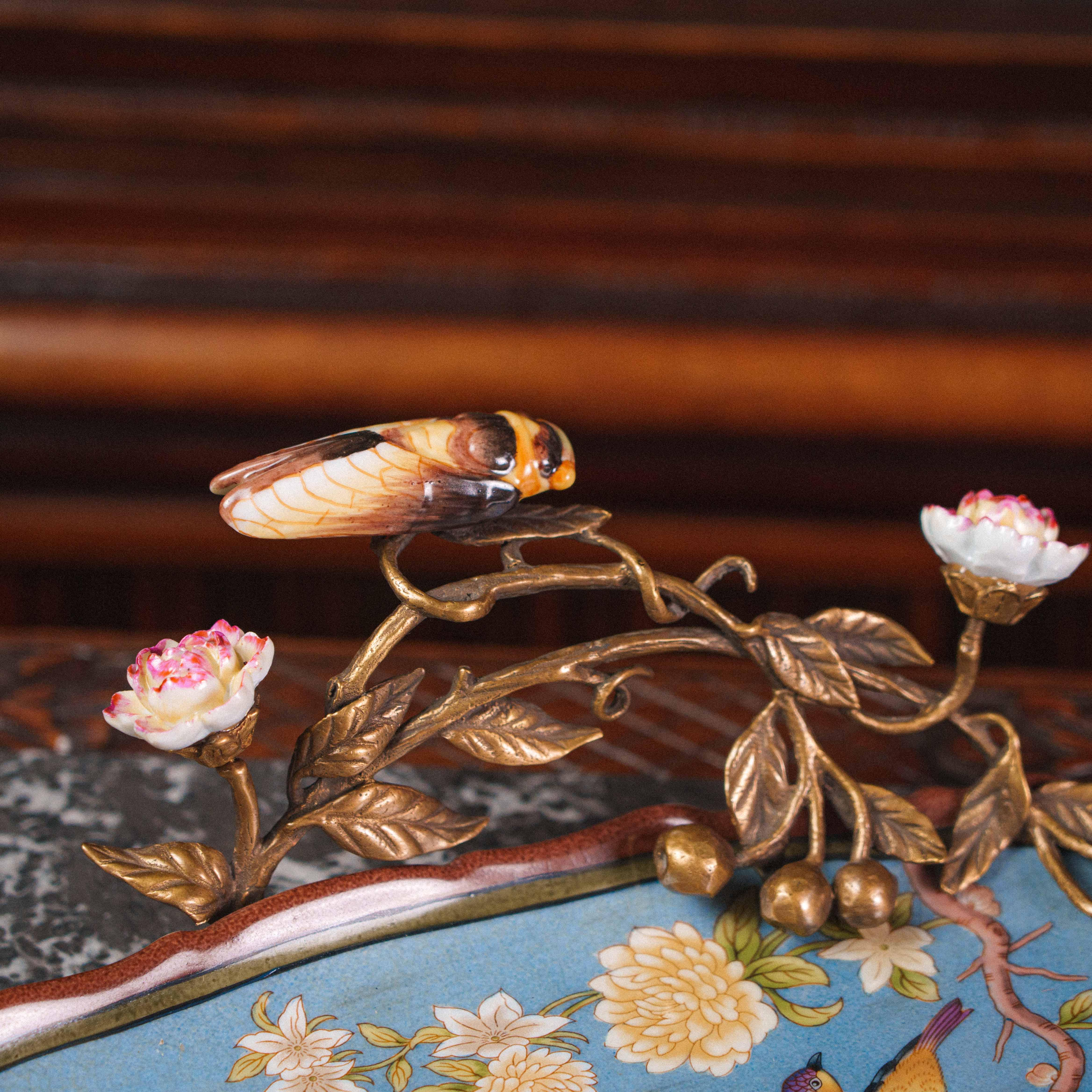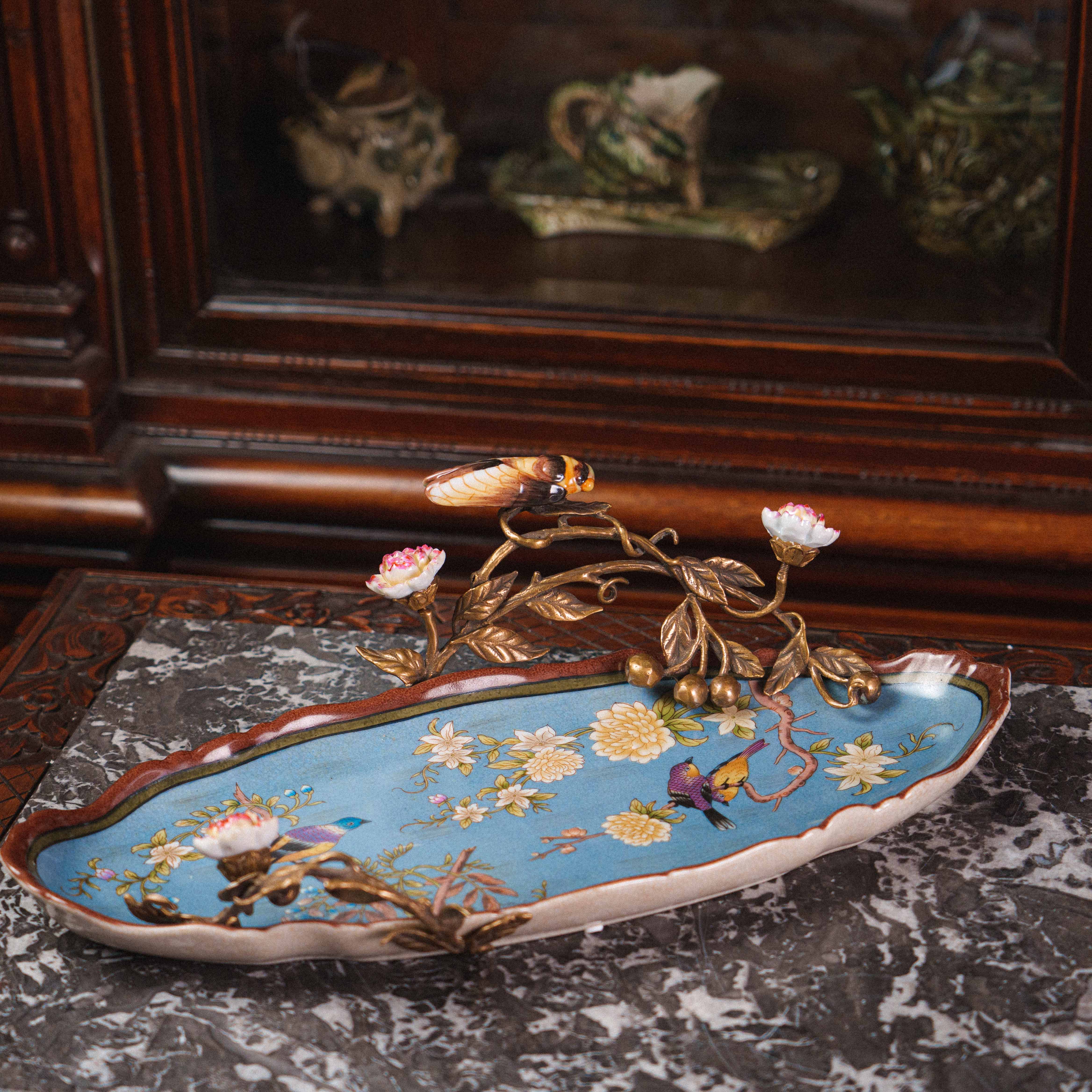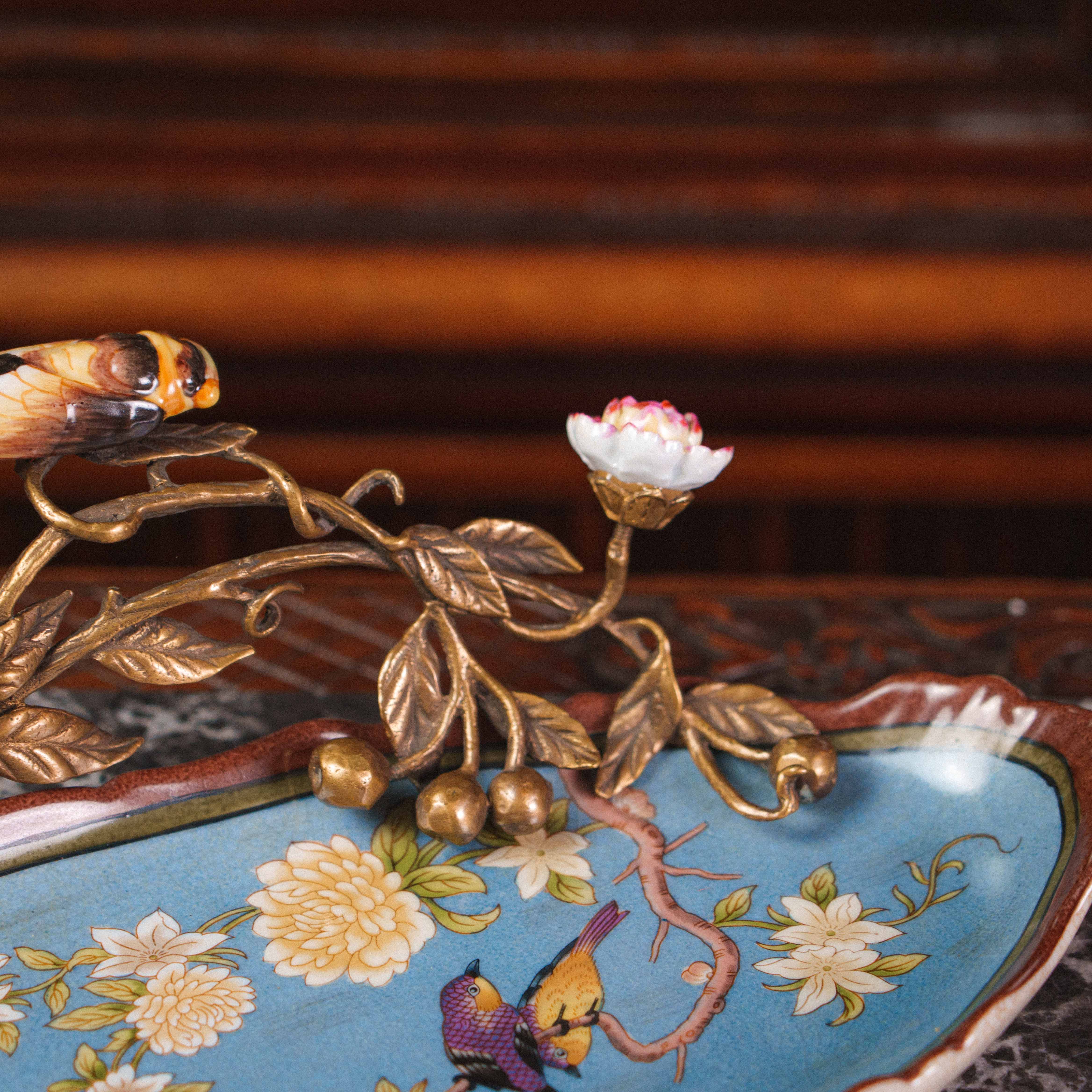 Изящная фруктовница в восточном стиле — предмет, в котором тонкость ручной росписи сочетается с поэтичной символикой природы. Фарфоровое блюдо небесно-голубого оттенка украшено живописными цветущими ветвями, птицами и хризантемами — символами радости, благополучия и долголетия. В центре композиции — объёмная декоративная ветвь из бронзы с утончёнными листьями и бутонами, на которой покоится фарфоровая цикада, воплощающая пробуждение и вечный цикл жизни. Каждая деталь продумана до мелочей: от плавных линий лепестков до лёгкого блеска позолоты, создающего игру света.