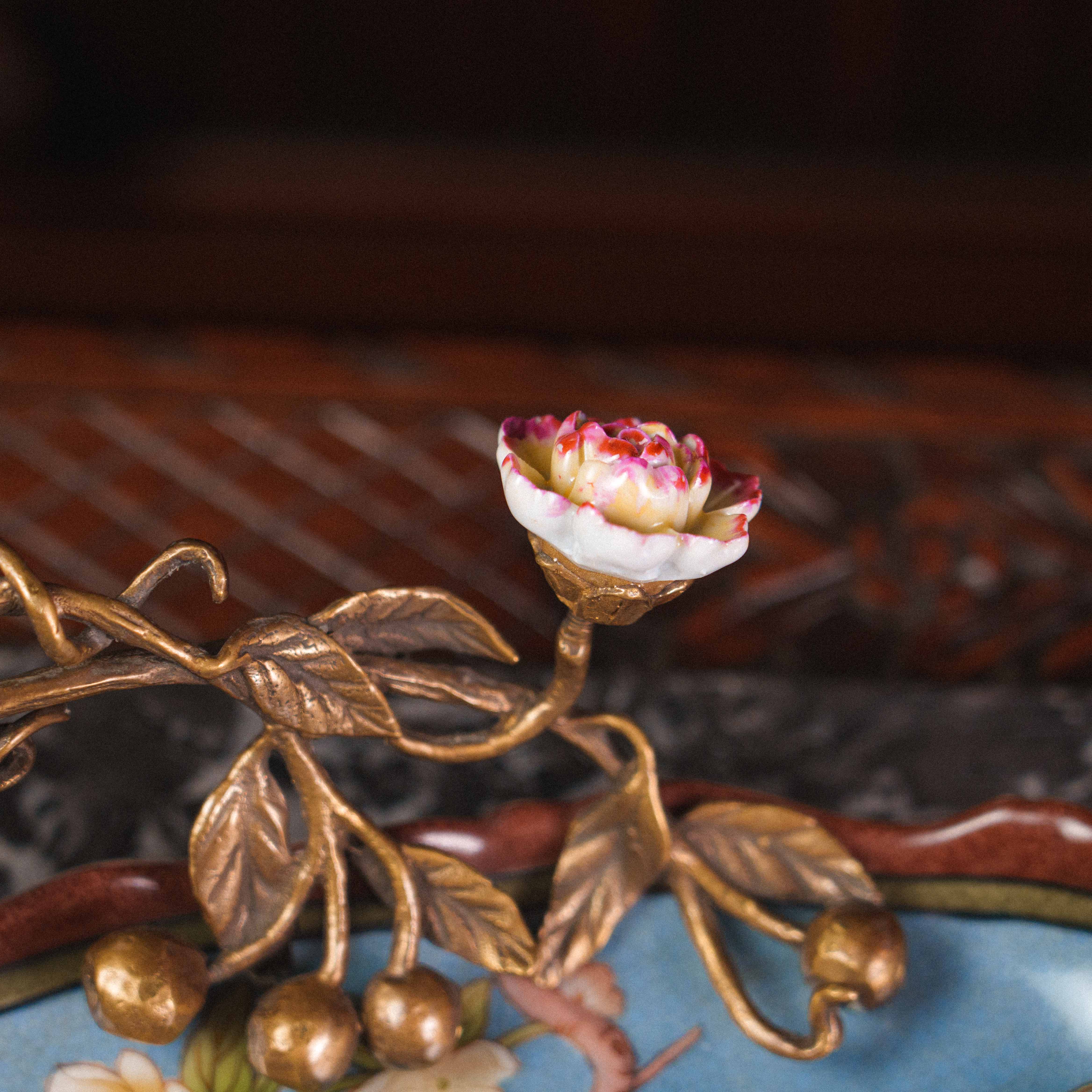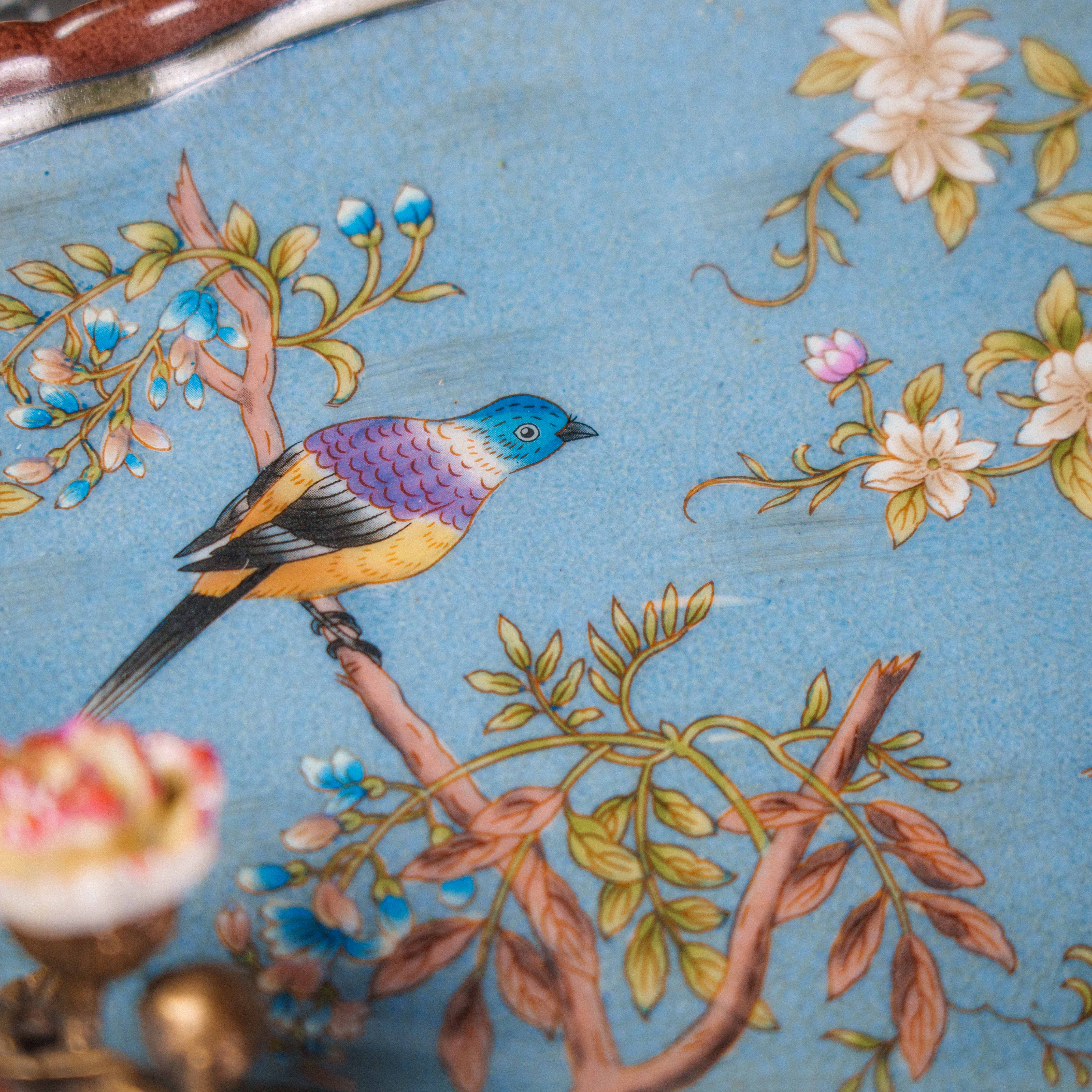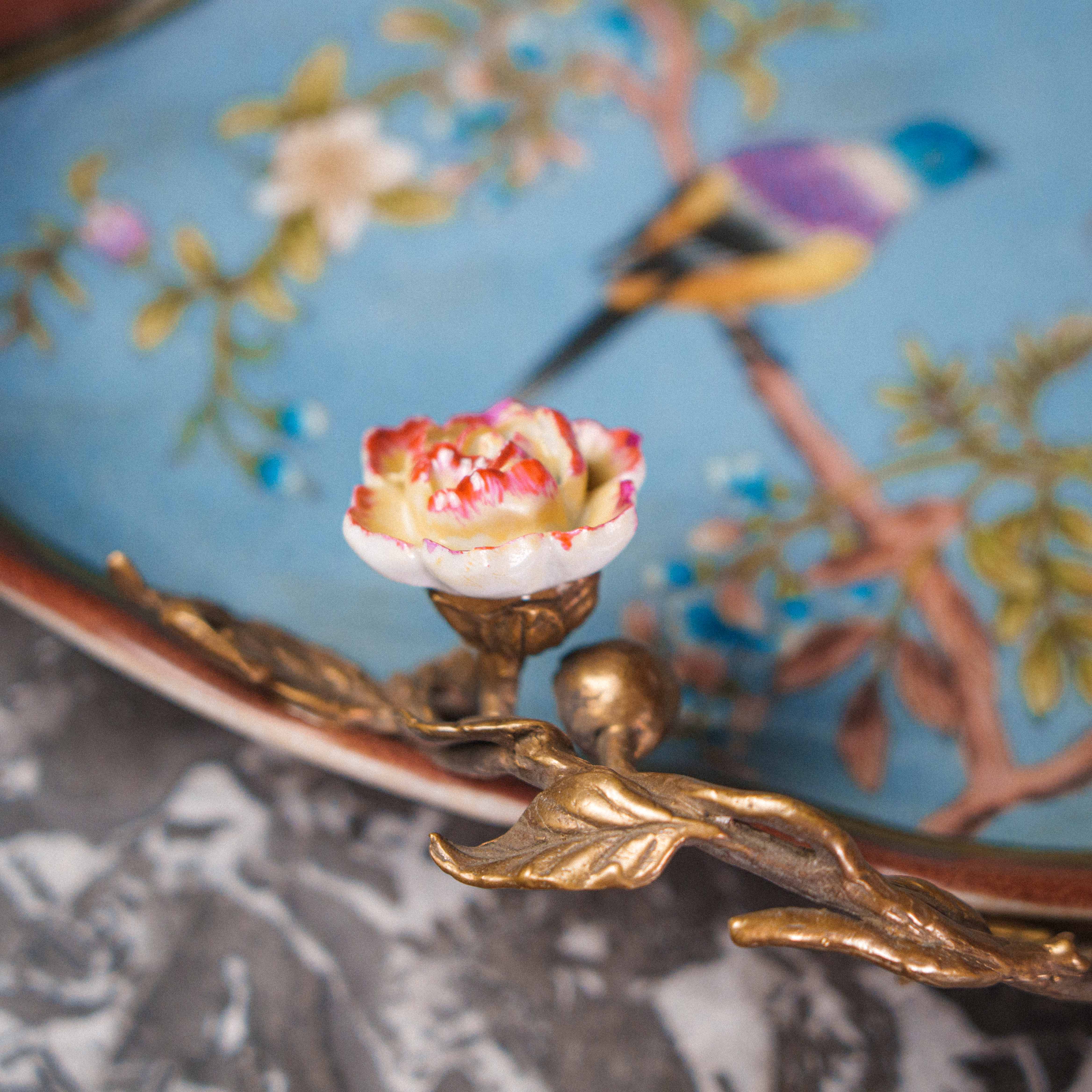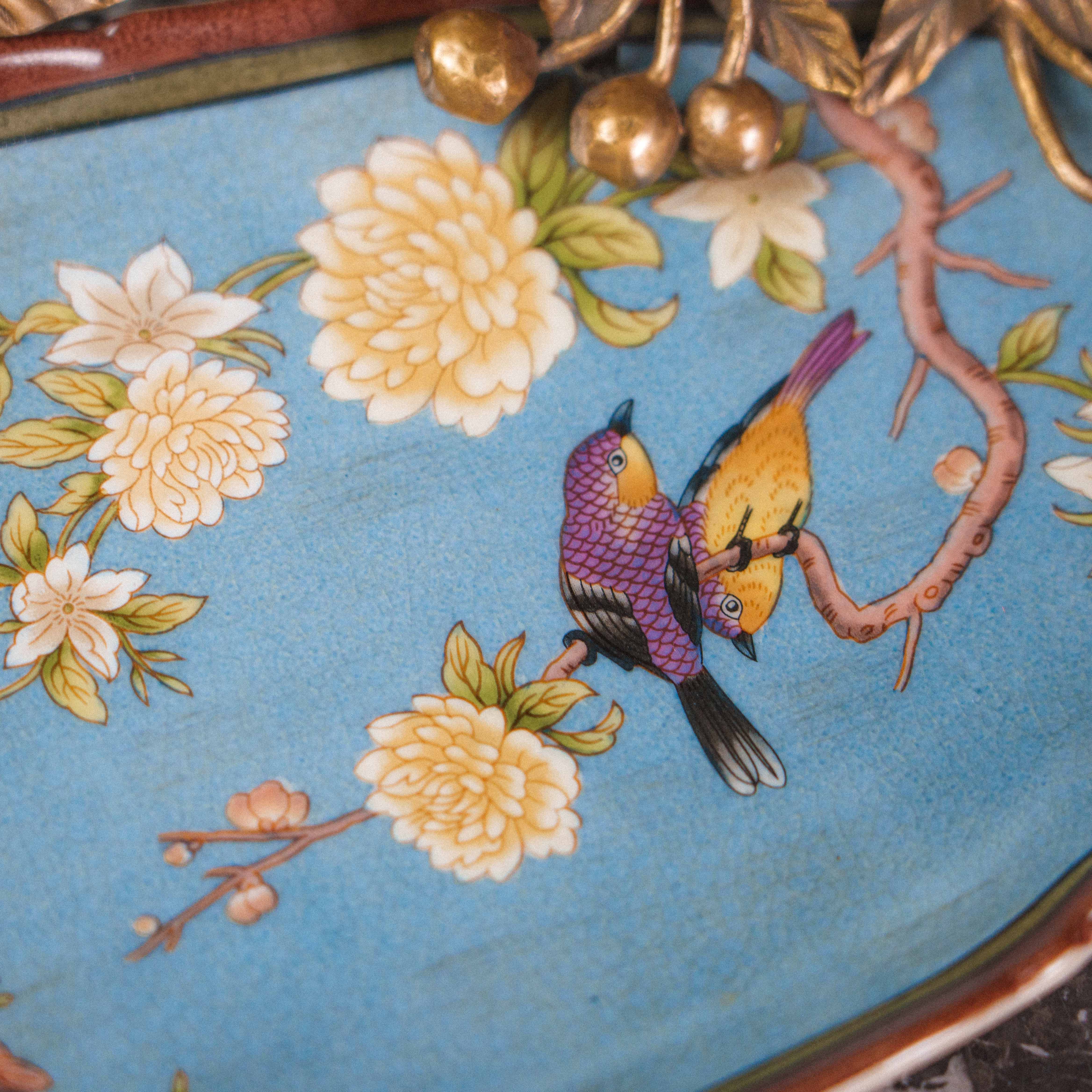 Изящная фруктовница в восточном стиле — предмет, в котором тонкость ручной росписи сочетается с поэтичной символикой природы. Фарфоровое блюдо небесно-голубого оттенка украшено живописными цветущими ветвями, птицами и хризантемами — символами радости, благополучия и долголетия. В центре композиции — объёмная декоративная ветвь из бронзы с утончёнными листьями и бутонами, на которой покоится фарфоровая цикада, воплощающая пробуждение и вечный цикл жизни. Каждая деталь продумана до мелочей: от плавных линий лепестков до лёгкого блеска позолоты, создающего игру света.