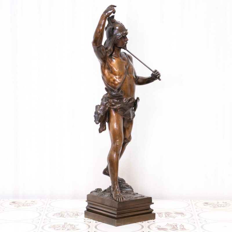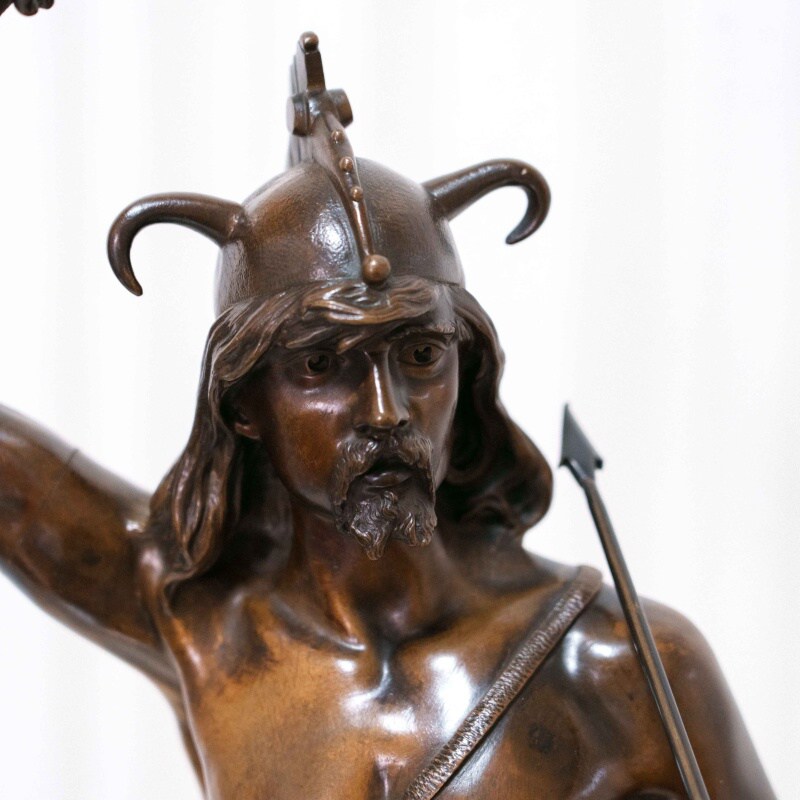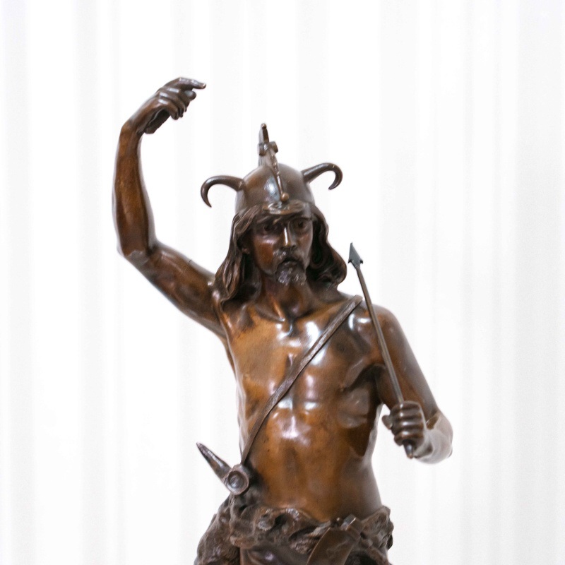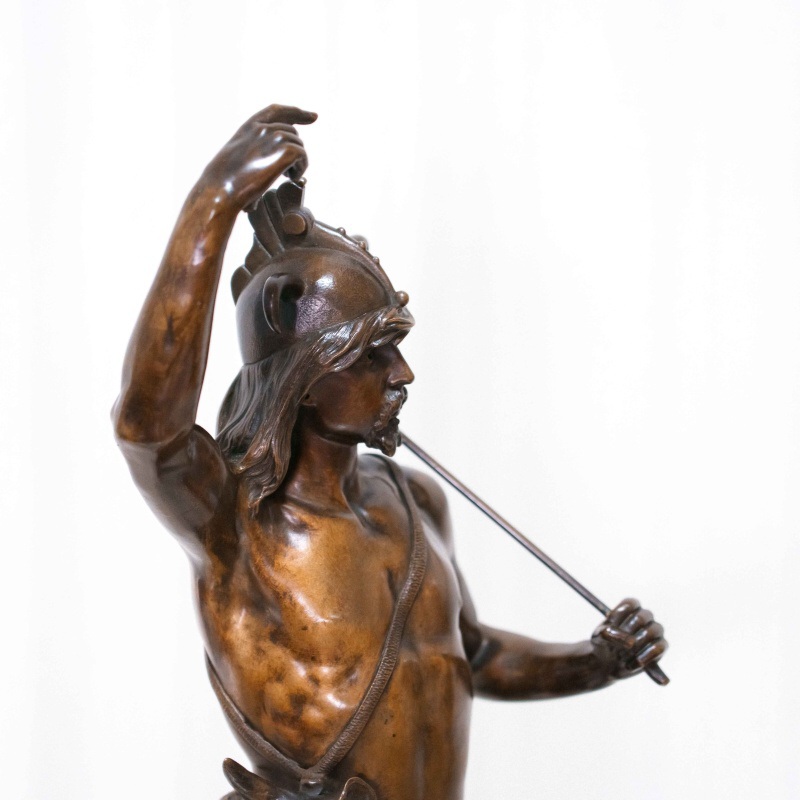 Монументальная бронзовая фигура изображает воина древних кельтских племён — галла, облачённого в характерный рогатый шлем и накидку из звериной шкуры. В руке он держит копьё, а другая рука поднята в энергичном жесте, словно он призывает к битве. Скульптор передал мощную пластику тела, упругость движений и решительность взгляда, создавая образ, наполненный героизмом и достоинством. На лице героя читается внутренняя сила и воля, а динамичная поза придаёт композиции торжественный ритм. Реалистичная трактовка анатомии сочетается с романтизированным пафосом, характерным для французского искусства II половины XIX века, когда тема античности и варварских народов вновь стала символом мужества и доблести.