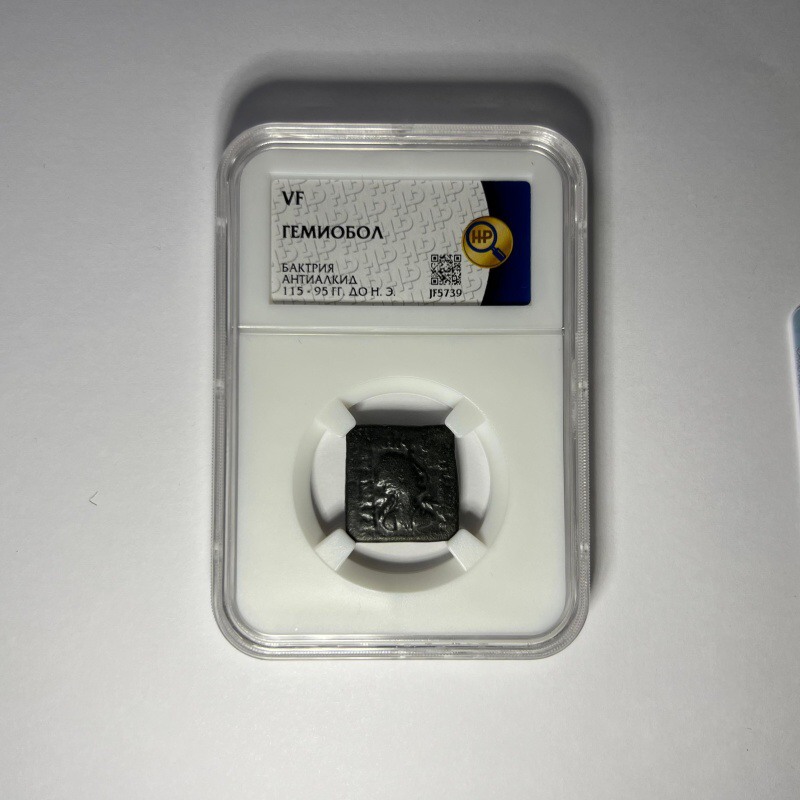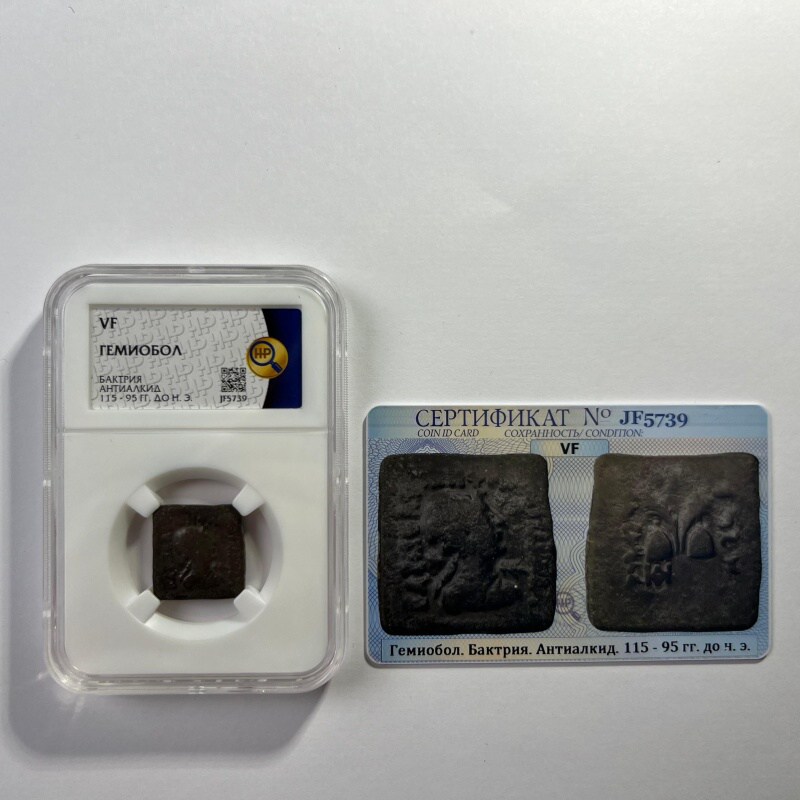 Происхождение Бактрия, Антиалкид, 1155 - 95 гг. до н.э. Оригинал с сертификатом подлинности. Уникальный номер сертификата подлинности – JF5739.