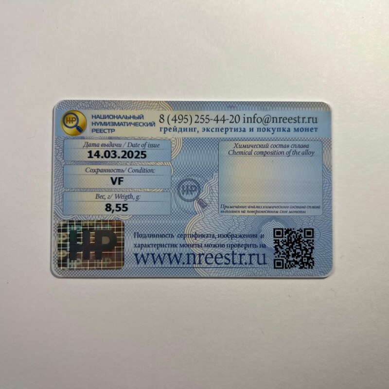 Монета имеет уникальный личный номер сертификата подлинности, информация о данном экземпляре находится в электронной в базе данных на сайте Национального Нумизматического Реестра, что гарантирует подлинность предмета.