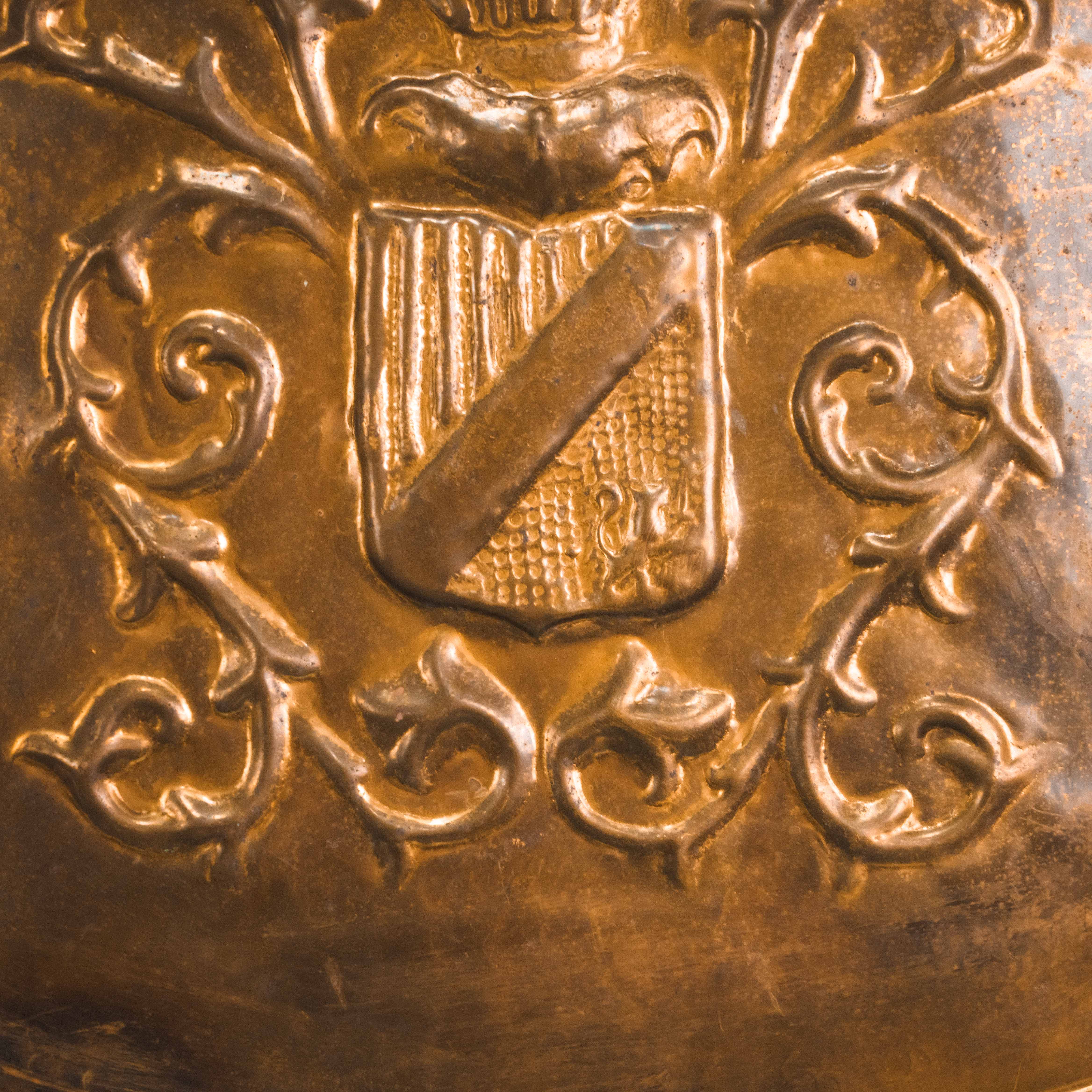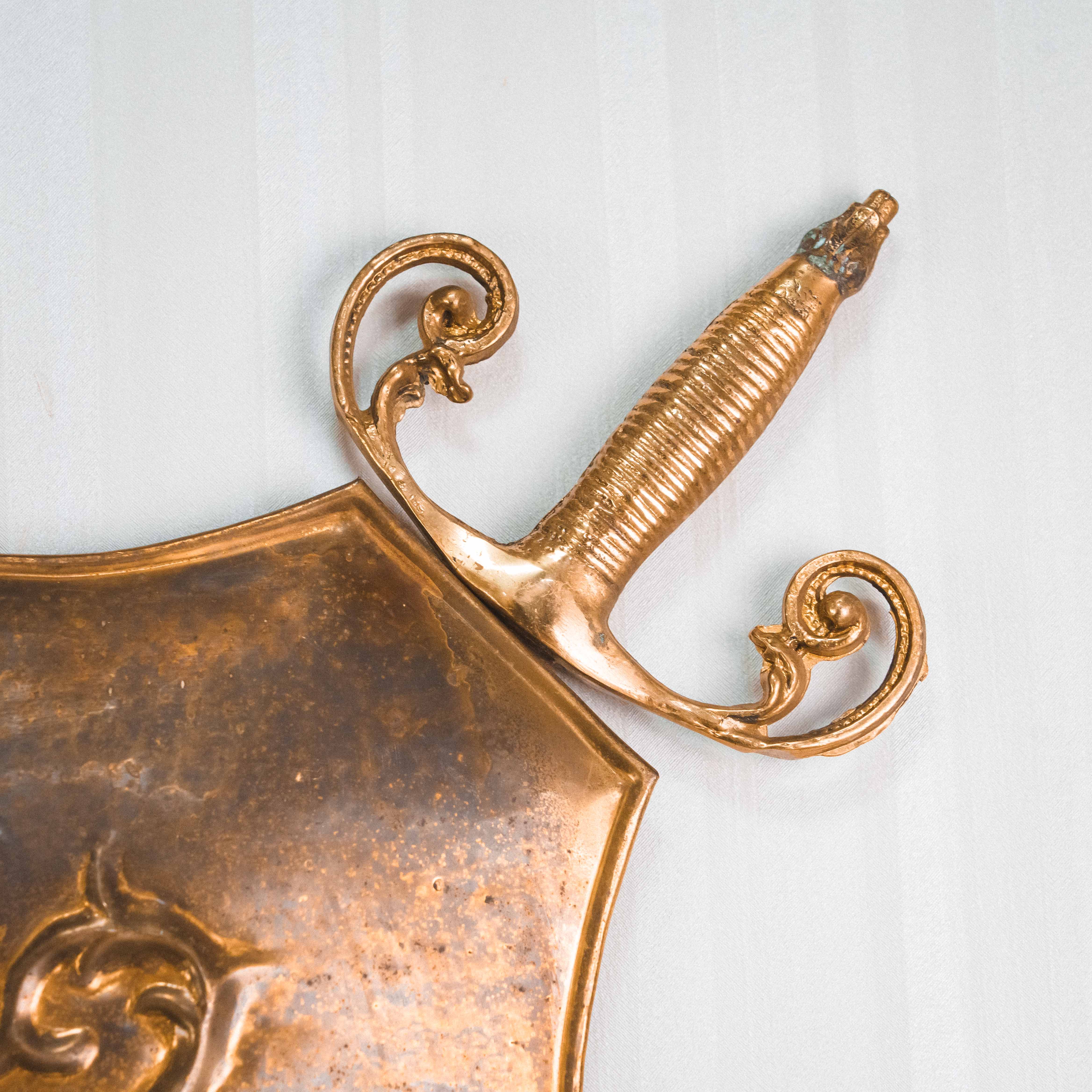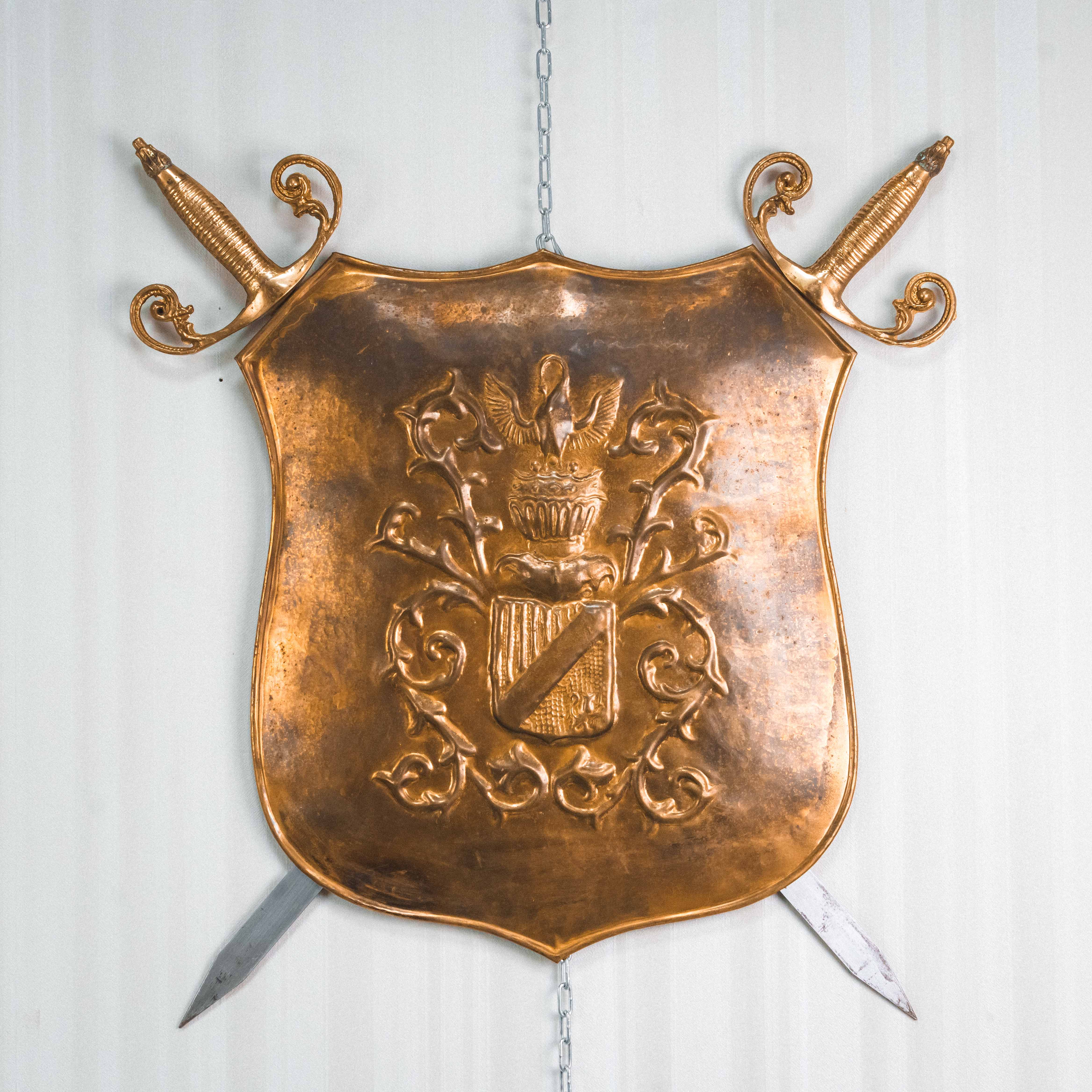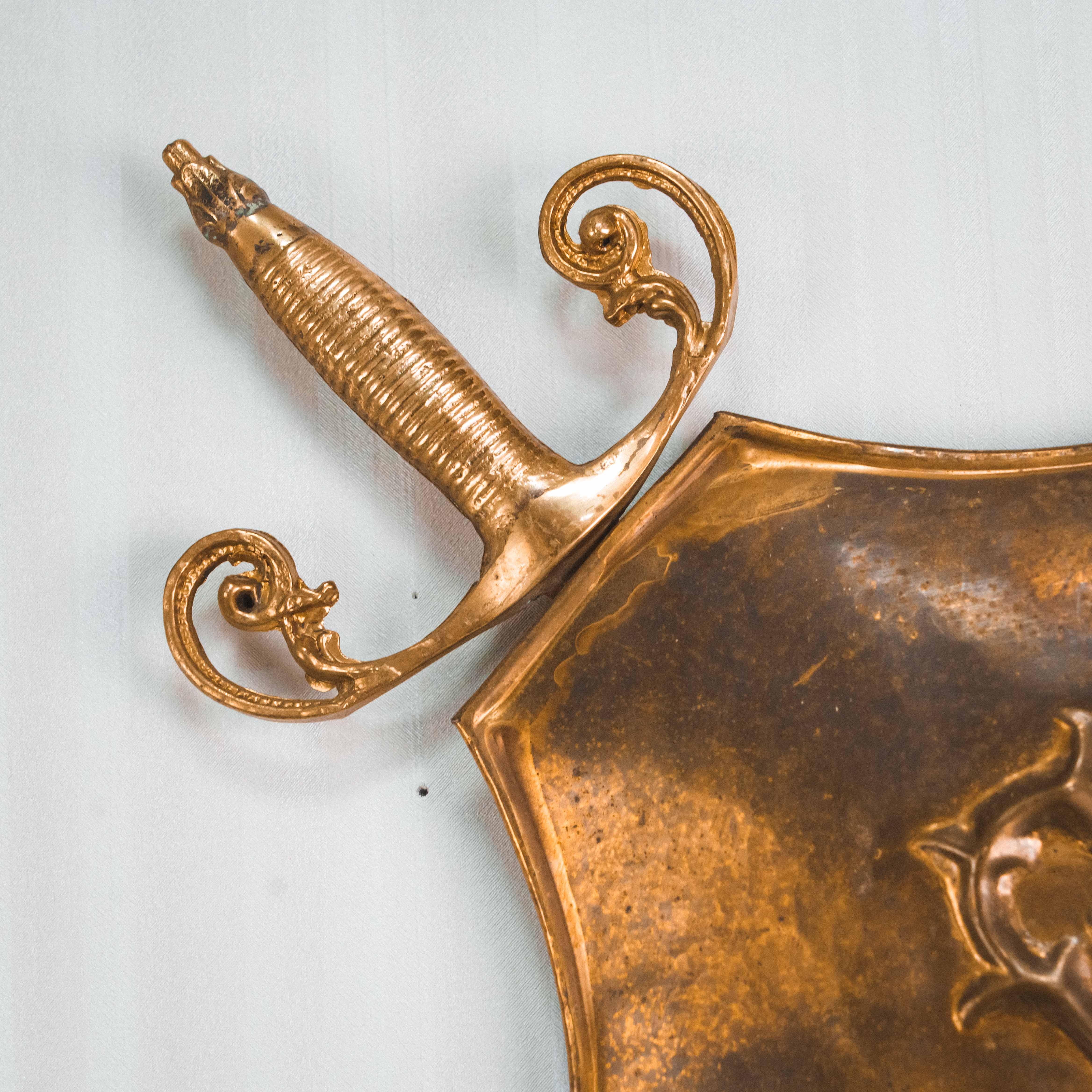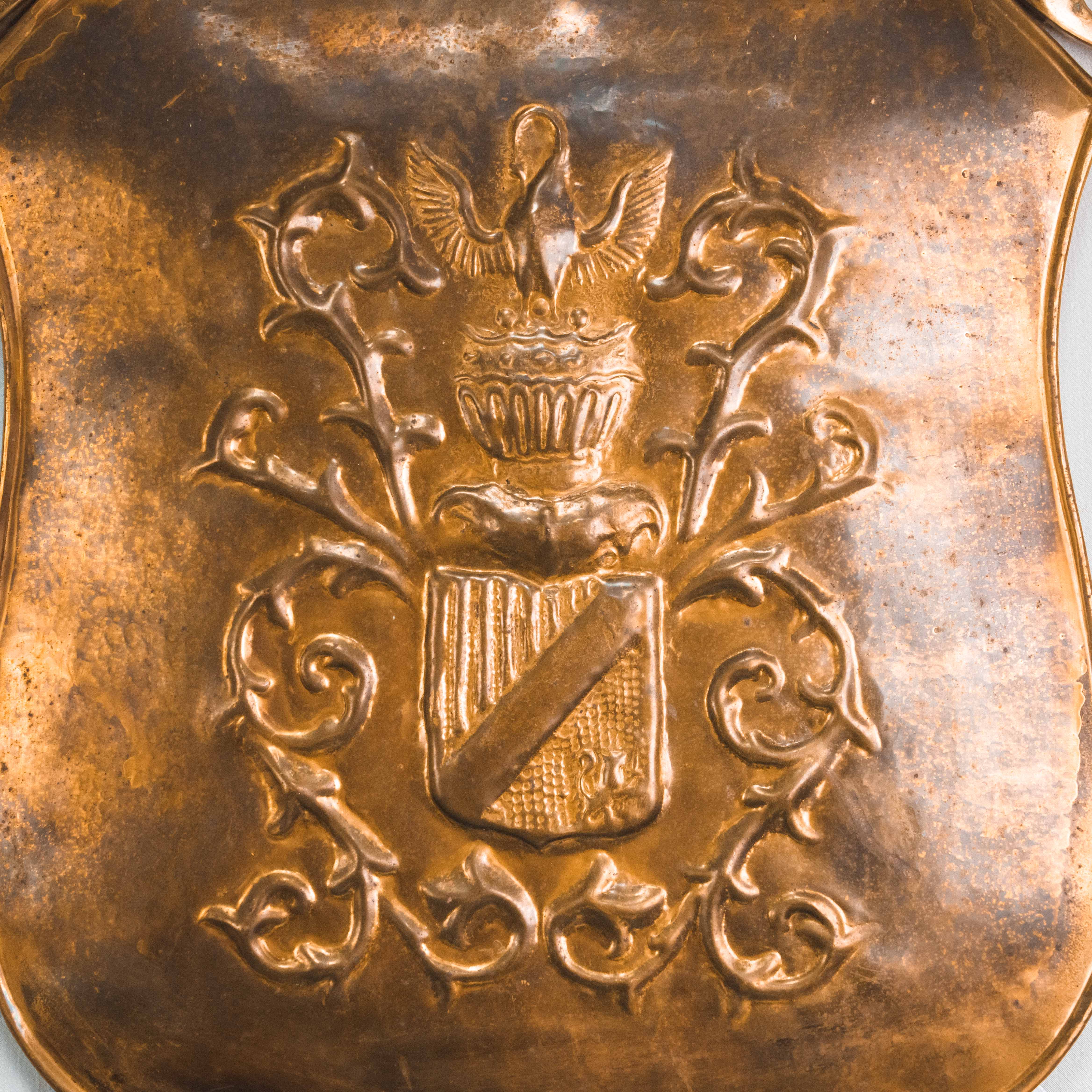 Поверхность меди покрыта благородной патиной, подчёркивающей возраст изделия и глубину чеканного рельефа. Подобные геральдические щиты использовались в оформлении охотничьих залов, кабинетов и парадных интерьеров загородных резиденций, служа символическим напоминанием о рыцарских идеалах, родовой истории и европейской воинской культуре.