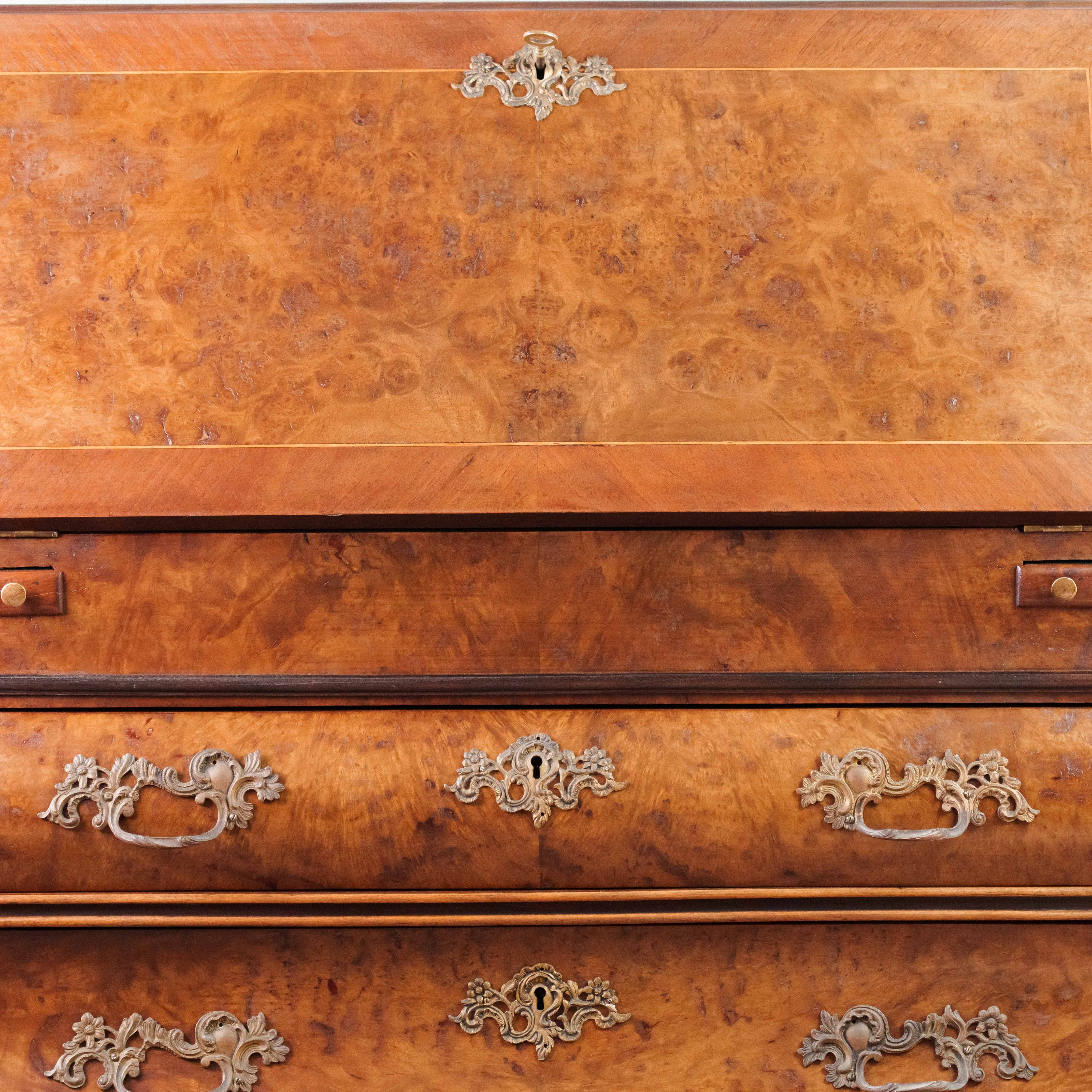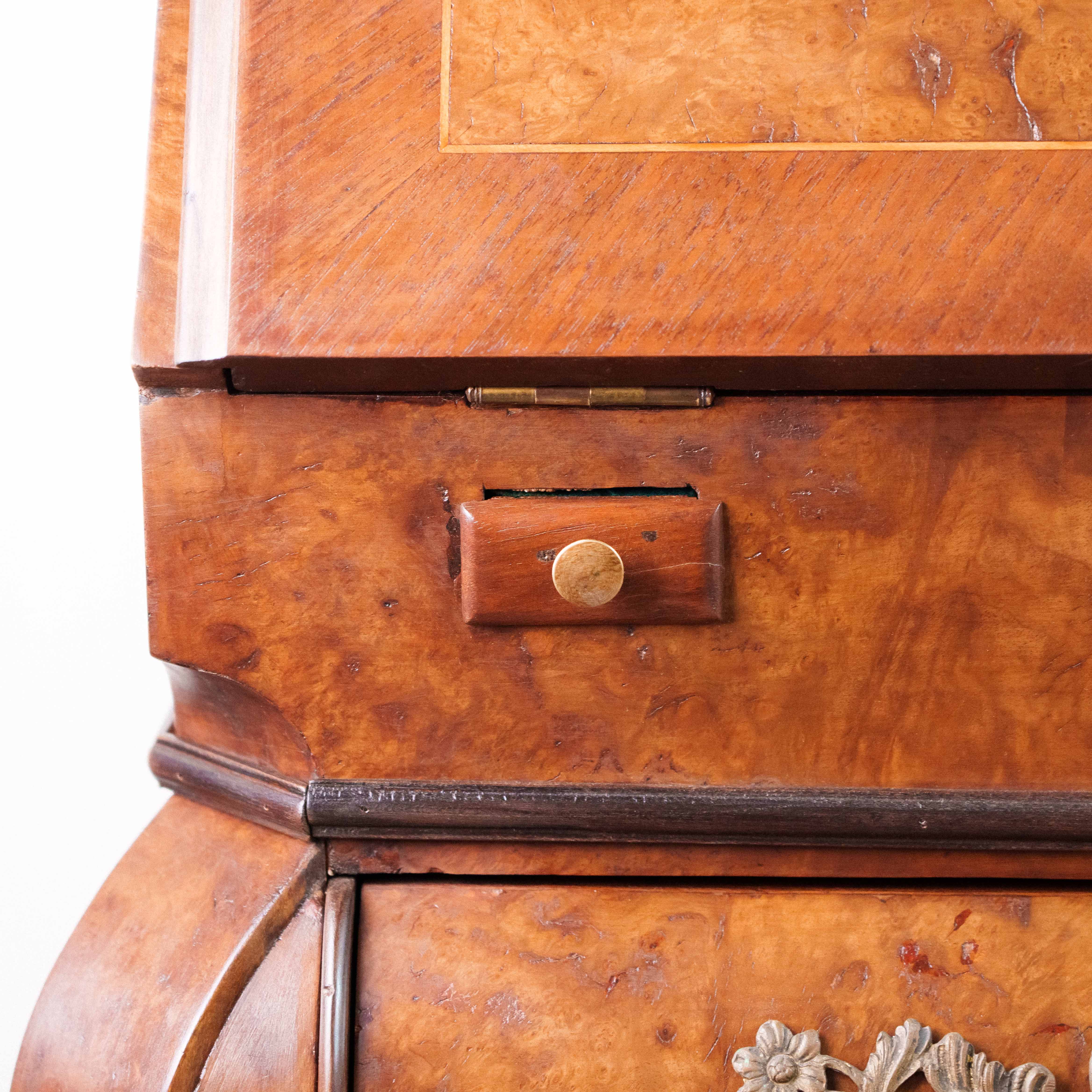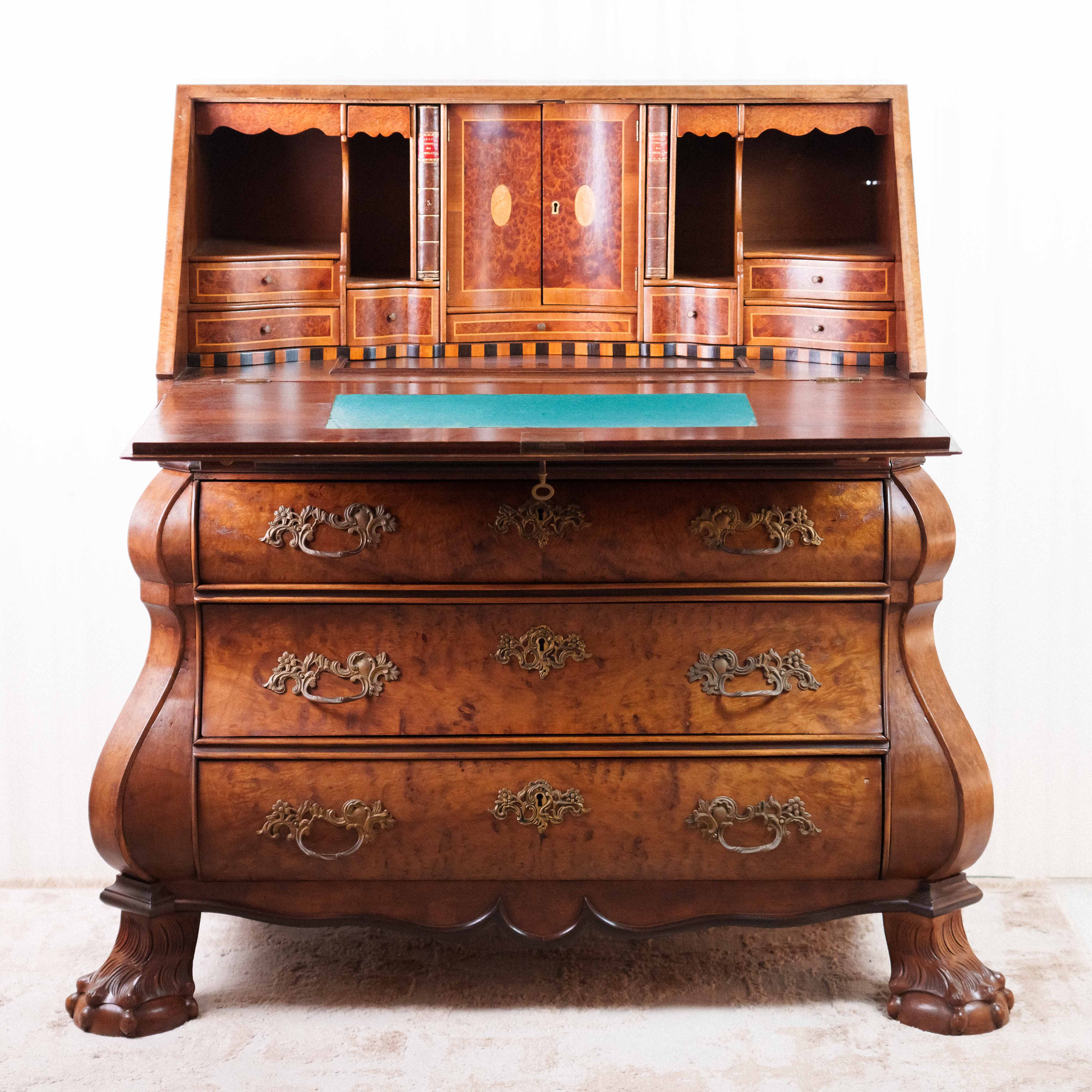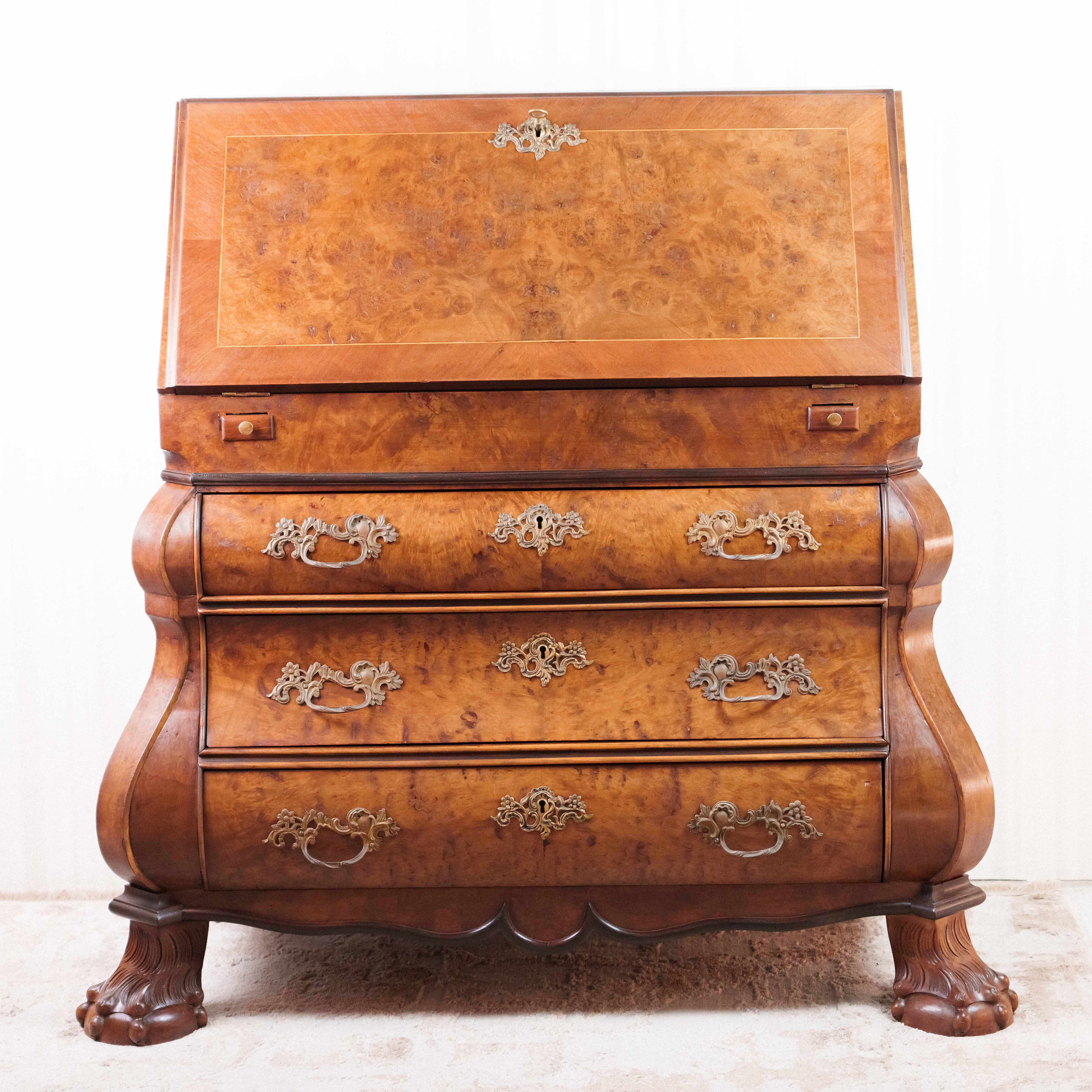 Голландский секретер выполнен в характерной для Нидерландов манере конца XVII — XVIII века и отличается выразительным, массивным силуэтом с плавно изогнутыми формами. Корпус изготовлен из массива дерева и облицован роскошным корнем ореха с насыщенным, теплым медово-карамельным оттенком. Природный рисунок шпона с живописными завитками и переливами придаёт поверхности глубину и благородство, подчёркивая высокое качество материалов и мастерство столяра. Верхняя часть представляет собой откидную крышку-пюпитр, которая в открытом виде служит удобной рабочей поверхностью, а в закрытом — формирует строгий и элегантный фасад. Ниже располагается система выдвижных ящиков, оформленных в традиционном голландском стиле: фасады слегка выгнуты, с мягкими волнообразными очертаниями, создающими ощущение пластичности и устойчивости. Секретер украшен изящной латунной фурнитурой — замочные накладки и ручки богато декорированы ажурным орнаментом, характерным для эпохи барокко, и эффектно контрастируют с тёплым тоном древесины. Основание опирается на массивные резные ножки, плавно переходящие в фигурный цоколь, что придаёт предмету солидность и завершённость. В целом секретер производит впечатление статусного, представительного предмета интерьера, сочетающего практичность, декоративную выразительность и подлинный дух голландского антикварного мебельного искусства.