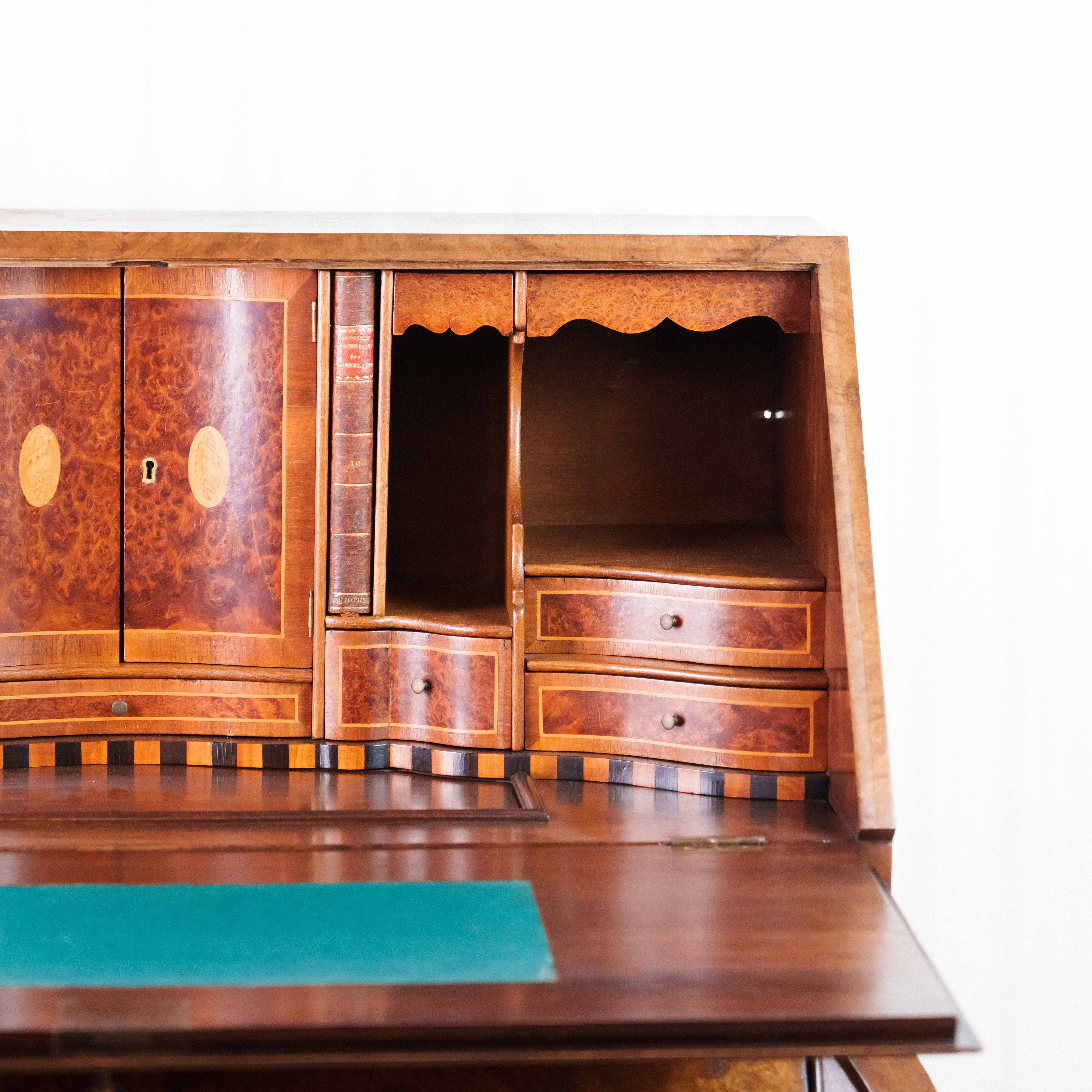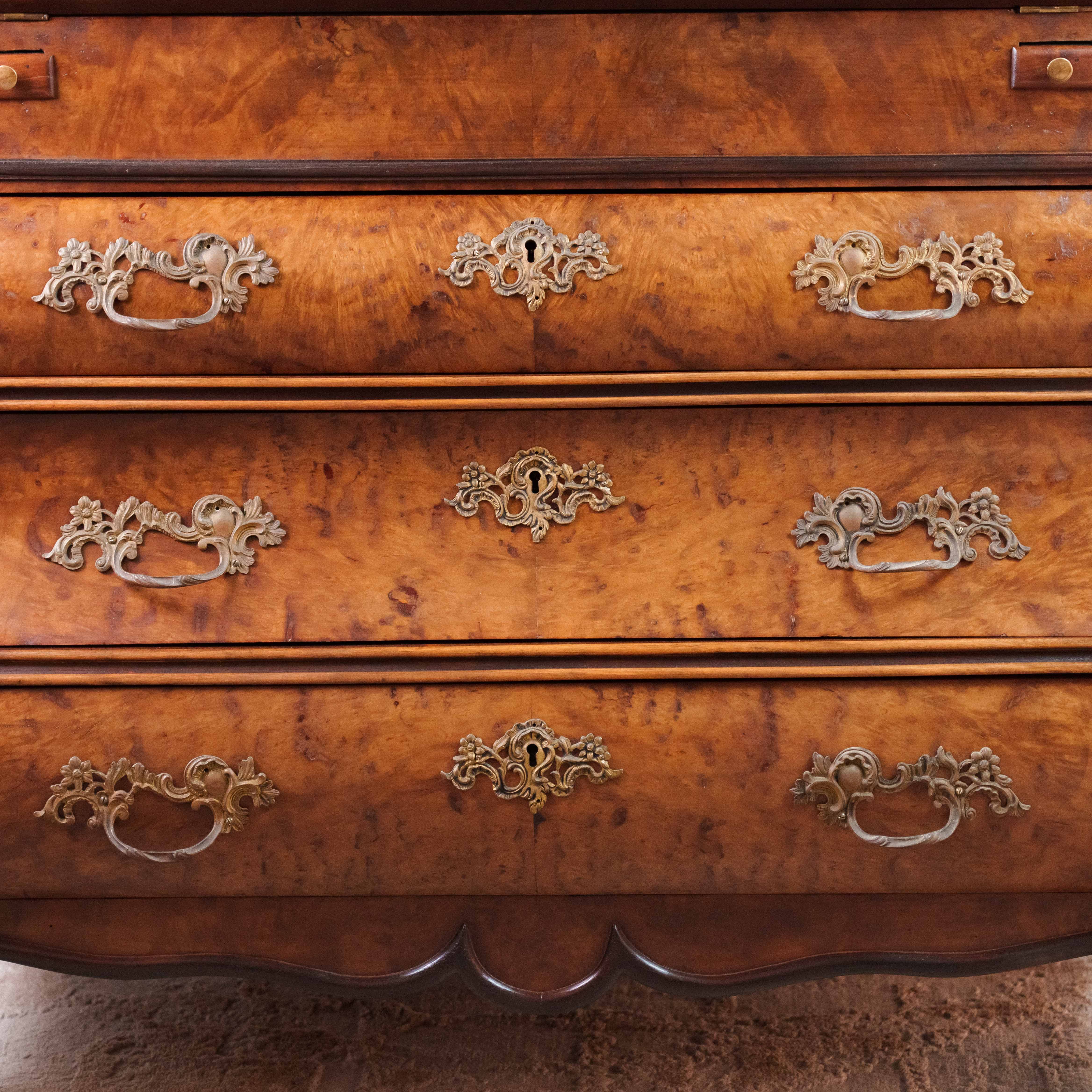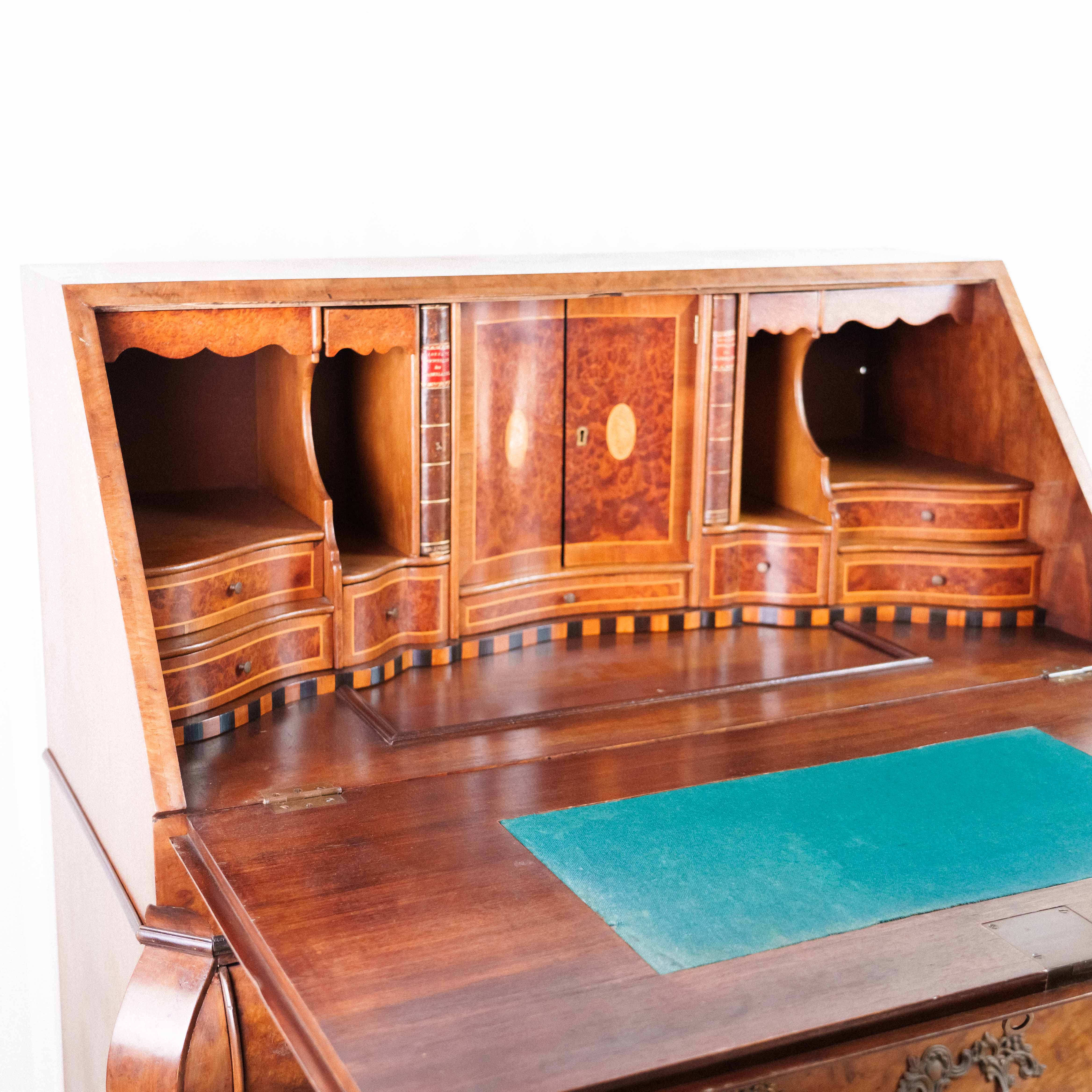 Голландский секретер выполнен в характерной для Нидерландов манере конца XVII — XVIII века и отличается выразительным, массивным силуэтом с плавно изогнутыми формами. Корпус изготовлен из массива дерева и облицован роскошным корнем ореха с насыщенным, теплым медово-карамельным оттенком. Природный рисунок шпона с живописными завитками и переливами придаёт поверхности глубину и благородство, подчёркивая высокое качество материалов и мастерство столяра. Верхняя часть представляет собой откидную крышку-пюпитр, которая в открытом виде служит удобной рабочей поверхностью, а в закрытом — формирует строгий и элегантный фасад. Ниже располагается система выдвижных ящиков, оформленных в традиционном голландском стиле: фасады слегка выгнуты, с мягкими волнообразными очертаниями, создающими ощущение пластичности и устойчивости. Секретер украшен изящной латунной фурнитурой — замочные накладки и ручки богато декорированы ажурным орнаментом, характерным для эпохи барокко, и эффектно контрастируют с тёплым тоном древесины. Основание опирается на массивные резные ножки, плавно переходящие в фигурный цоколь, что придаёт предмету солидность и завершённость. В целом секретер производит впечатление статусного, представительного предмета интерьера, сочетающего практичность, декоративную выразительность и подлинный дух голландского антикварного мебельного искусства.