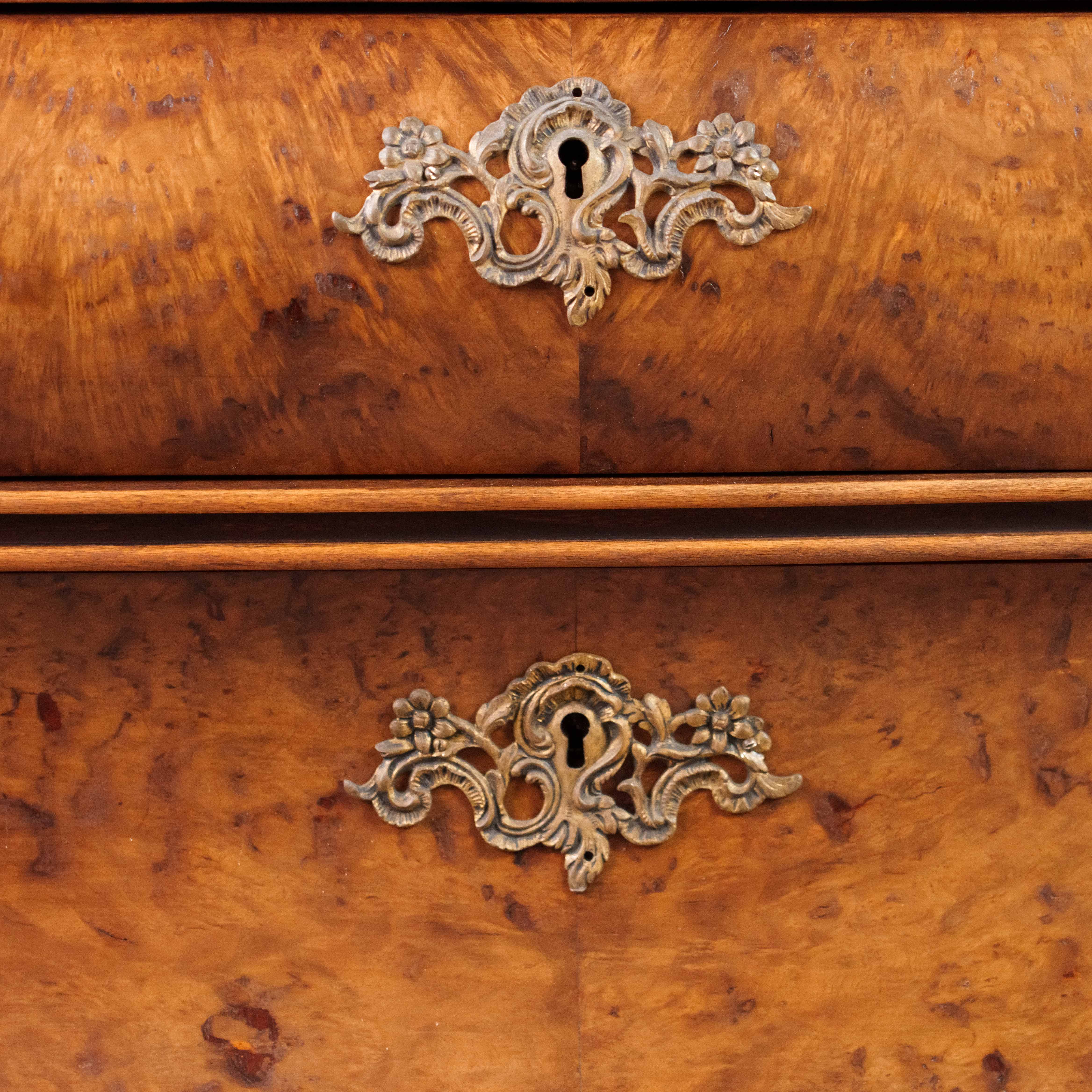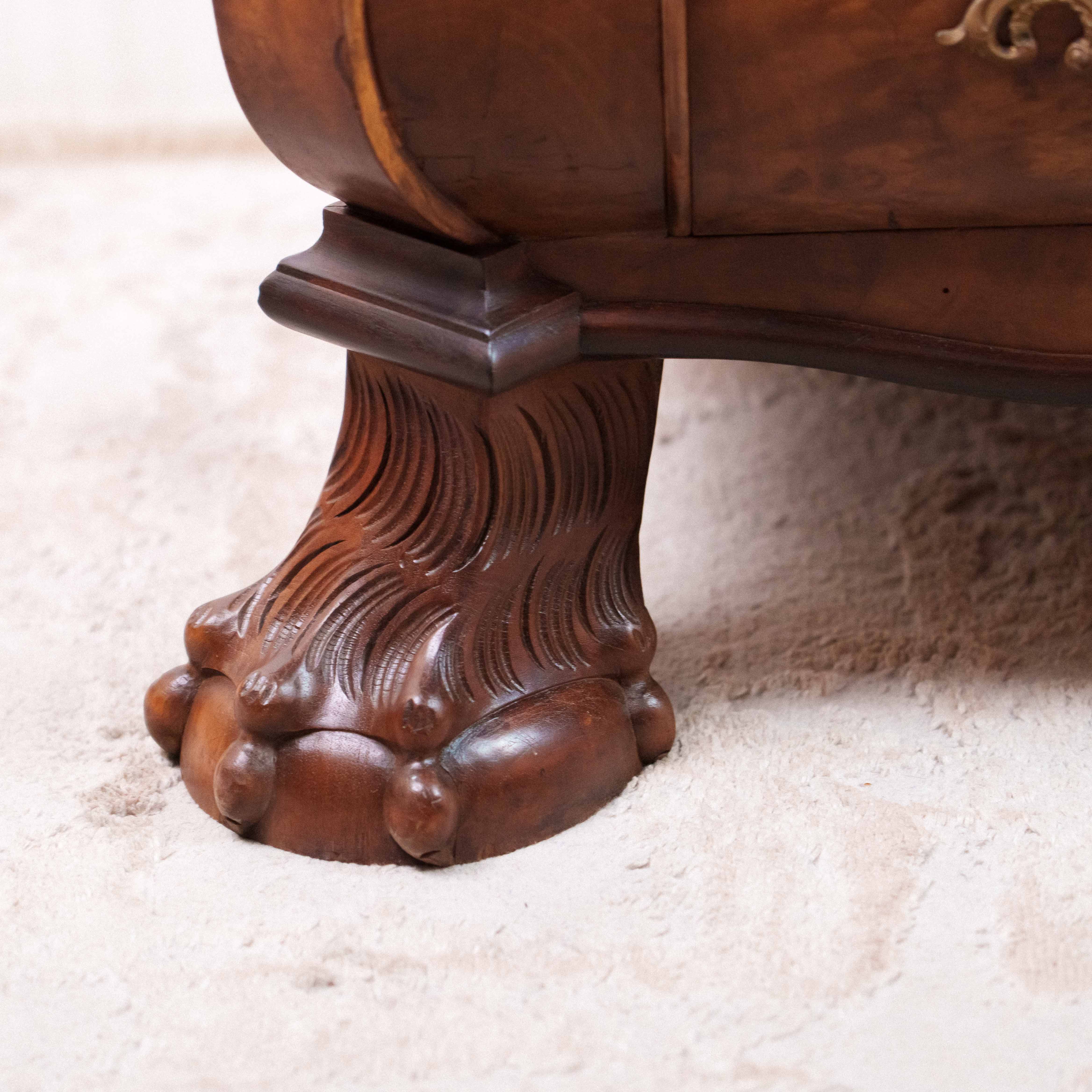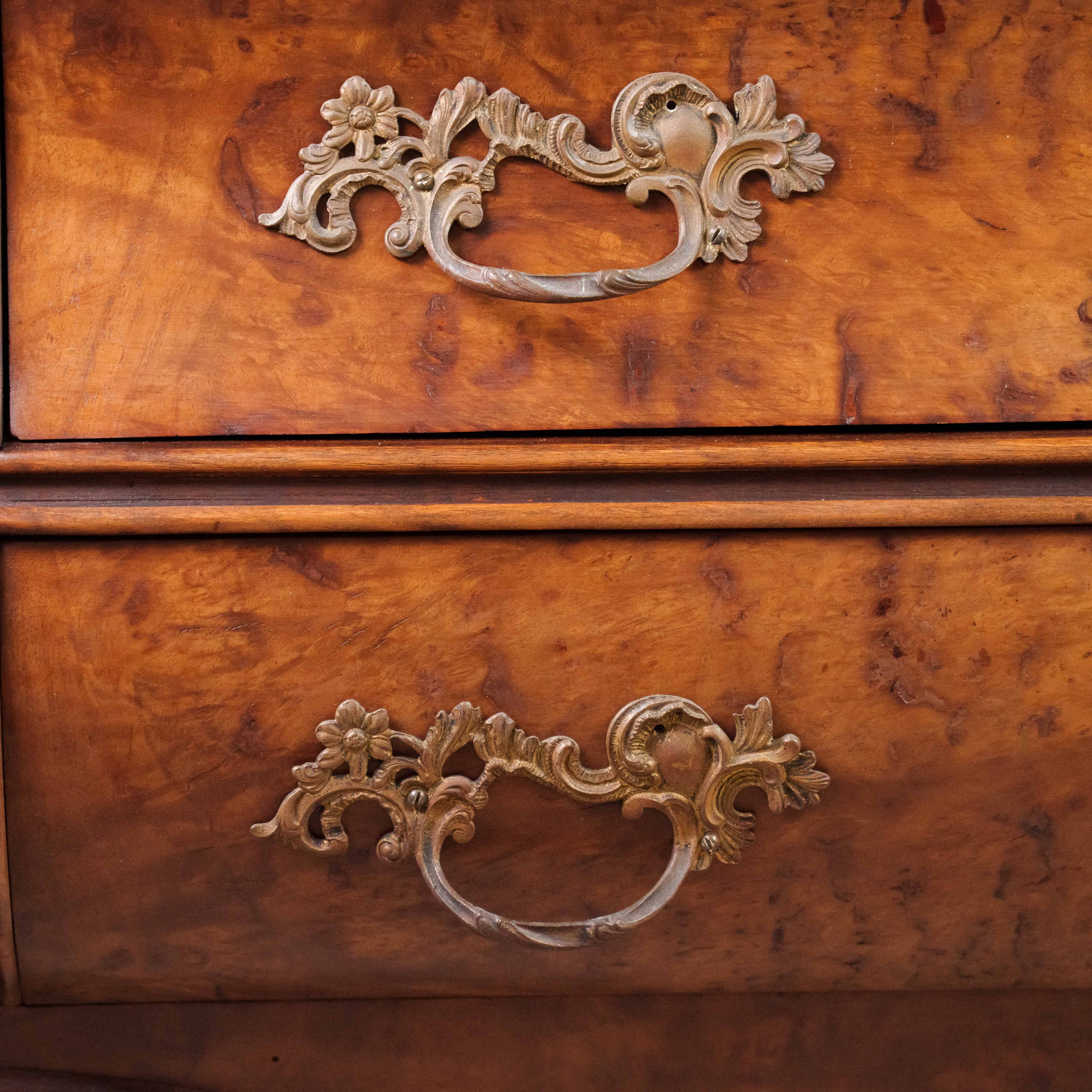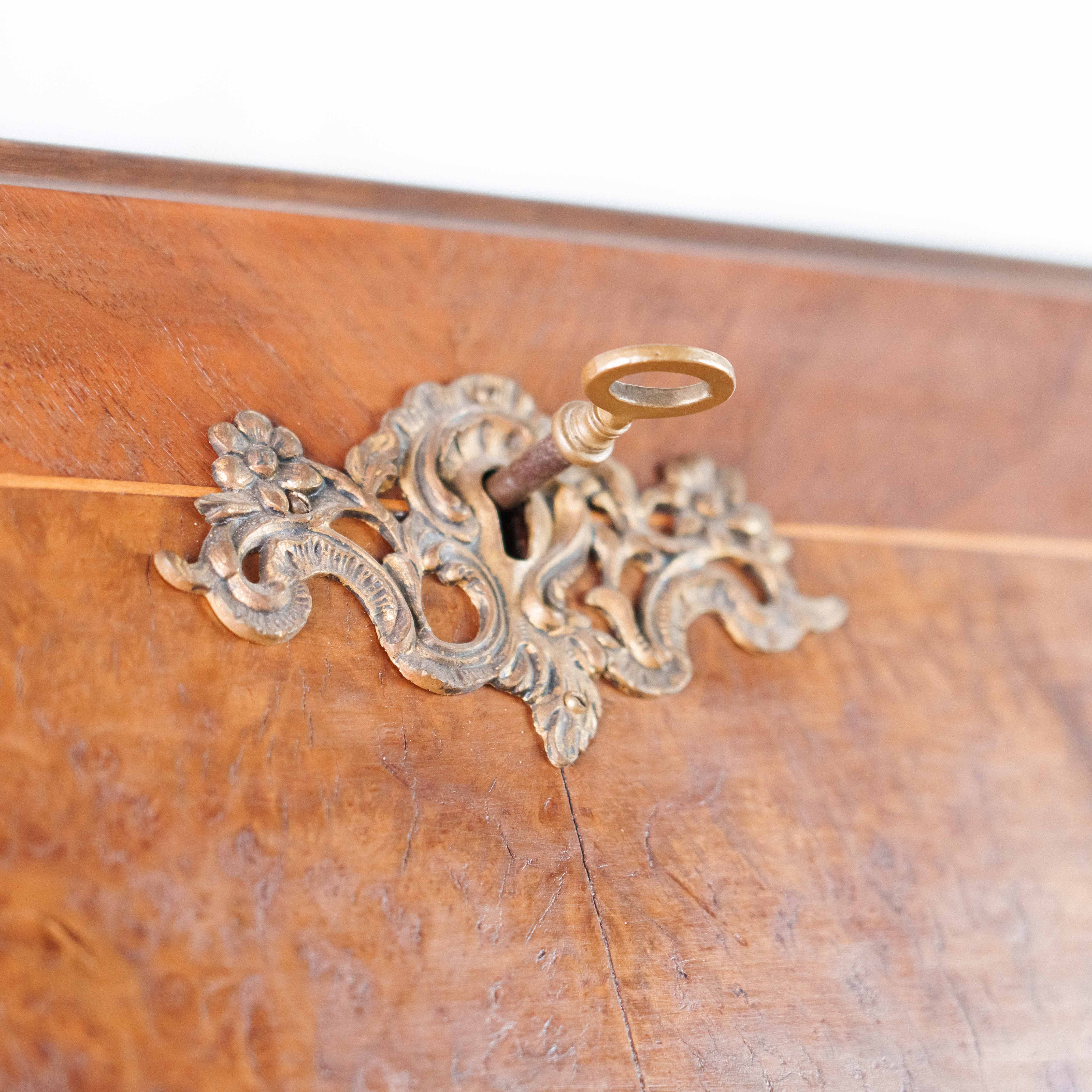Голландский секретер выполнен в характерной для Нидерландов манере конца XVII — XVIII века и отличается выразительным, массивным силуэтом с плавно изогнутыми формами. Корпус изготовлен из массива дерева и облицован роскошным корнем ореха с насыщенным, теплым медово-карамельным оттенком. Природный рисунок шпона с живописными завитками и переливами придаёт поверхности глубину и благородство, подчёркивая высокое качество материалов и мастерство столяра. Верхняя часть представляет собой откидную крышку-пюпитр, которая в открытом виде служит удобной рабочей поверхностью, а в закрытом — формирует строгий и элегантный фасад. Ниже располагается система выдвижных ящиков, оформленных в традиционном голландском стиле: фасады слегка выгнуты, с мягкими волнообразными очертаниями, создающими ощущение пластичности и устойчивости. Секретер украшен изящной латунной фурнитурой — замочные накладки и ручки богато декорированы ажурным орнаментом, характерным для эпохи барокко, и эффектно контрастируют с тёплым тоном древесины. Основание опирается на массивные резные ножки, плавно переходящие в фигурный цоколь, что придаёт предмету солидность и завершённость. В целом секретер производит впечатление статусного, представительного предмета интерьера, сочетающего практичность, декоративную выразительность и подлинный дух голландского антикварного мебельного искусства.