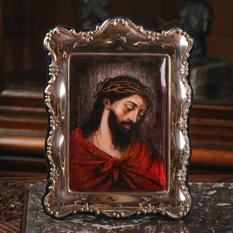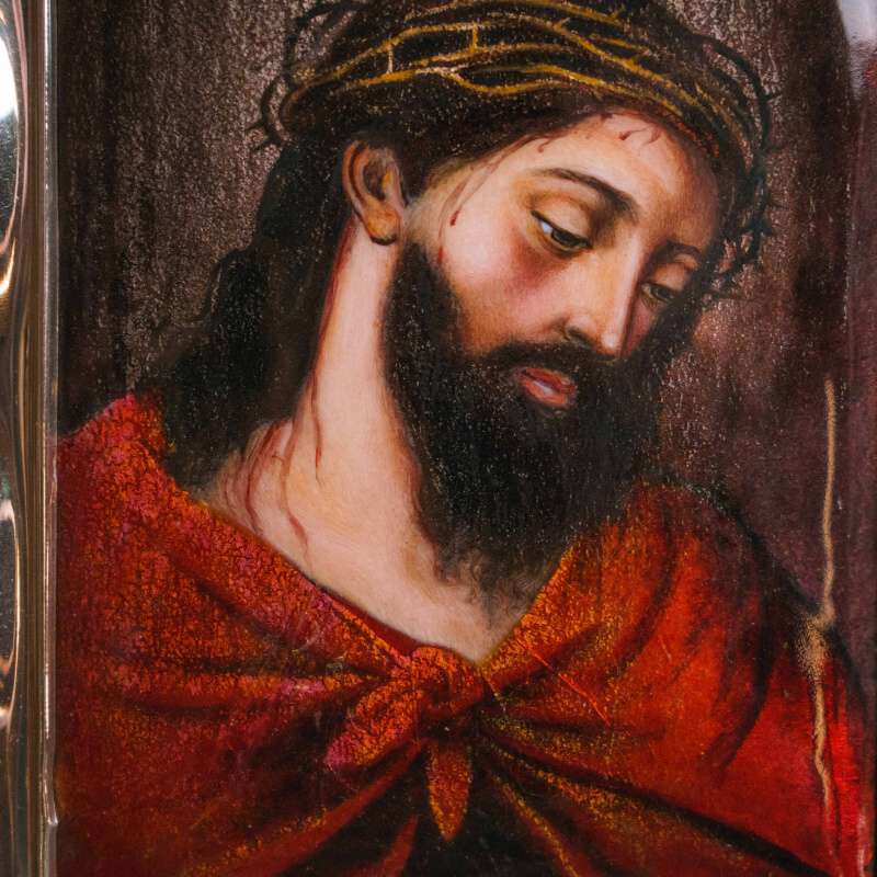 Высокохудожественный образ «Христос в терновом венце» исполнен в технике росписи цветными эмалями по металлу — одной из наиболее сложных и изысканных декоративных техник. Многослойные эмали, последовательно нанесённые и обожжённые, создают глубину тона, прозрачность переходов и характерное стекловидное сияние поверхности.