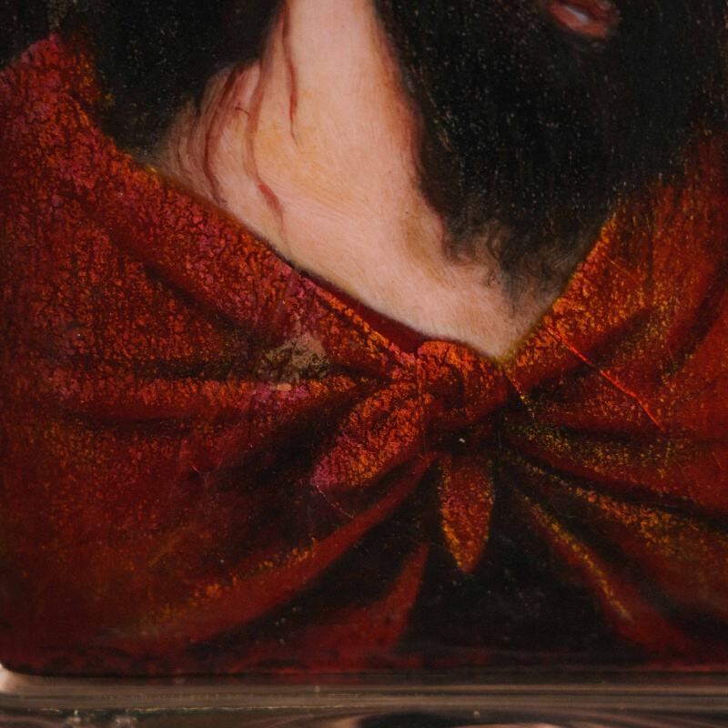 Композицию обрамляет серебряный оклад элегантной барочной формы с рельефным растительным декором. На окладе имеется клеймо итальянской ювелирной системы «665 FI», соответствующее мастерской FANI ARGENTI ANTICHI E MODERNI SRL из Флоренции, известной своими изделиями из серебра, объединяющими традиционные ремесленные техники и современную художественную обработку металла. Их оклады отличаются утончённой пластикой, гармоничной композицией и высоким качеством серебряного литья.