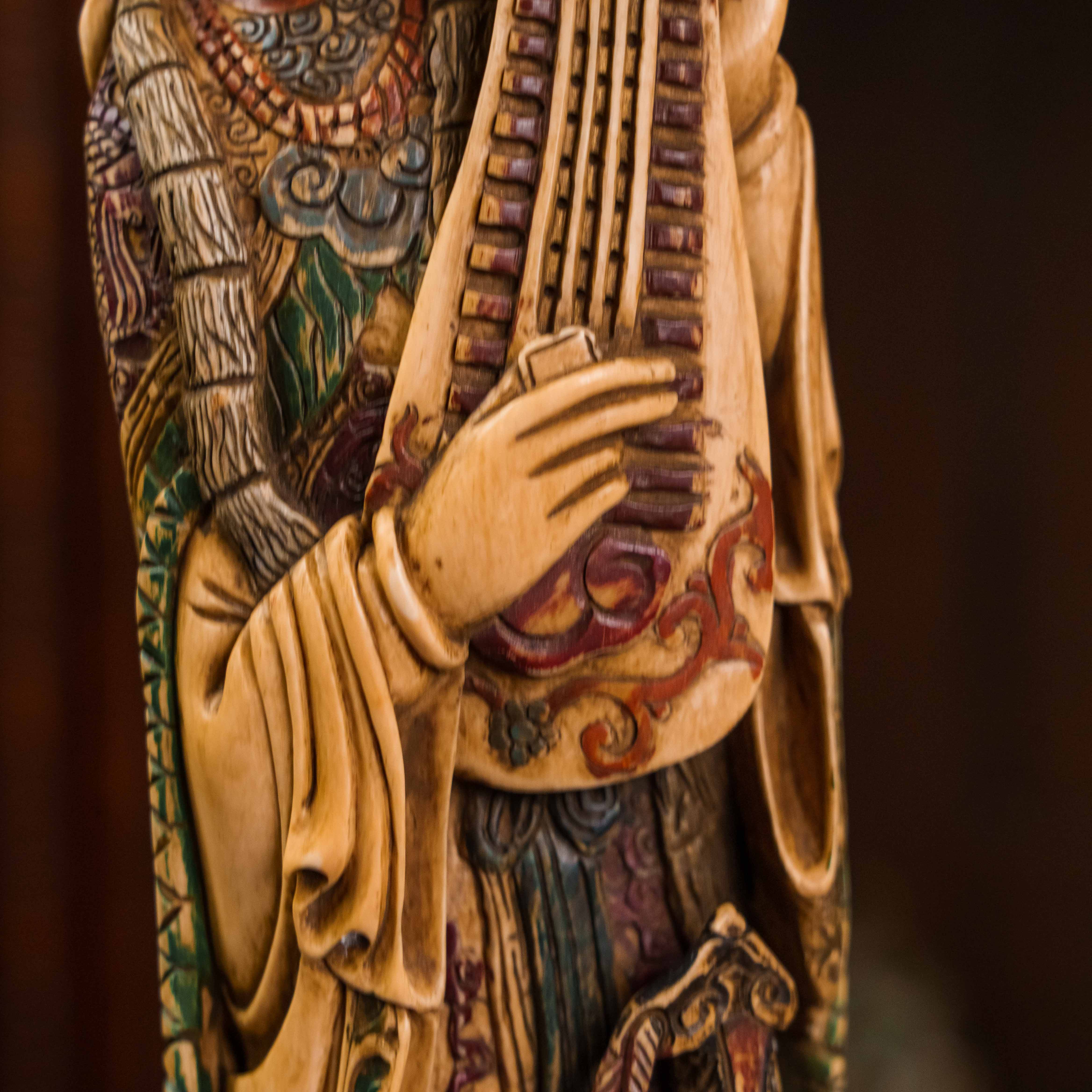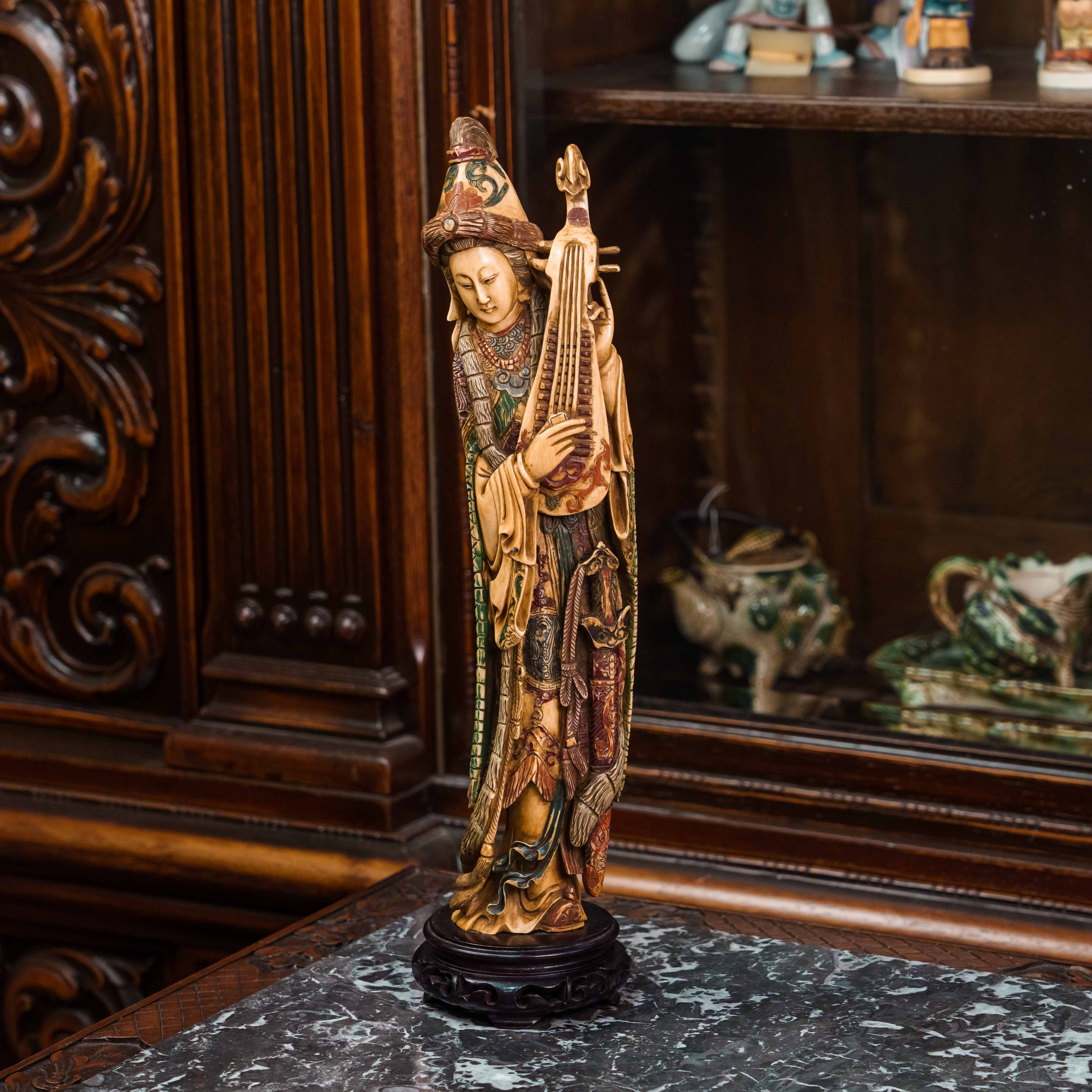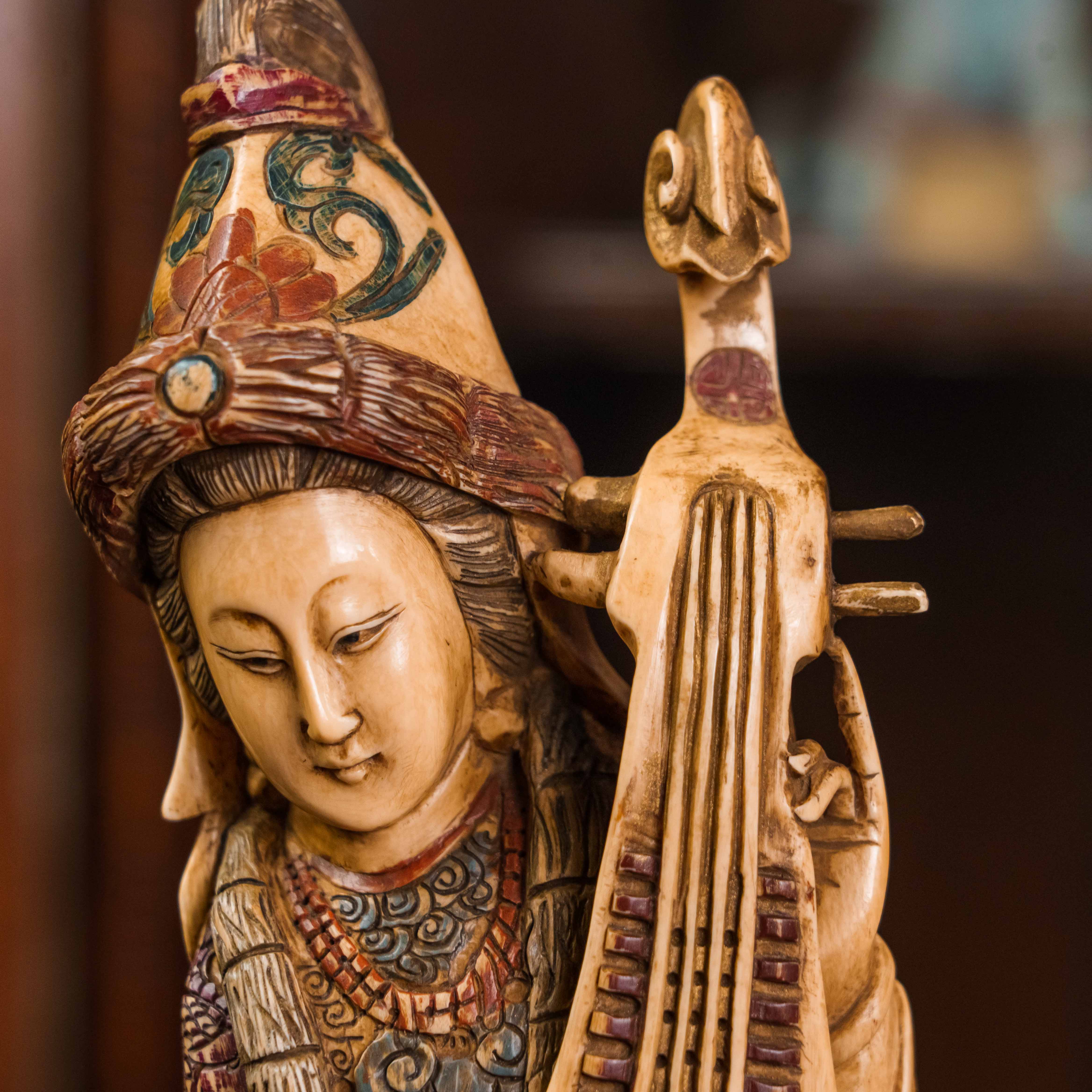 В китайской культуре императрица считалась «матерью нации» и образцом для подражания, а ее великолепное одеяние было внешним отражением ее возвышенного положения при дворе. Символом императрицы — Птица Феникс — символ возрождения, солнечного света и тепла, лета и огня. Пипа — древний китайский щипковый музыкальный инструмент, похожий на лютню, история которого насчитывает более 2000 лет. В китайской культуре пипа играет важную роль как в классической, так и в народной музыке. Она символизирует гармонию, красоту и искусство. Традиционное китайское одеяние ханьфу, как показано на статуэтке, несет в себе богатую символику, отражающую философию, эстетику и социальный статус. Сложный головной убор символизировал ранг и положение в обществе. В женских нарядах знати часто использовалась «корона феникса» (фэнгуань), которую носили на официальных церемониях.