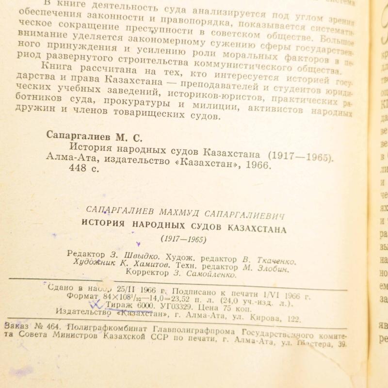 Автор: Сапаргалиев Махмуд Сапаргалиевич (1910–1970) — видный ученый-юрист, кандидат юридических наук, бывший министр внутренних дел и министр торговли КазССР. Книга охватывает почти полувековой период — от революционных событий 1917 года до периода «оттепели» середины 1960-х. Автор рассматривает деятельность судов через призму укрепления правопорядка и борьбы с преступностью в советском обществе. Исследуется переход от традиционных институтов (таких как суд биев) к советской модели народного судопроизводства. Особое внимание уделено формам гражданского участия в правосудии — народным дружинам и товарищеским судам, а также усилению роли моральных факторов в воспитании граждан.