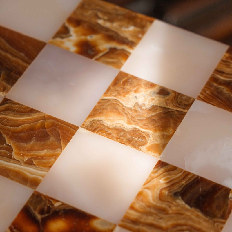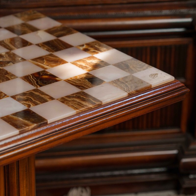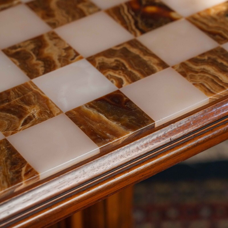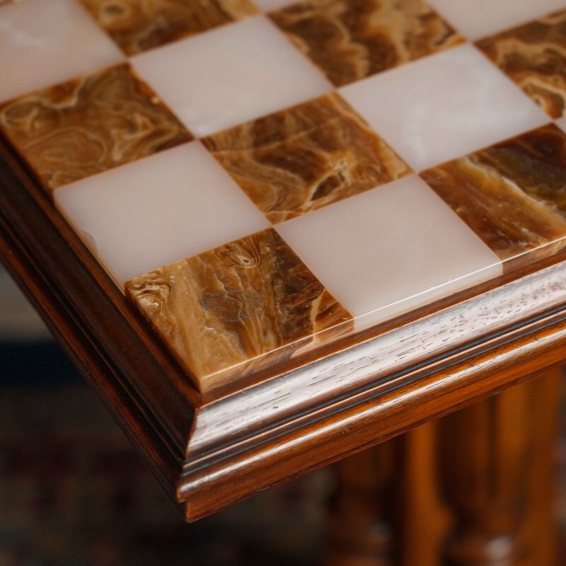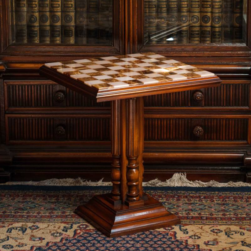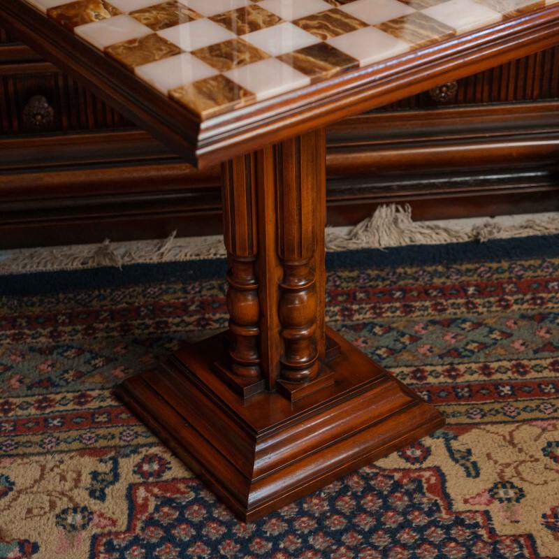 Шахматный столик выполнен в классическом стиле и отличается изысканным сочетанием натуральных материалов. Столешница изготовлена из оникса, образуя шахматное поле с чередующимися светлыми и тёмными клетками, что придаёт изделию утончённый и благородный вид. Опора состоит из четырёх фигурно точёных деревянных колонн, установленных на массивное многоуровневое основание, обеспечивающее устойчивость конструкции.