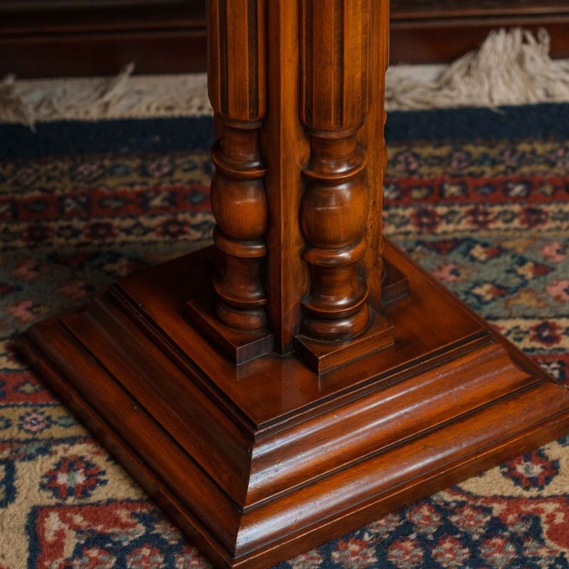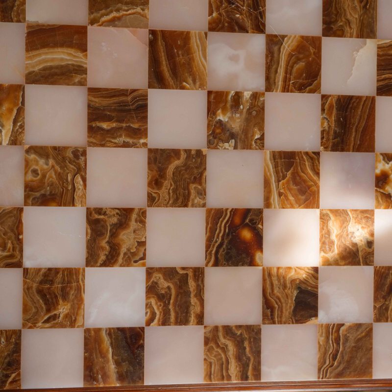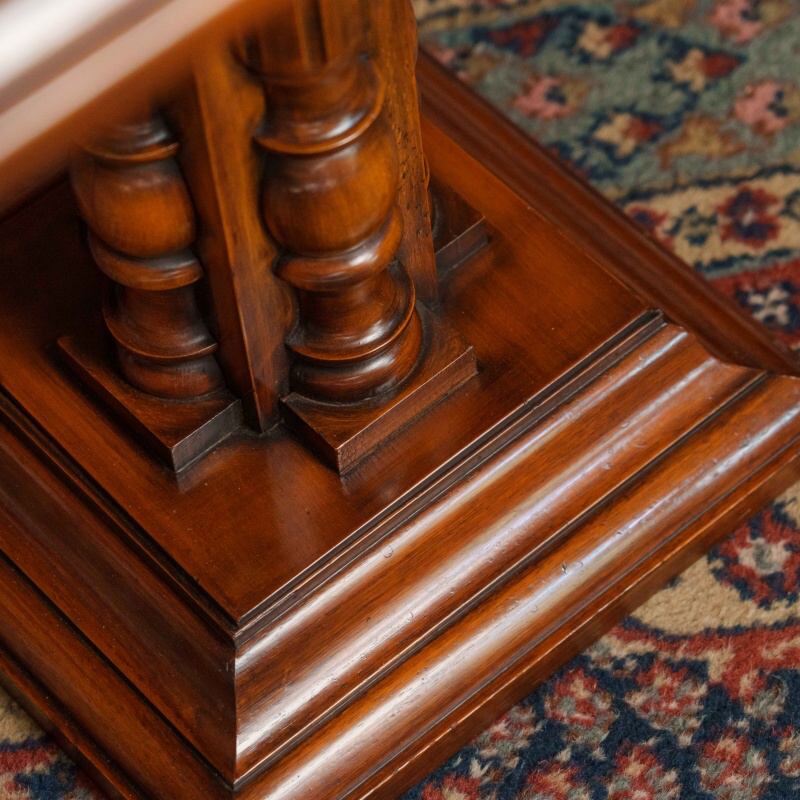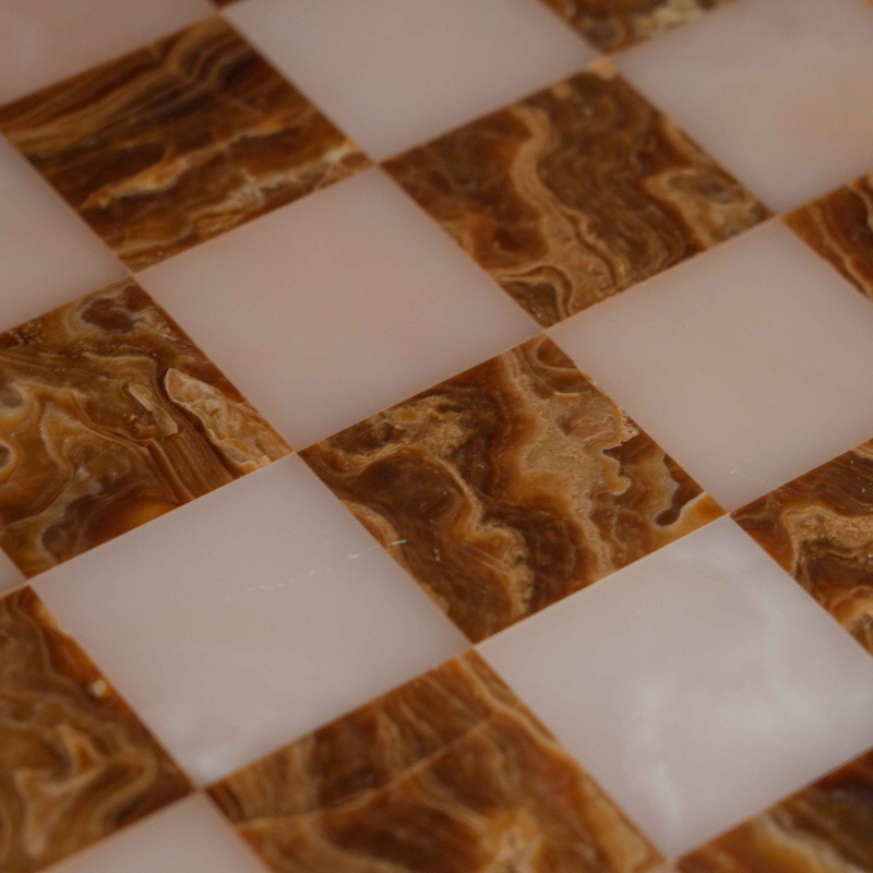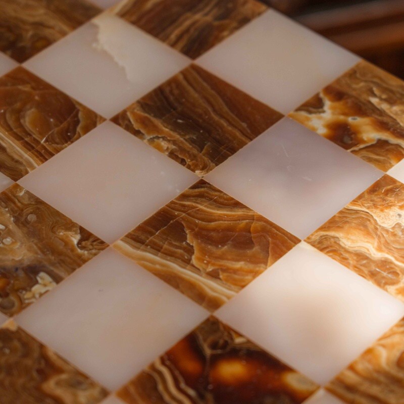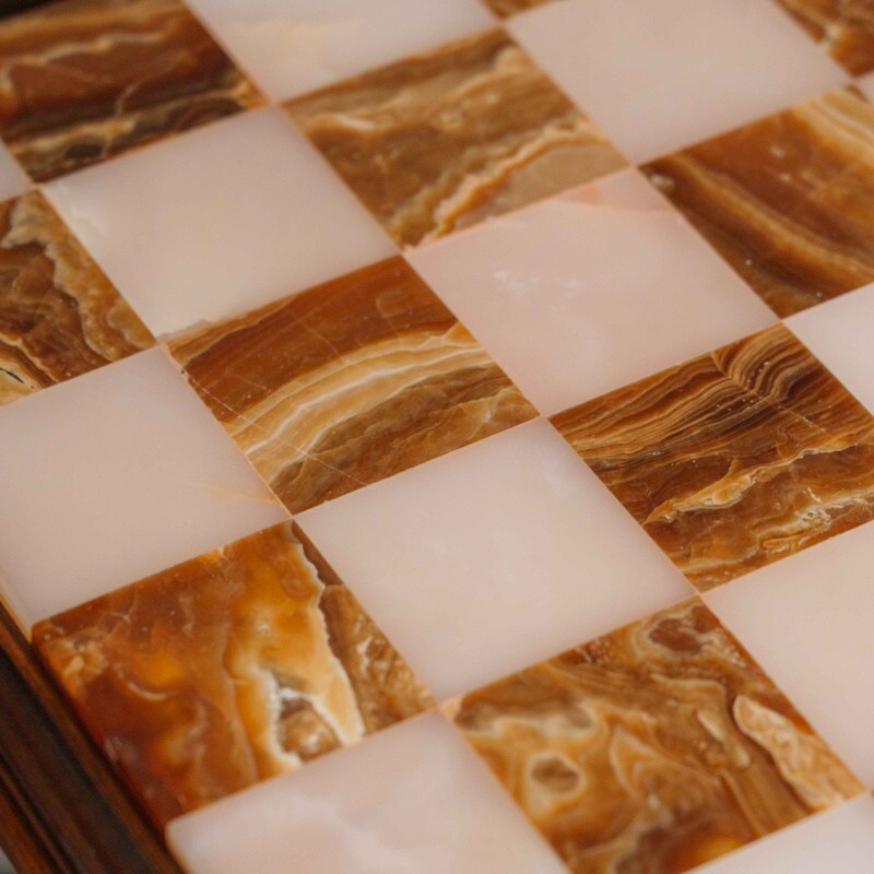 Шахматный столик выполнен в классическом стиле и отличается изысканным сочетанием натуральных материалов. Столешница изготовлена из оникса, образуя шахматное поле с чередующимися светлыми и тёмными клетками, что придаёт изделию утончённый и благородный вид. Опора состоит из четырёх фигурно точёных деревянных колонн, установленных на массивное многоуровневое основание, обеспечивающее устойчивость конструкции.