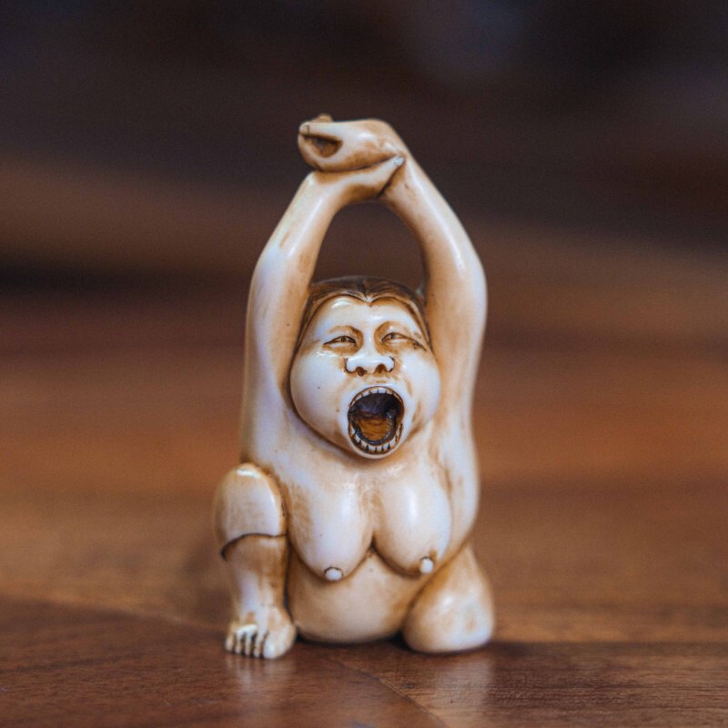 В данной миниатюре Дарума представлен в необычной, ироничной трактовке — в момент пробуждения после долгой медитации. Жест потягивания и раскрытый в зевке рот придают образу живость, человечность и особое обаяние. Такая интерпретация не умаляет духовной значимости персонажа, а, напротив, делает его ближе и понятнее, подчёркивая идею выхода из состояния сна, неподвижности и неведения к пробуждению, ясности и просветлению. Подобная юмористическая трактовка образа была особенно популярна в эпоху Мэйдзи, когда мастера нэцкэ стремились соединять философскую глубину с живым наблюдением и тонким художественным юмором.