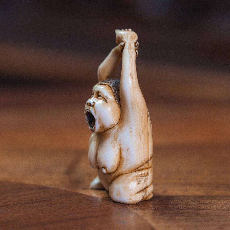 Нэцкэ отличается очень выразительной пластикой и смелой композицией. Мастер искусно передал напряжение движения, характерное положение тела, мимику лица и внутреннюю энергию образа. Несмотря на миниатюрный формат, фигура производит сильное впечатление благодаря своей динамике, редкому сюжету и ярко выраженному характеру. Светлая поверхность слоновой кости подчёркивает чистоту формы, а тщательная резьба делает предмет особенно ценным с художественной точки зрения.