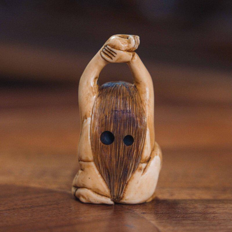 Выразительная японская нэцкэ изображает Даруму (Бодхидхарму) — легендарного основателя дзэн-буддизма, чей образ в японской культуре стал символом несгибаемой воли, духовной стойкости и способности вновь подниматься после любых испытаний. Именно с Дарумой связан один из самых известных восточных жизненных принципов: «Семь раз упади, восемь раз поднимись», воплощающий упорство, внутреннюю силу и верность своему пути.