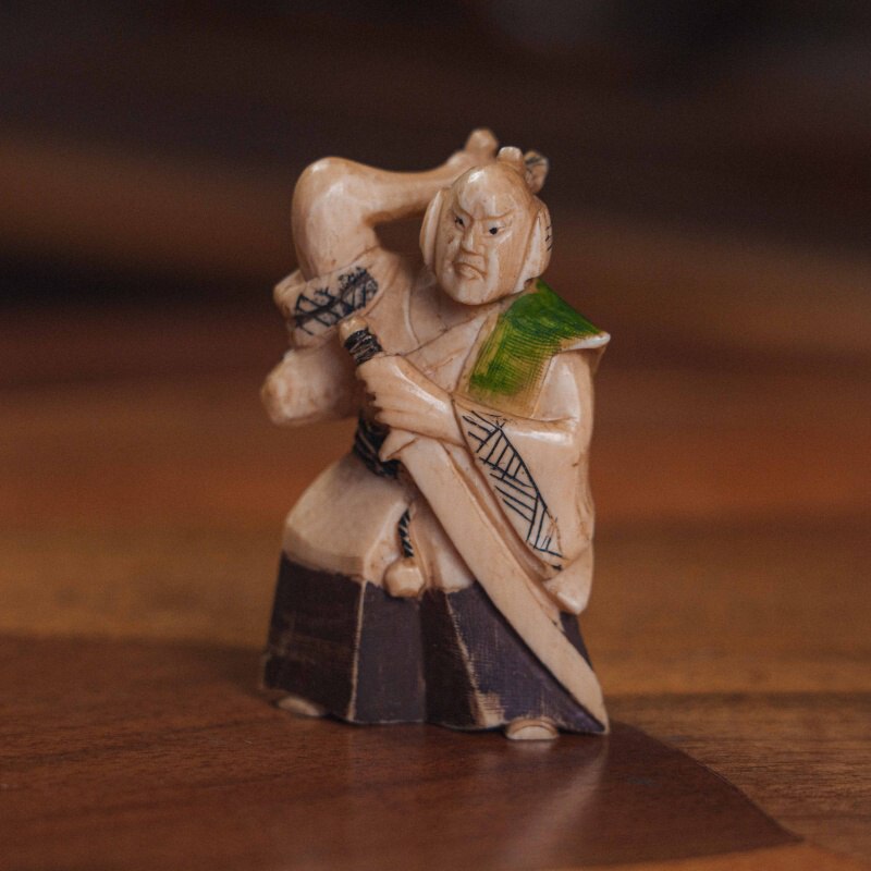 Миниатюры с образом самурая занимают особое место в японском декоративно-прикладном искусстве, поскольку воплощают идеалы силы духа, стойкости и внутреннего равновесия. Такая нэцкэ может рассматриваться не только как изящный антикварный предмет, но и как символ мужества, самообладания и верности выбранному пути.