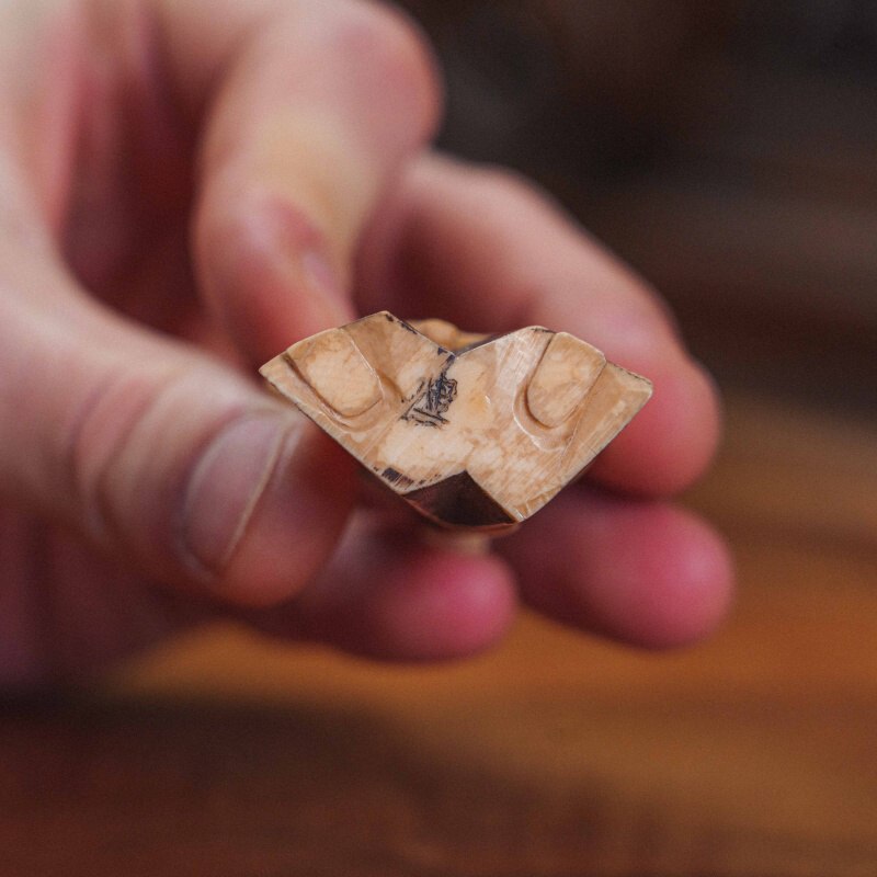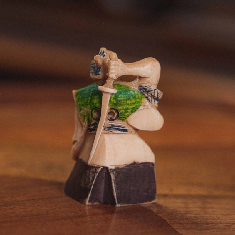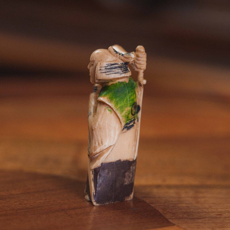 Нэцкэ отличается выразительной пластикой и тщательной проработкой деталей. Резьба подчёркивает складки одежды, элементы вооружения и характерный облик персонажа, а лёгкая роспись делает образ ещё более живым и декоративно завершённым. Подобные изображения особенно ценятся за яркий национальный характер, узнаваемую символику и художественную выразительность.