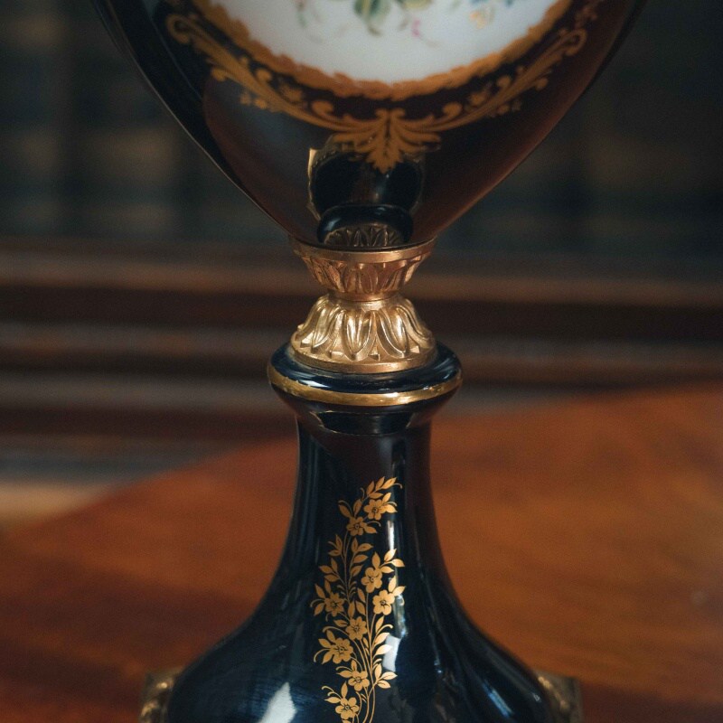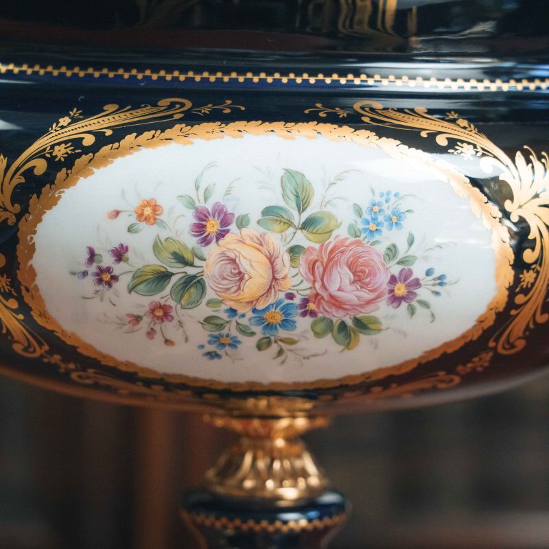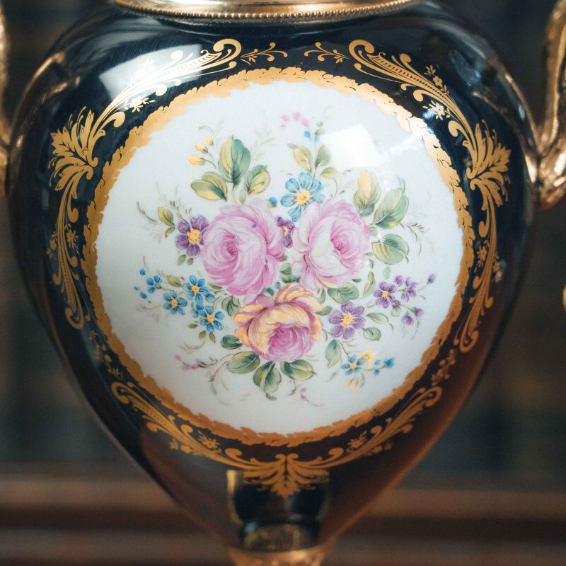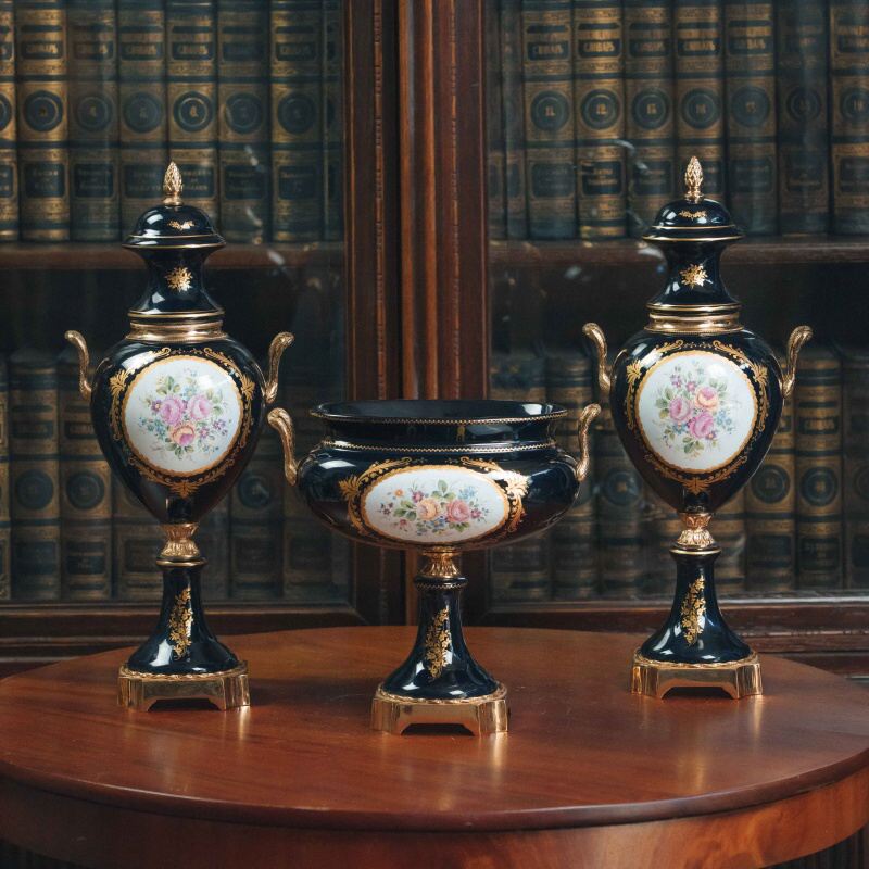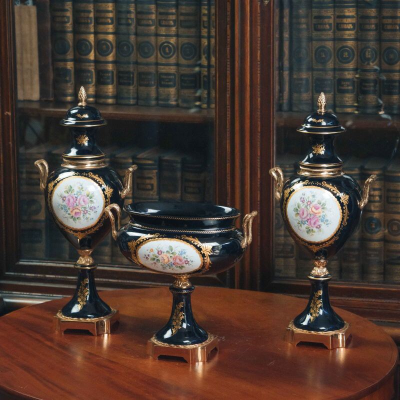 Элегантный гарнитур из трех ваз в дворцовом стиле. Все предметы изготовлены из фарфора и превосходно дополнены литыми деталями из бронза. Декоративное оформление представлено гармоничным сочетанием цветочных композиций в обрамлении позолоченной рамки на темно-синем кобальтовом фоне. На предметах имеются марки известной французской фарфоровой мануфактуры в Лиможе.