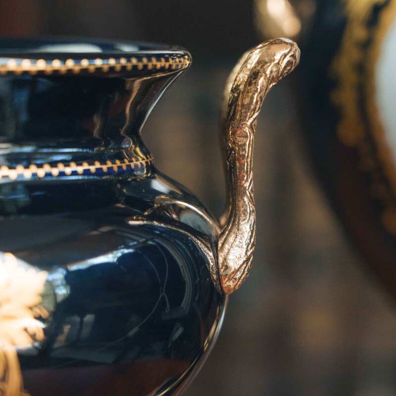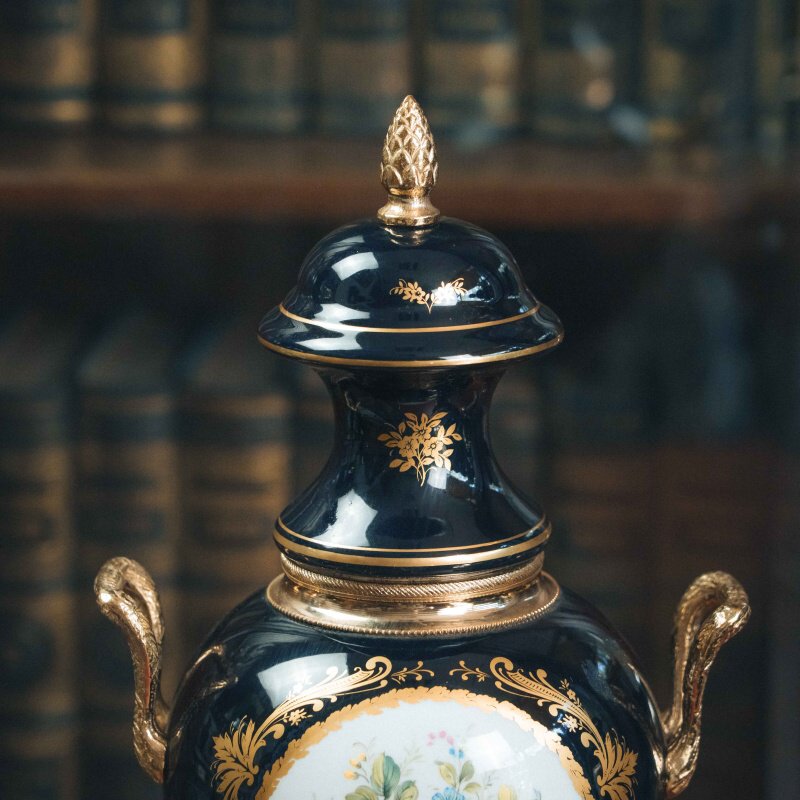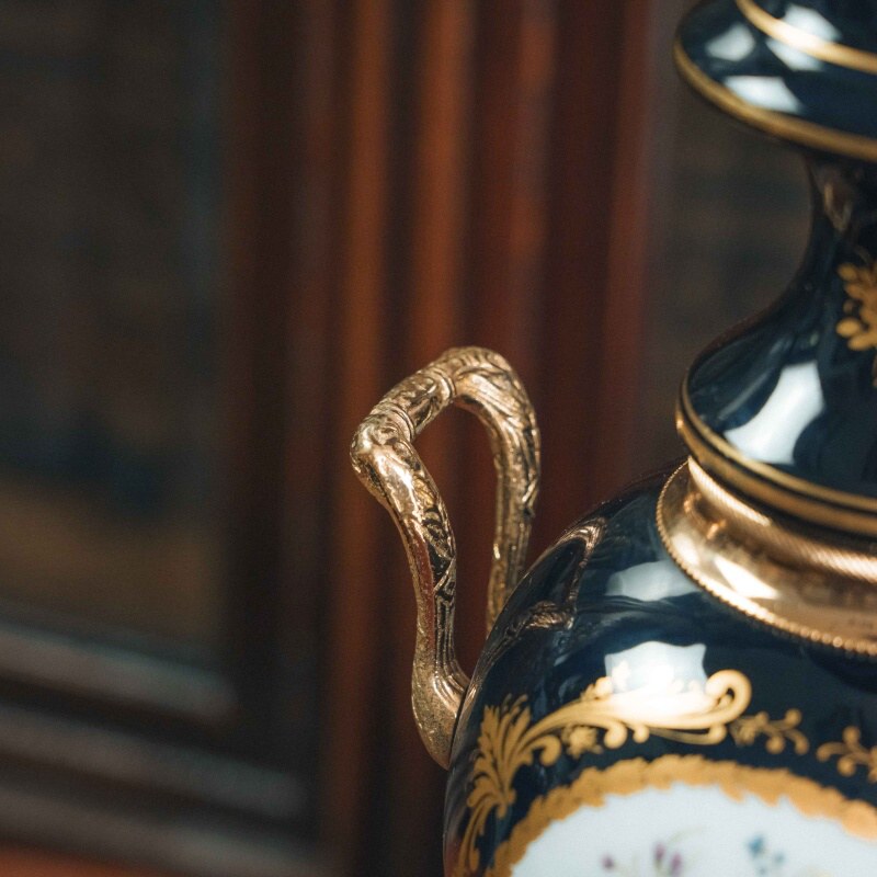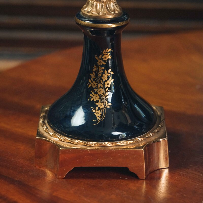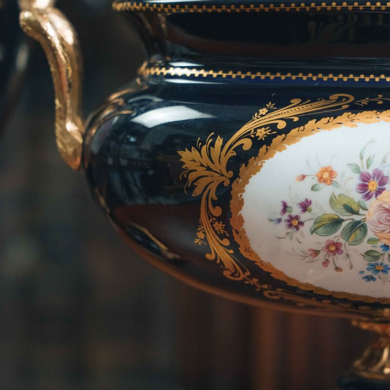 Элегантный гарнитур из трех ваз в дворцовом стиле. Все предметы изготовлены из фарфора и превосходно дополнены литыми деталями из бронза. Декоративное оформление представлено гармоничным сочетанием цветочных композиций в обрамлении позолоченной рамки на темно-синем кобальтовом фоне. На предметах имеются марки известной французской фарфоровой мануфактуры в Лиможе.