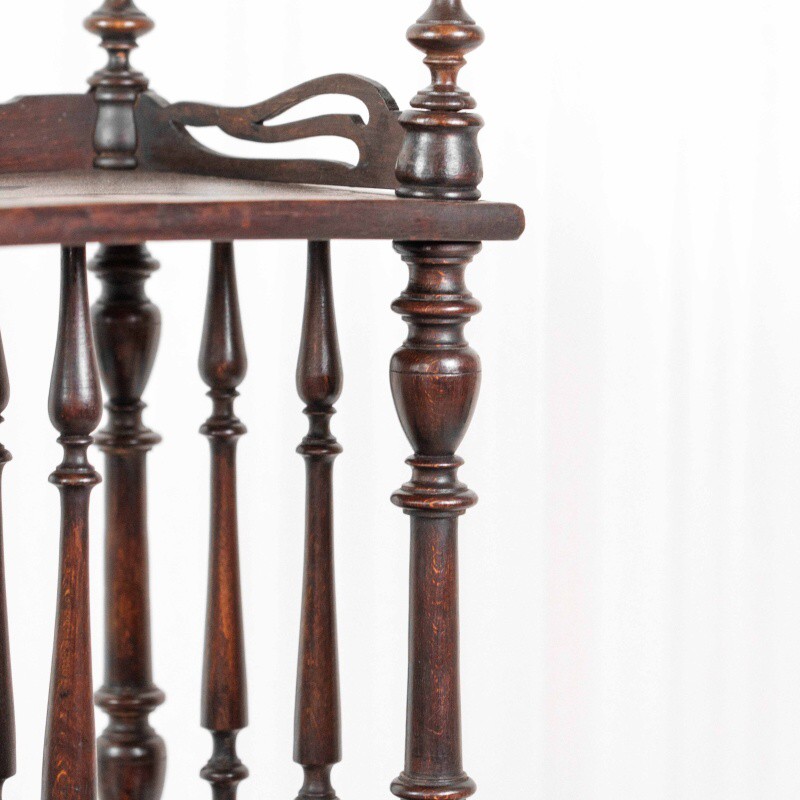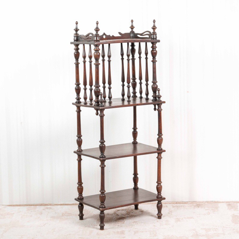 Антикварная этажерка в викторианском стиле — изящный предмет мебели конца XIX – начала XX века, выполненный из массива красного дерева. Она сочетает функциональность и декоративность, являясь типичным примером английского мебельного искусства той эпохи.