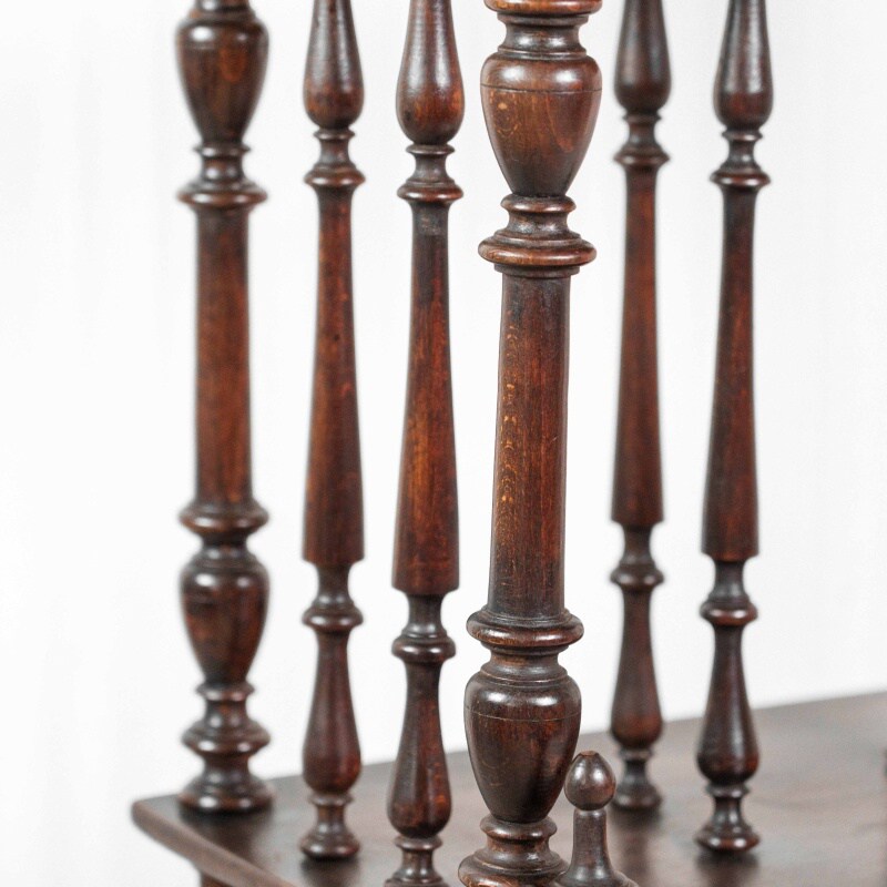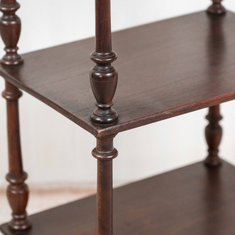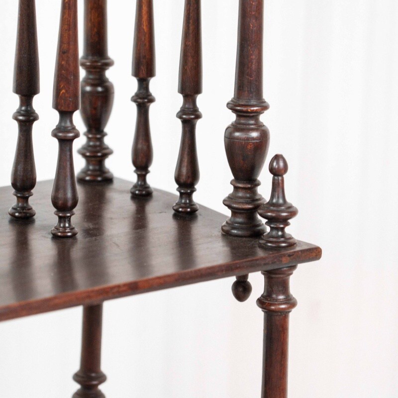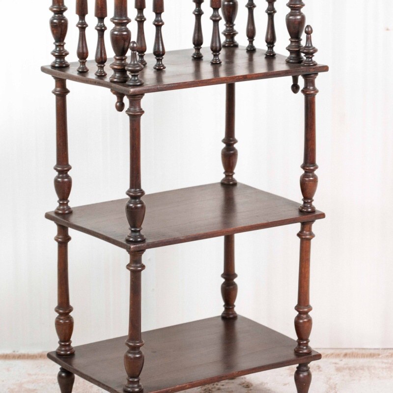 Конструкция состоит из четырёх открытых ярусов, соединённых точёными балясинами с выразительным профилем. Верхний ярус оформлен ажурными декоративными элементами и миниатюрными шпилями, что придаёт изделию архитектурную лёгкость и изысканность. Каждая полка отполирована до мягкого блеска, подчёркивающего насыщенный оттенок древесины и благородную патину времени.