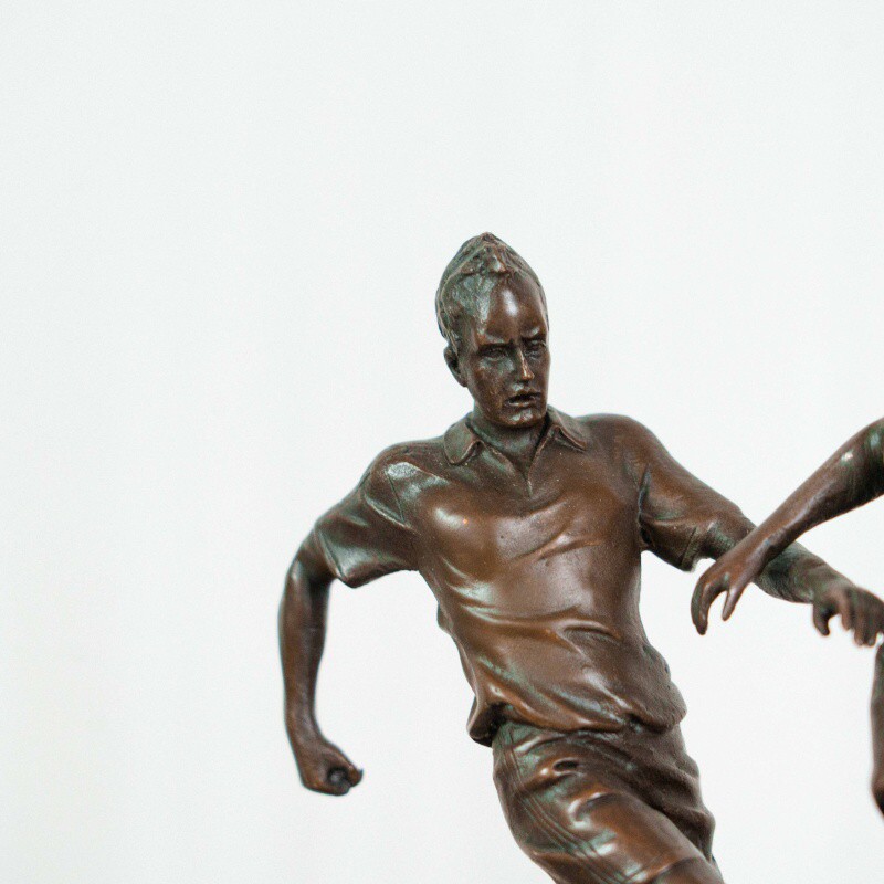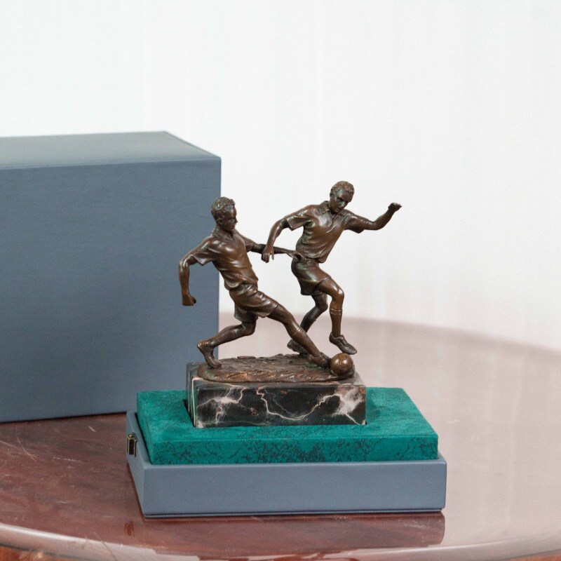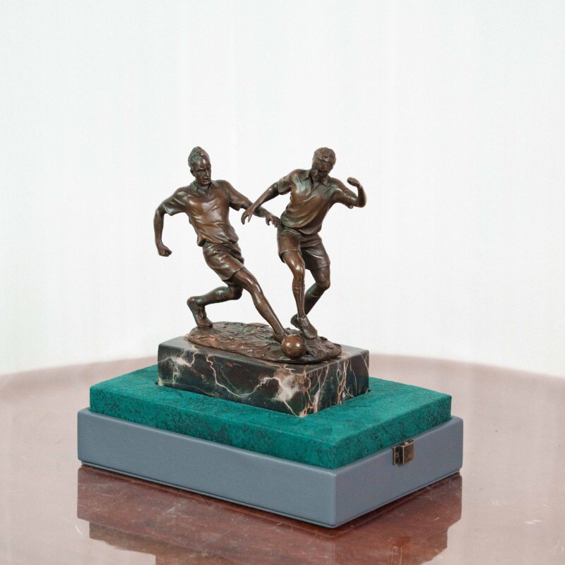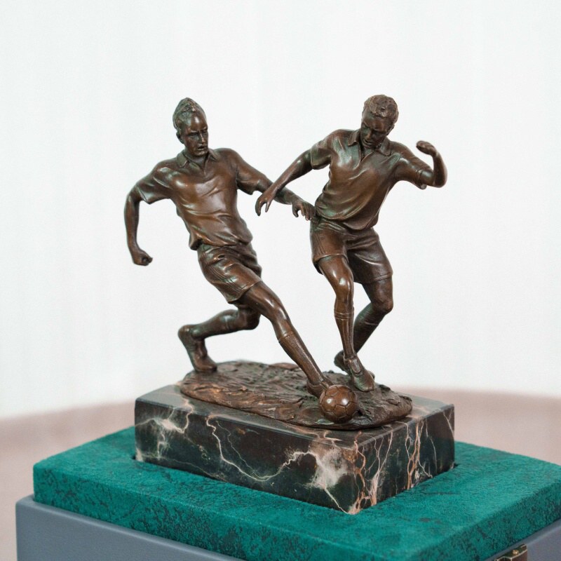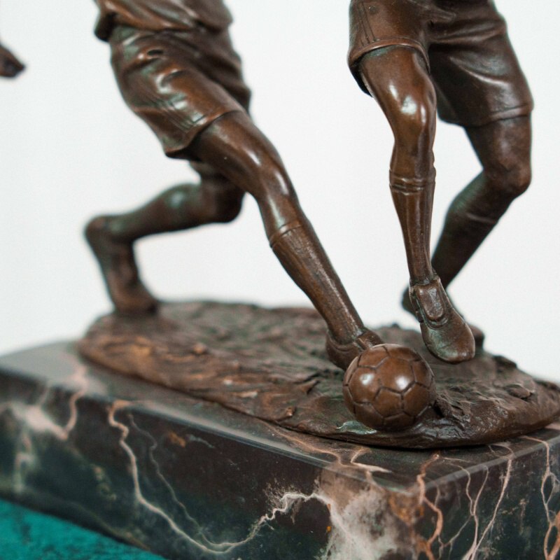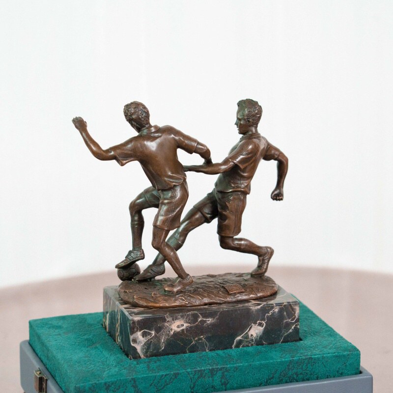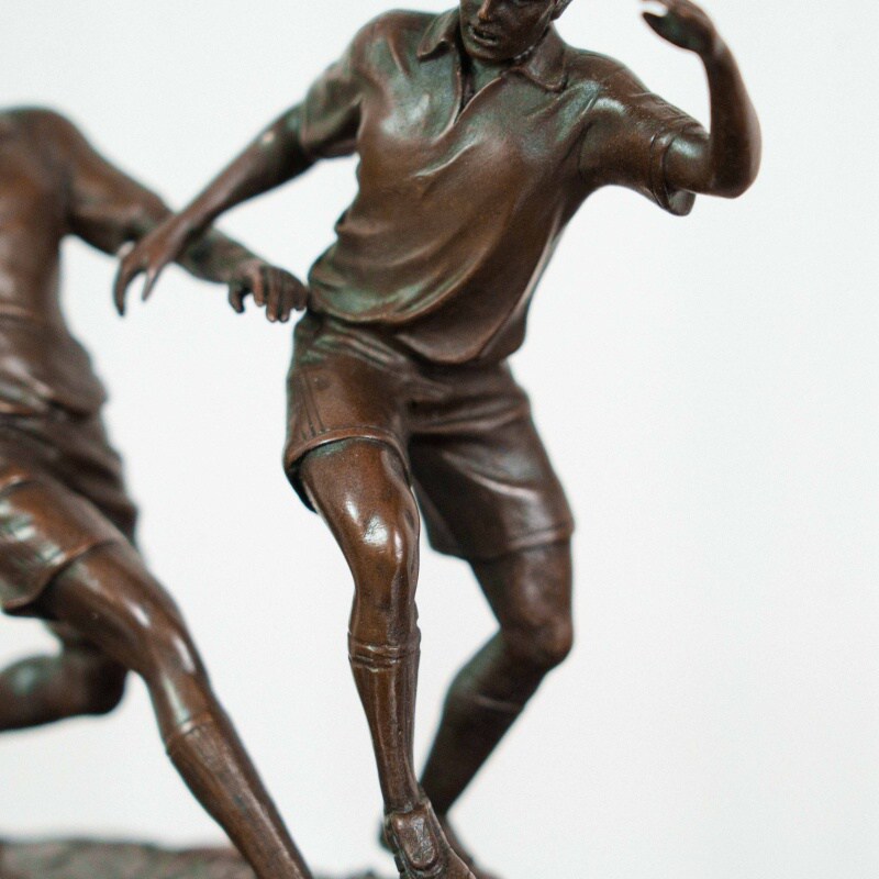 Бронзовая скульптура изображает двух футболистов в динамике игры — в момент острой борьбы за мяч. Композиция наполнена энергией и движением: тела спортсменов напряжены, мышцы чётко прорисованы, а их позы передают мгновение соперничества и спортивного азарта.